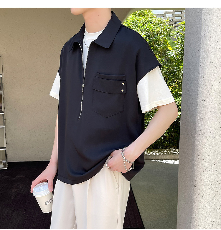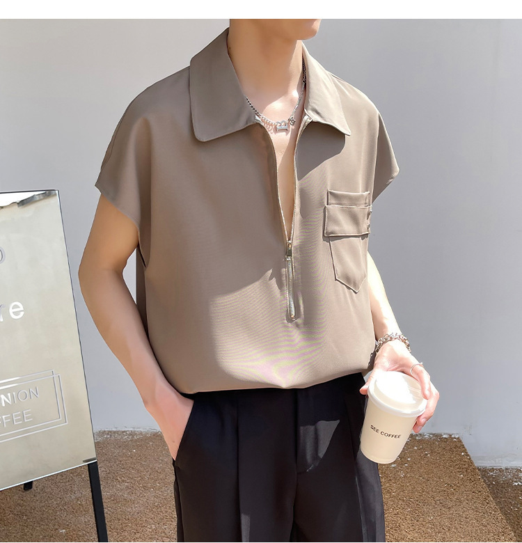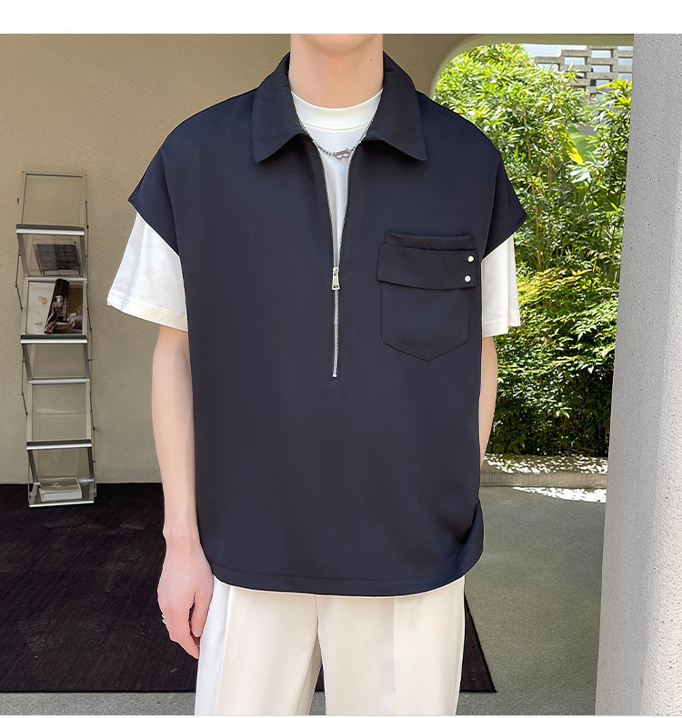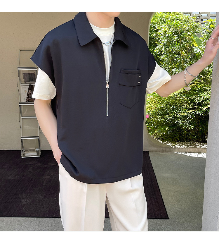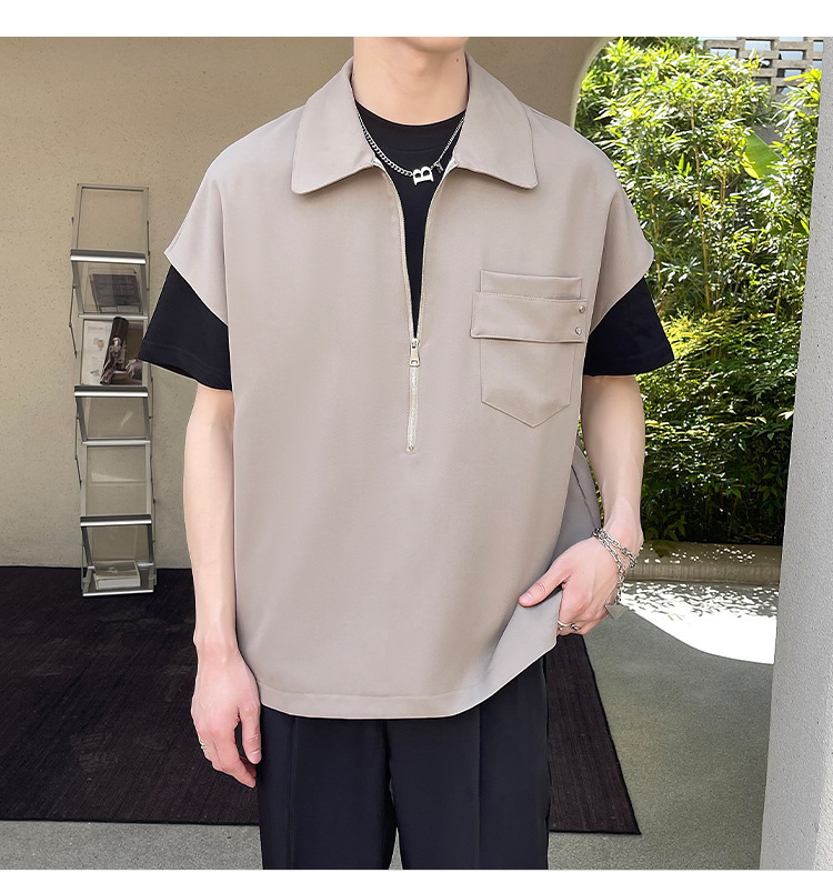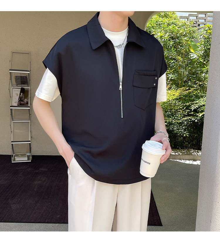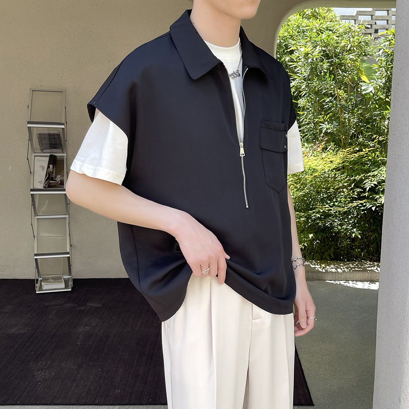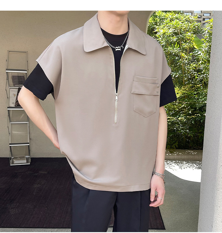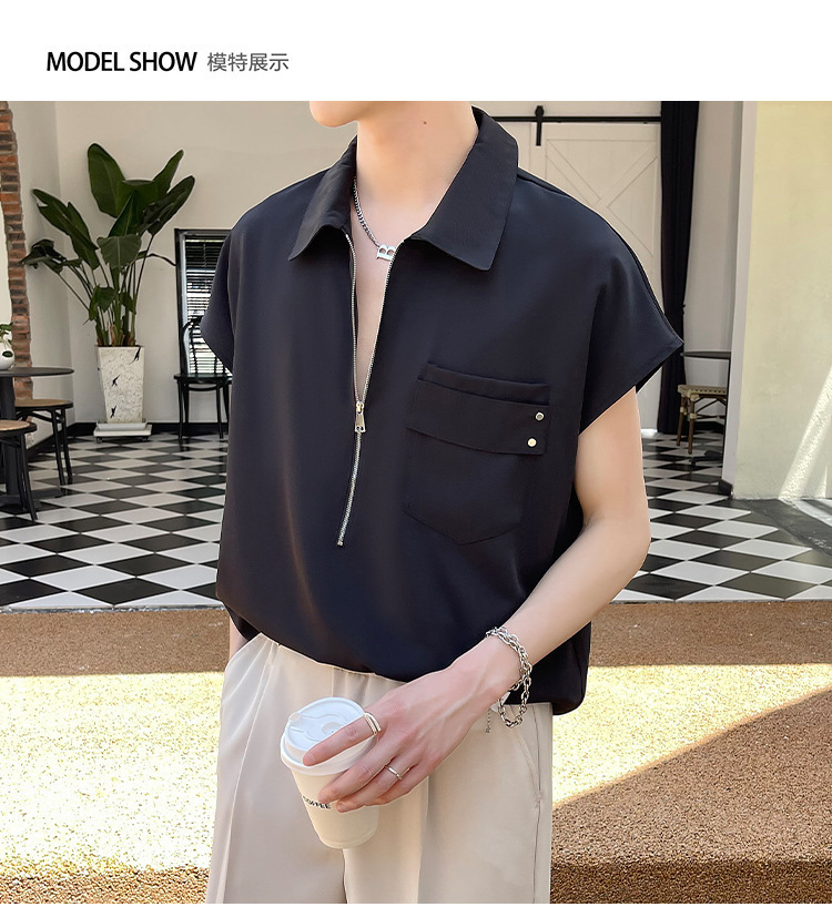 여름 반 지퍼 디자인 풀오버 선박 소매 셔츠 남성용 잘 생긴 어깨 캐주얼 아이스 실크 라이트 럭셔리 헤어 스타일리스트스토어 가기