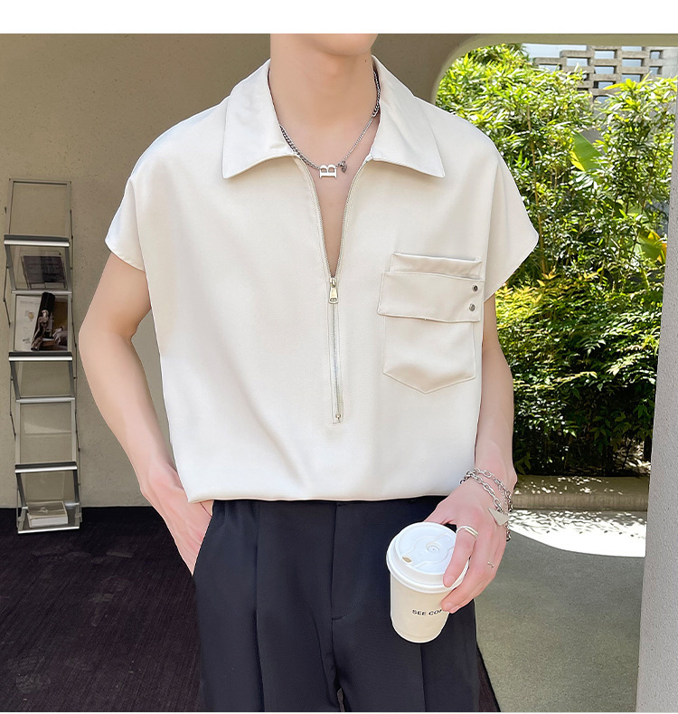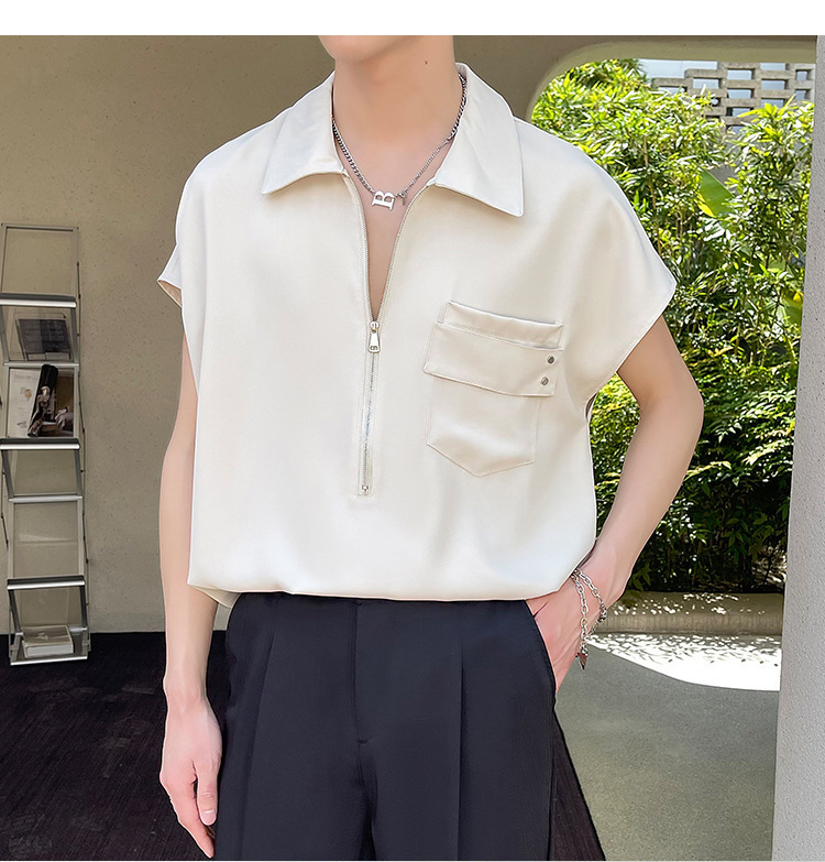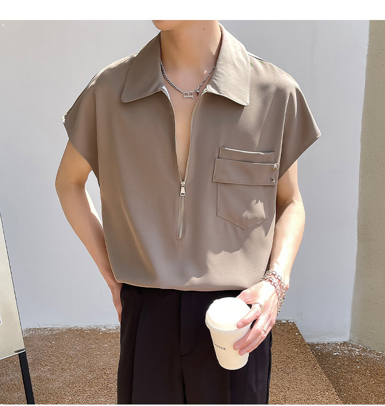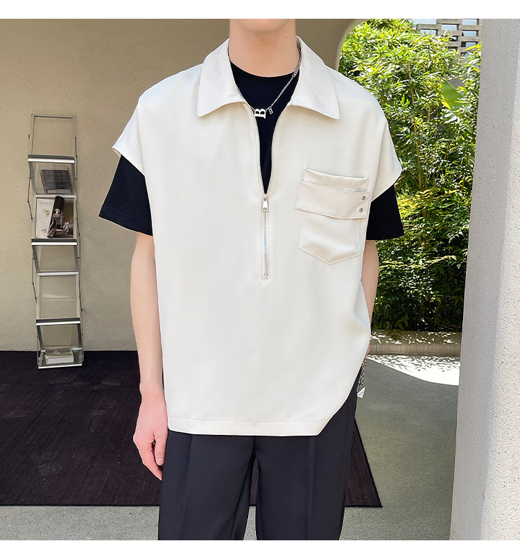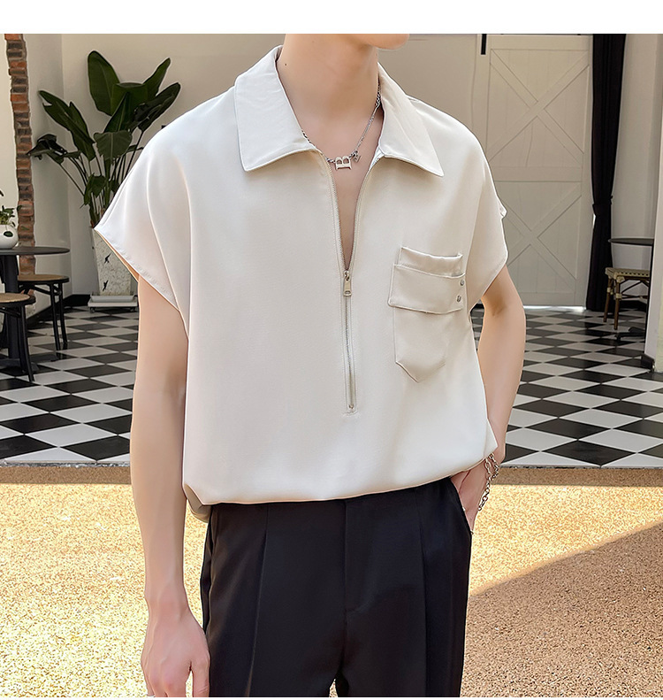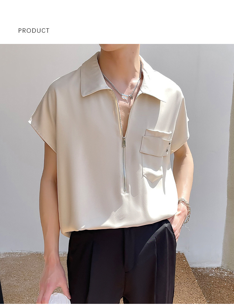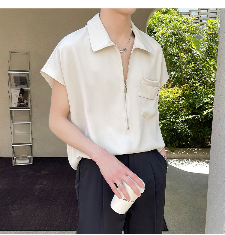 여름 반 지퍼 디자인 풀오버 선박 소매 셔츠 남성용 잘 생긴 어깨 캐주얼 아이스 실크 라이트 럭셔리 헤어 스타일리스트