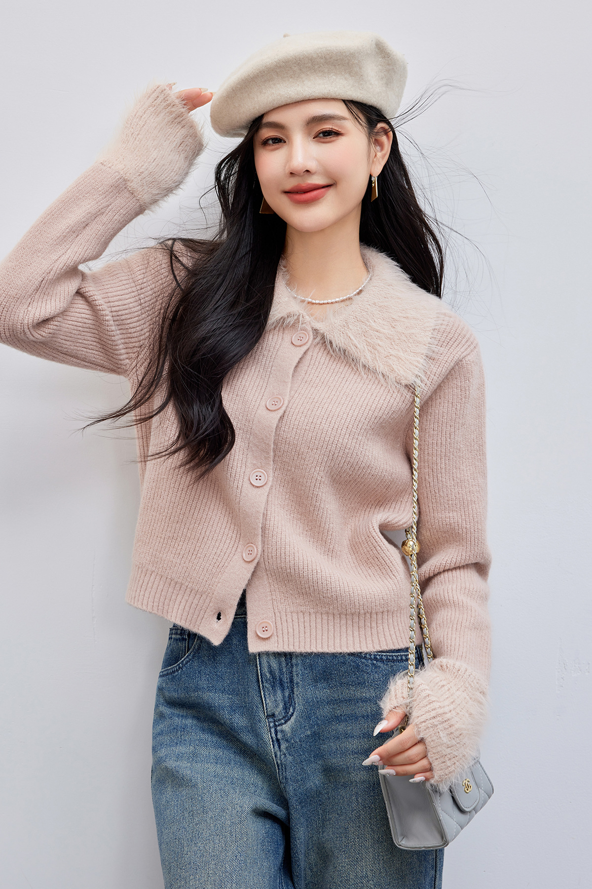 복숭아 복숭아 롤 핑크 스웨터 여성 2024 가을 및 겨울 새로운 부드러운 스타일 폴로 목 니트 카디건스토어 가기