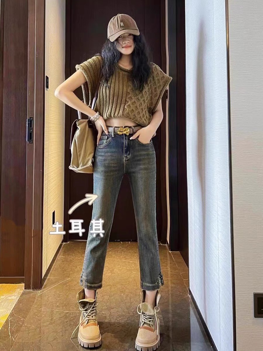기모 두꺼운 벨트 가을과 겨울 빈티지 데님 연기 튜브 바지 여성의 2024 겨울 짧은 9 점 스트레이트 바지스토어 가기