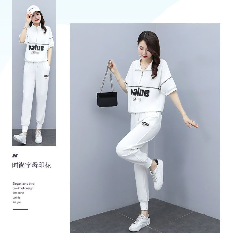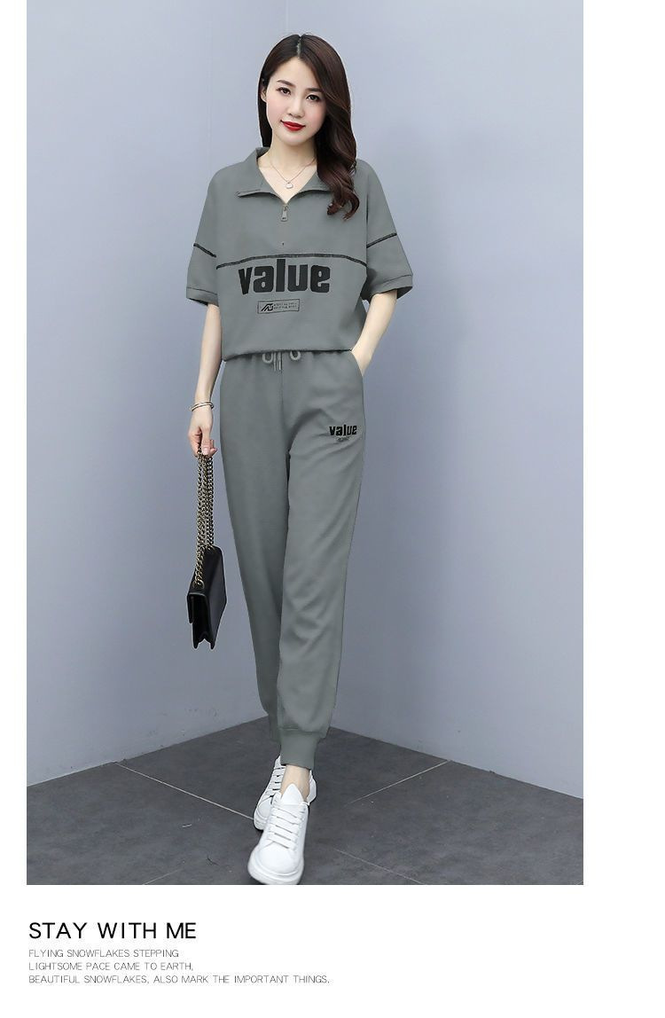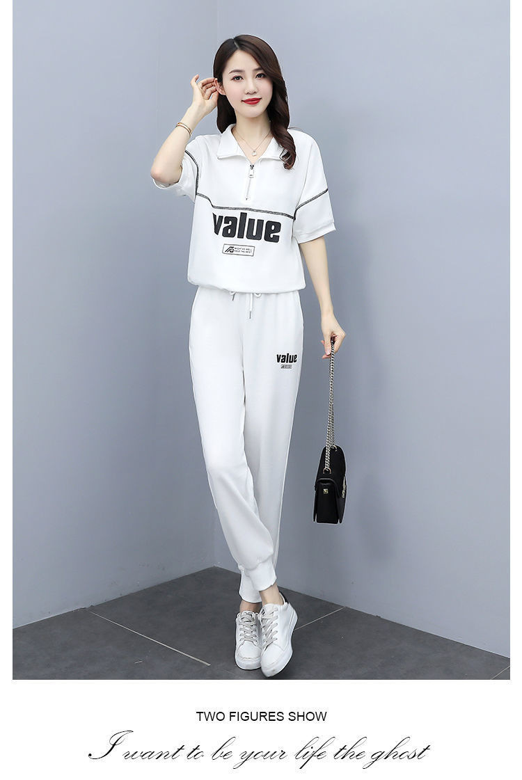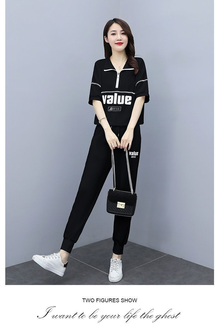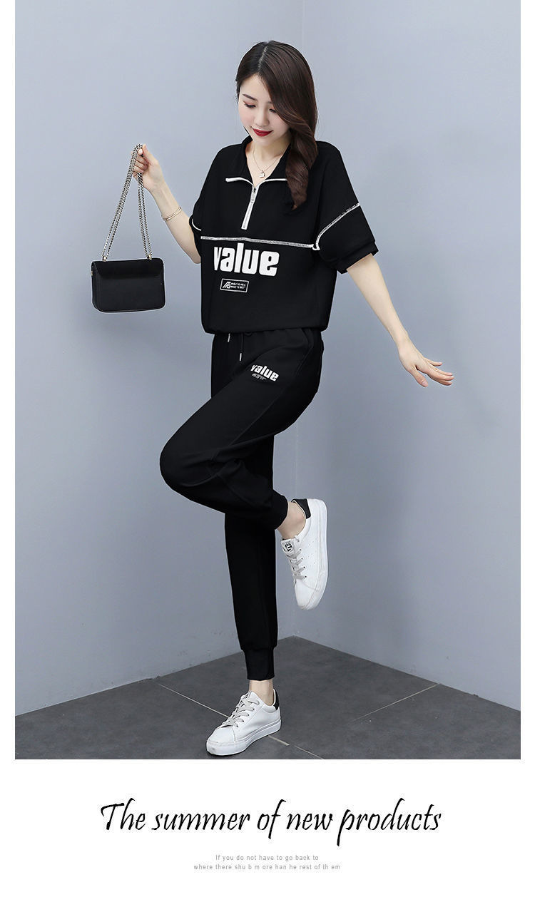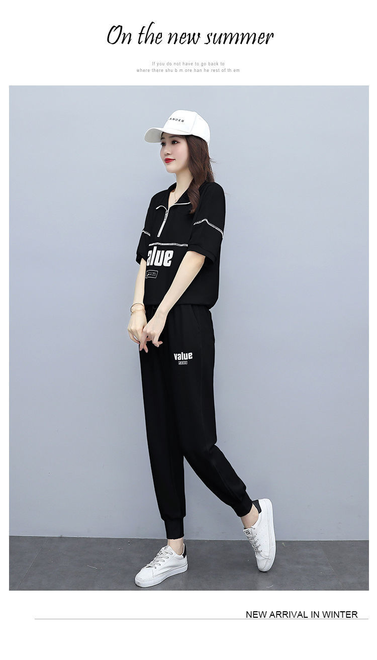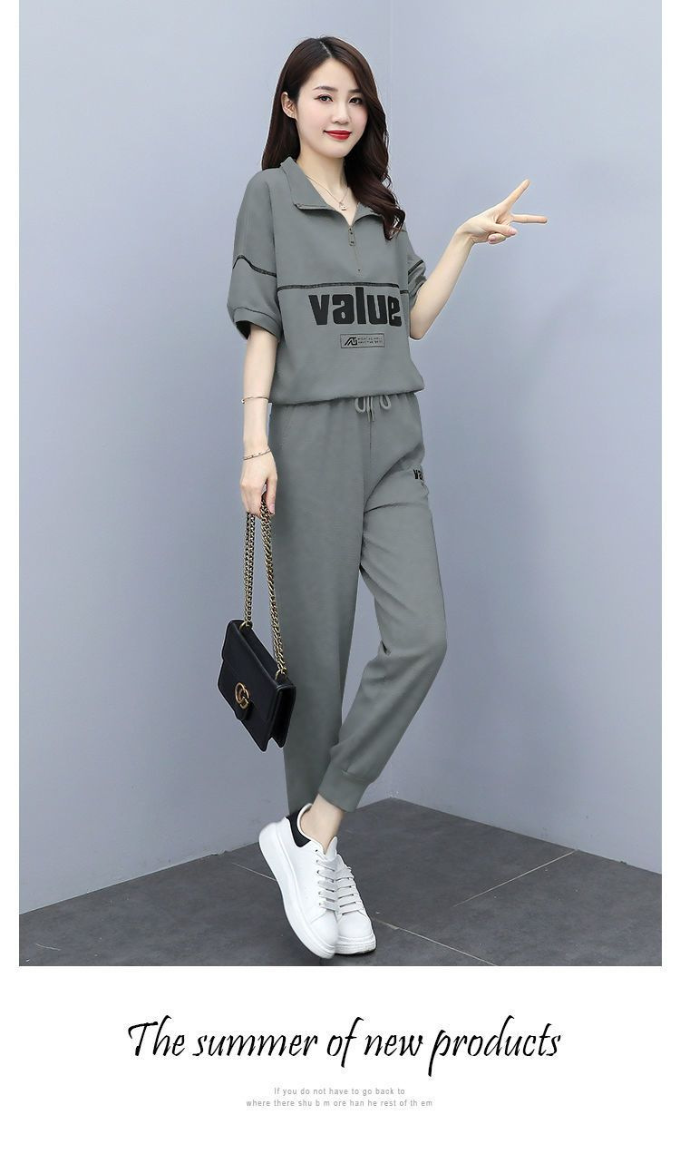 패션 캐주얼 세트 여성 2024 년 여름 새 한국식 반팔 자른 할란 팬츠 플러스 사이즈 투피스 세트