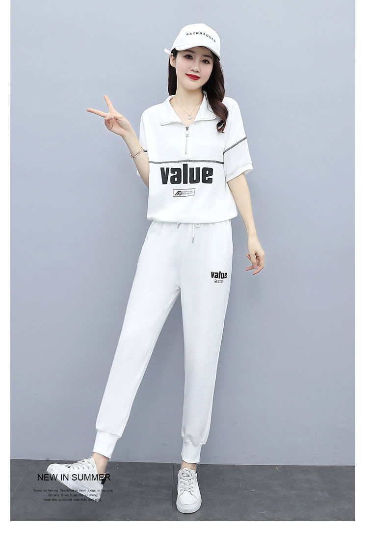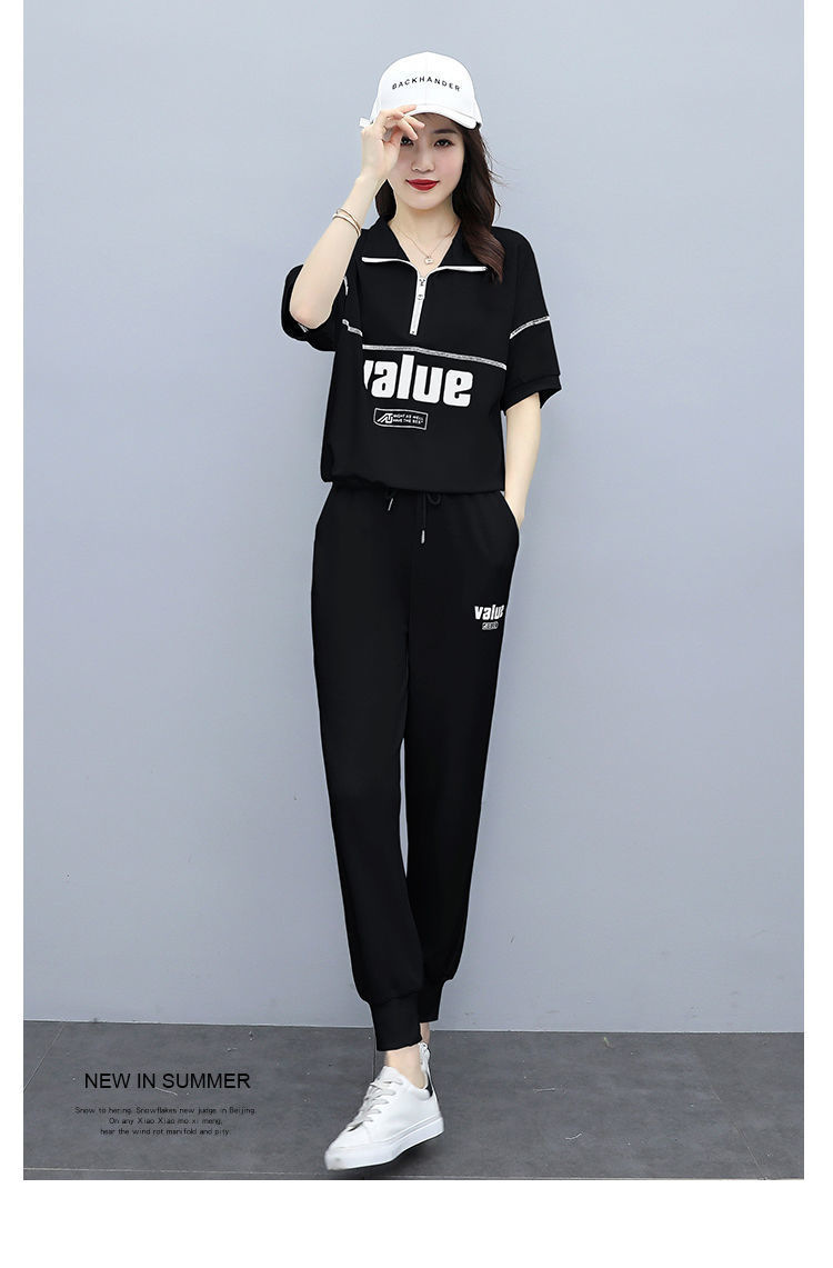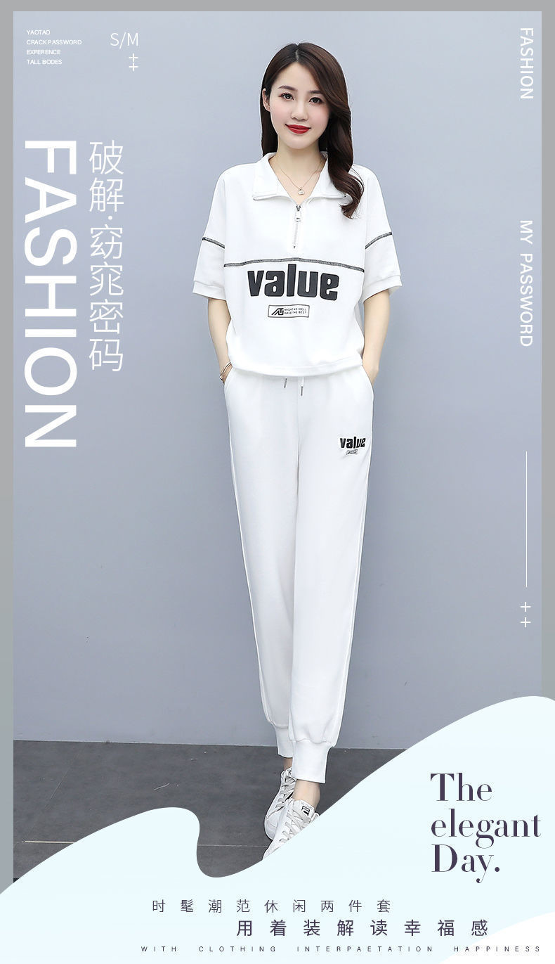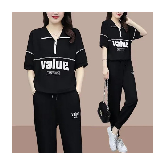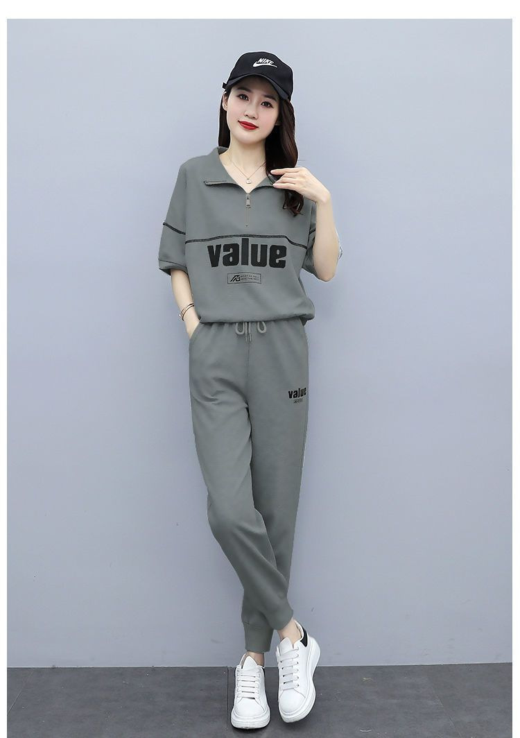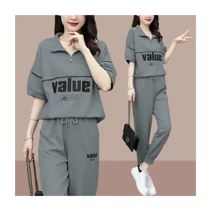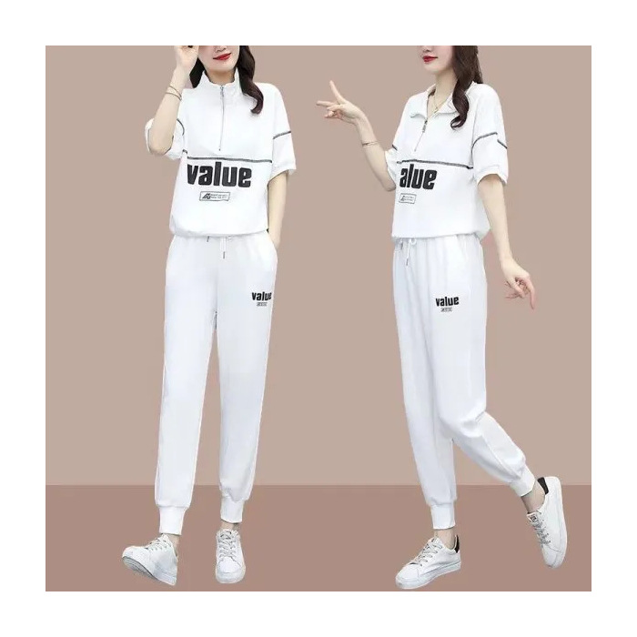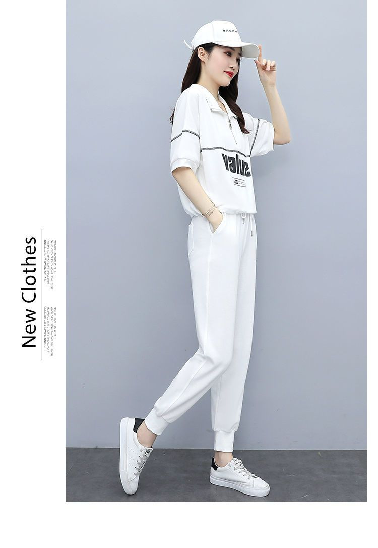 패션 캐주얼 세트 여성 2024 년 여름 새 한국식 반팔 자른 할란 팬츠 플러스 사이즈 투피스 세트