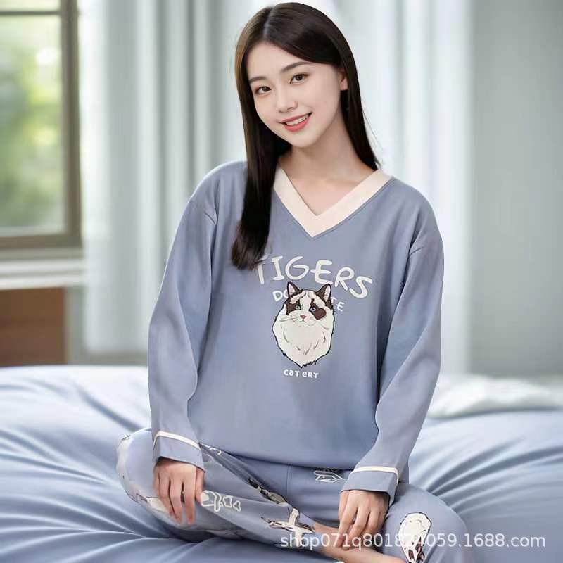 여성 V 넥 긴 소매 잠옷 여성의 봄과 가을 새로운 만화 귀여운 캐주얼 얇은 풀오버 홈 의류 세트 여성스토어 가기
