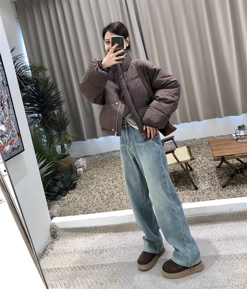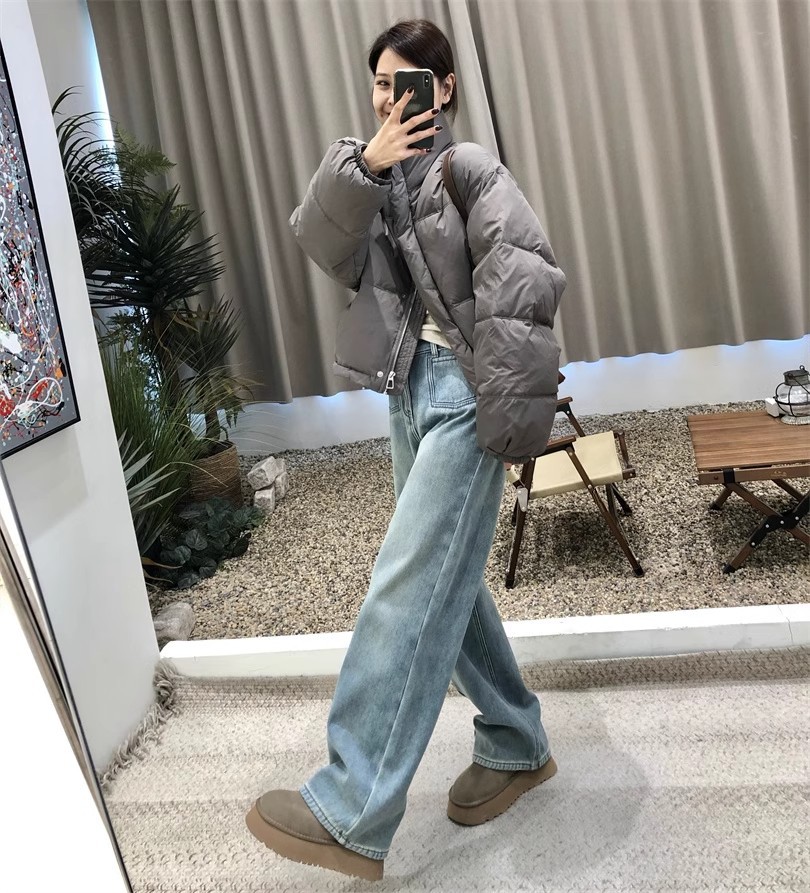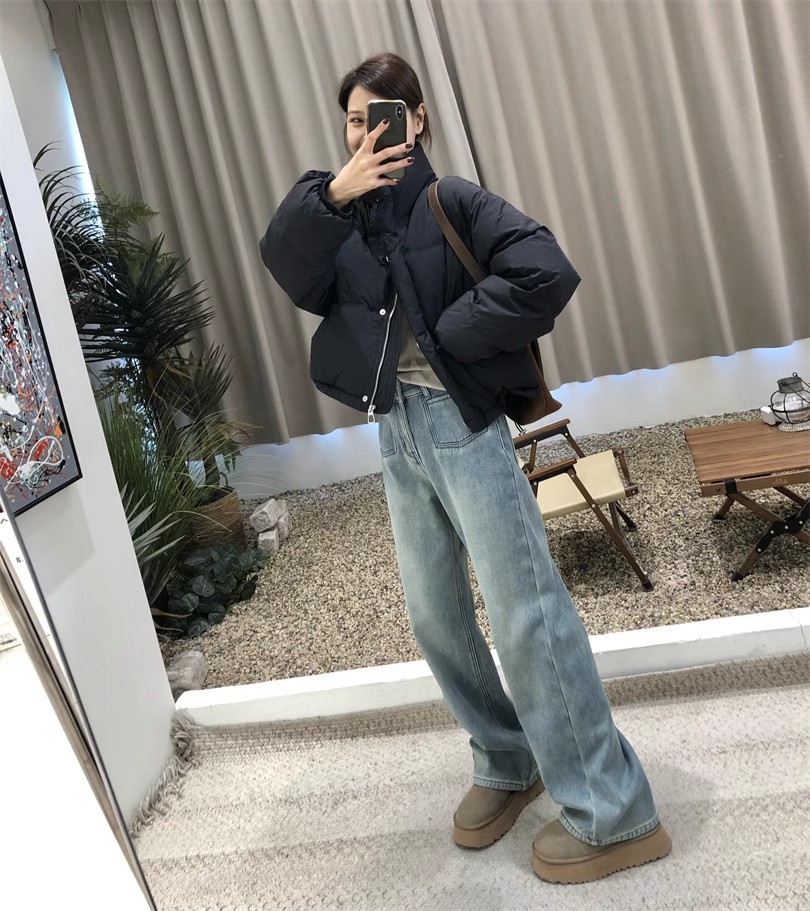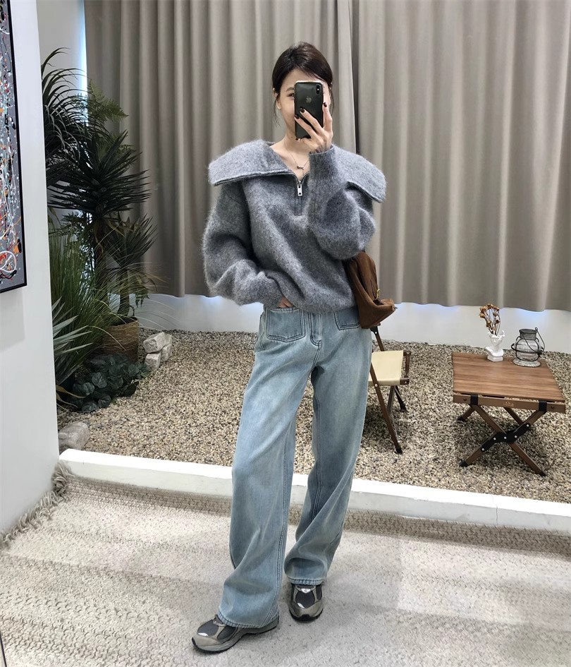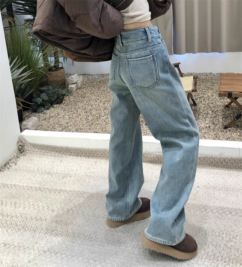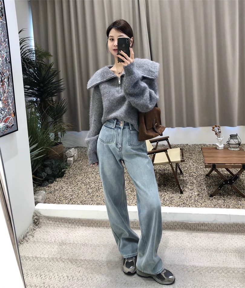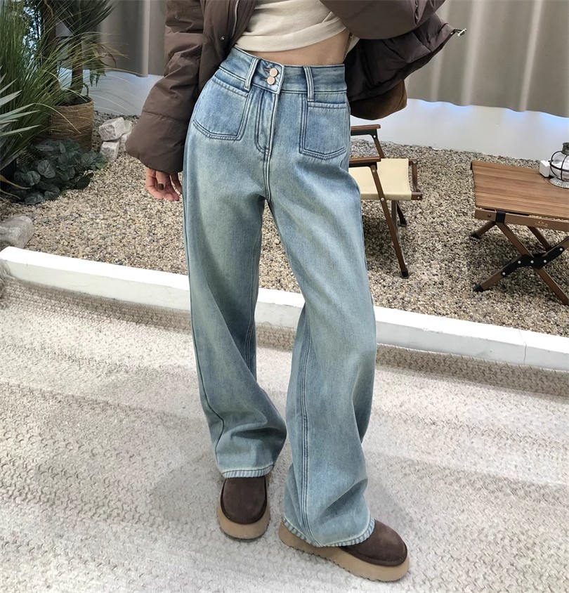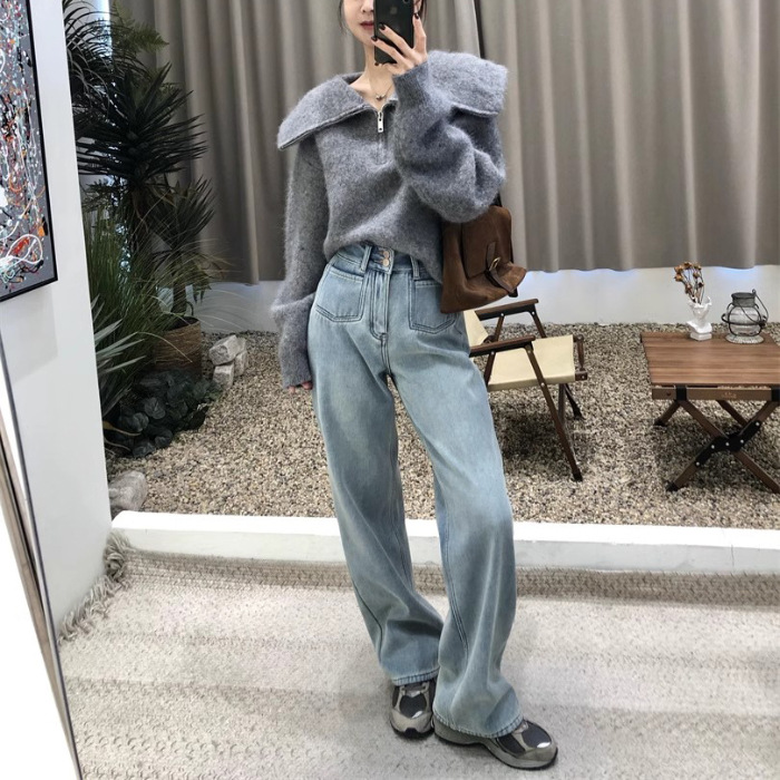 2024 봄 새로운 넓은 다리 높은 허리 두 배 버클 청바지 여성 유행 느슨한 슬리밍 간단한 올매치 스트레이트 다리 바지스토어 가기