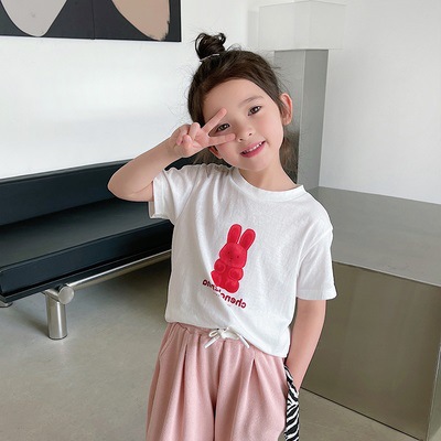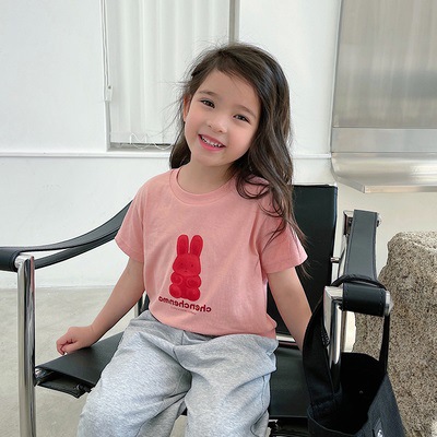 2024 여름 새로운 소녀 외국 스타일 QQ 토끼 둥근 목 만화 짧은 소매 티셔츠 어린이 캐주얼 올 매치 단색 탑스토어 가기