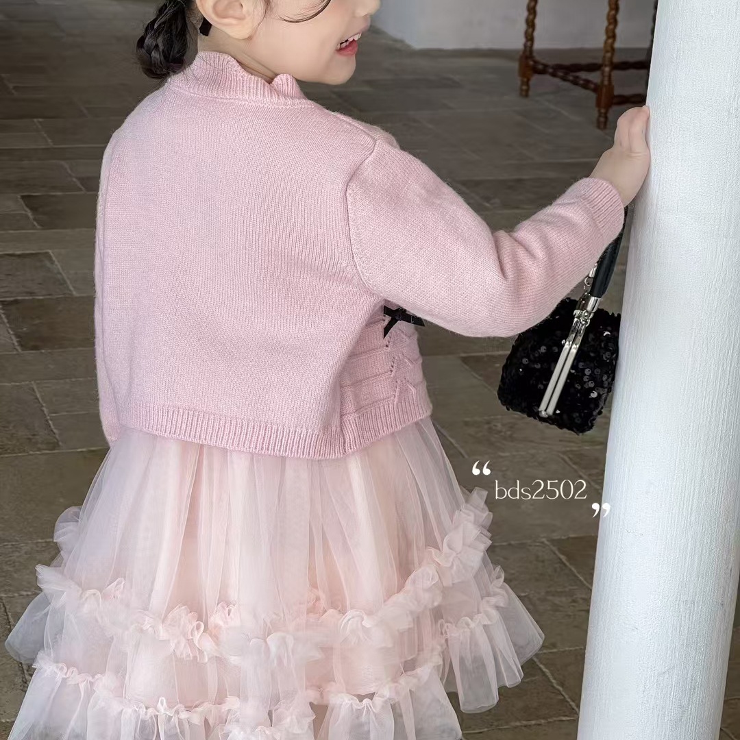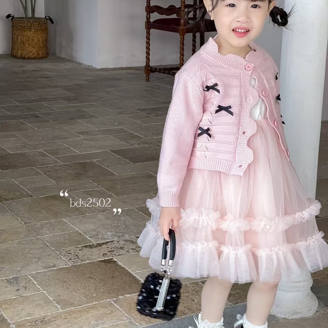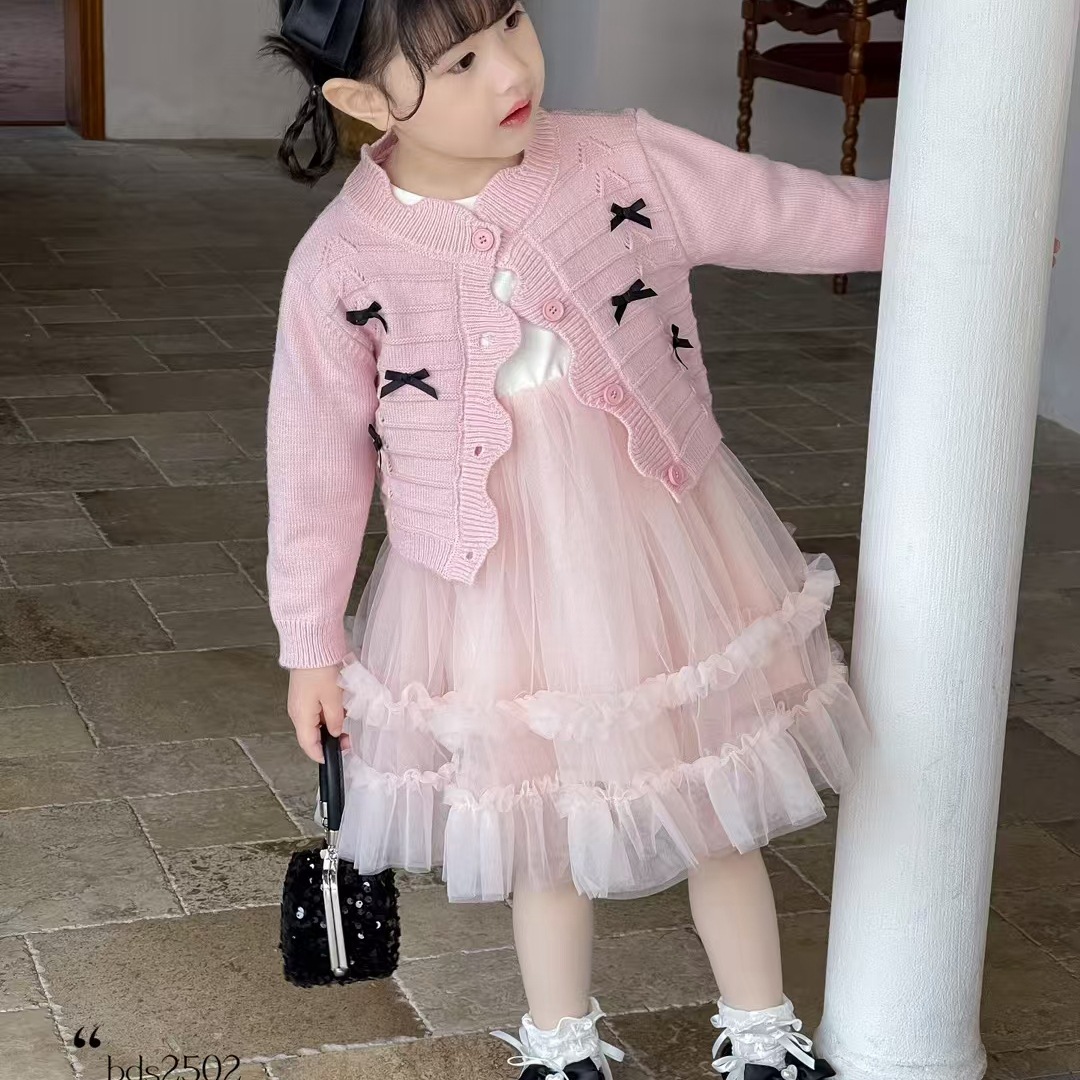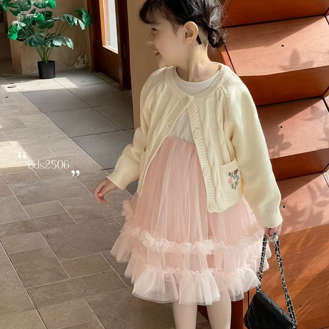 2025女童连衣裙子春季连衣裙两件套童装布袋开衫香风外套针织衫