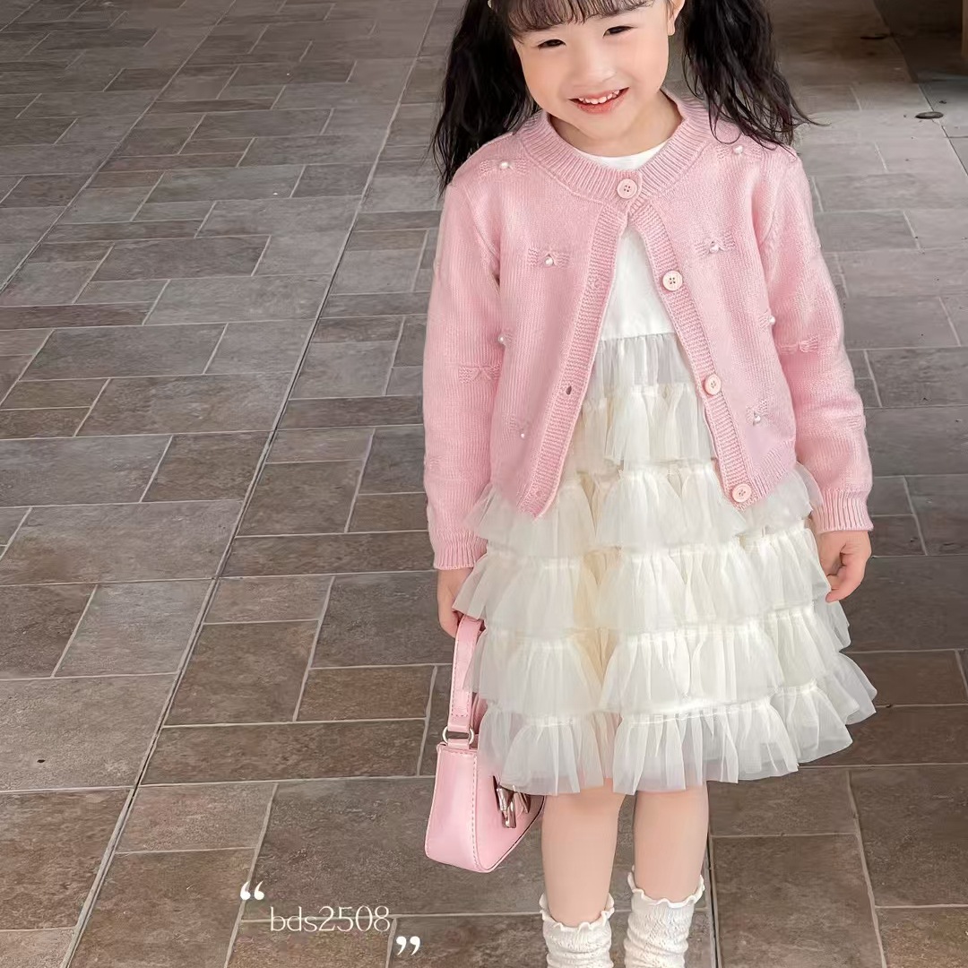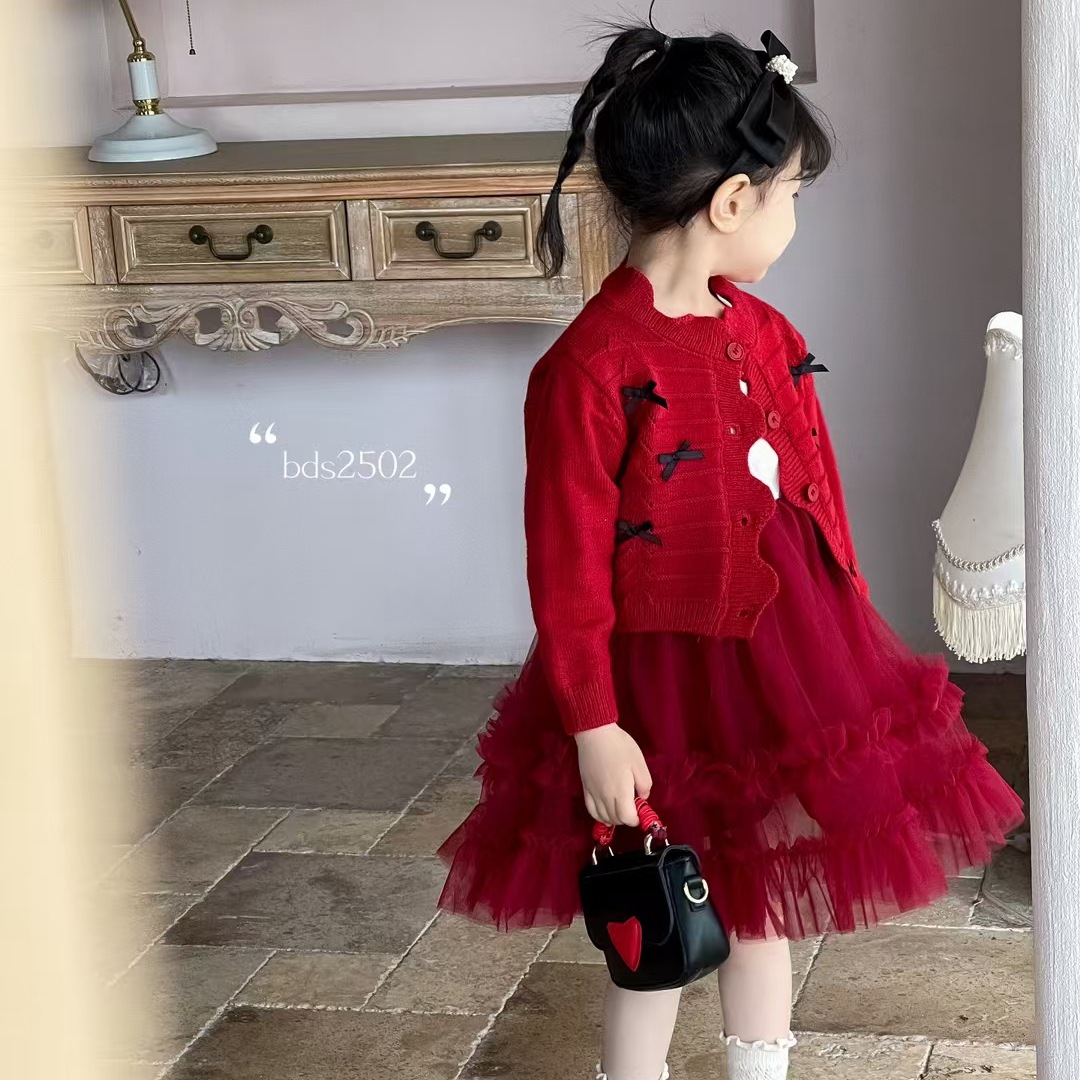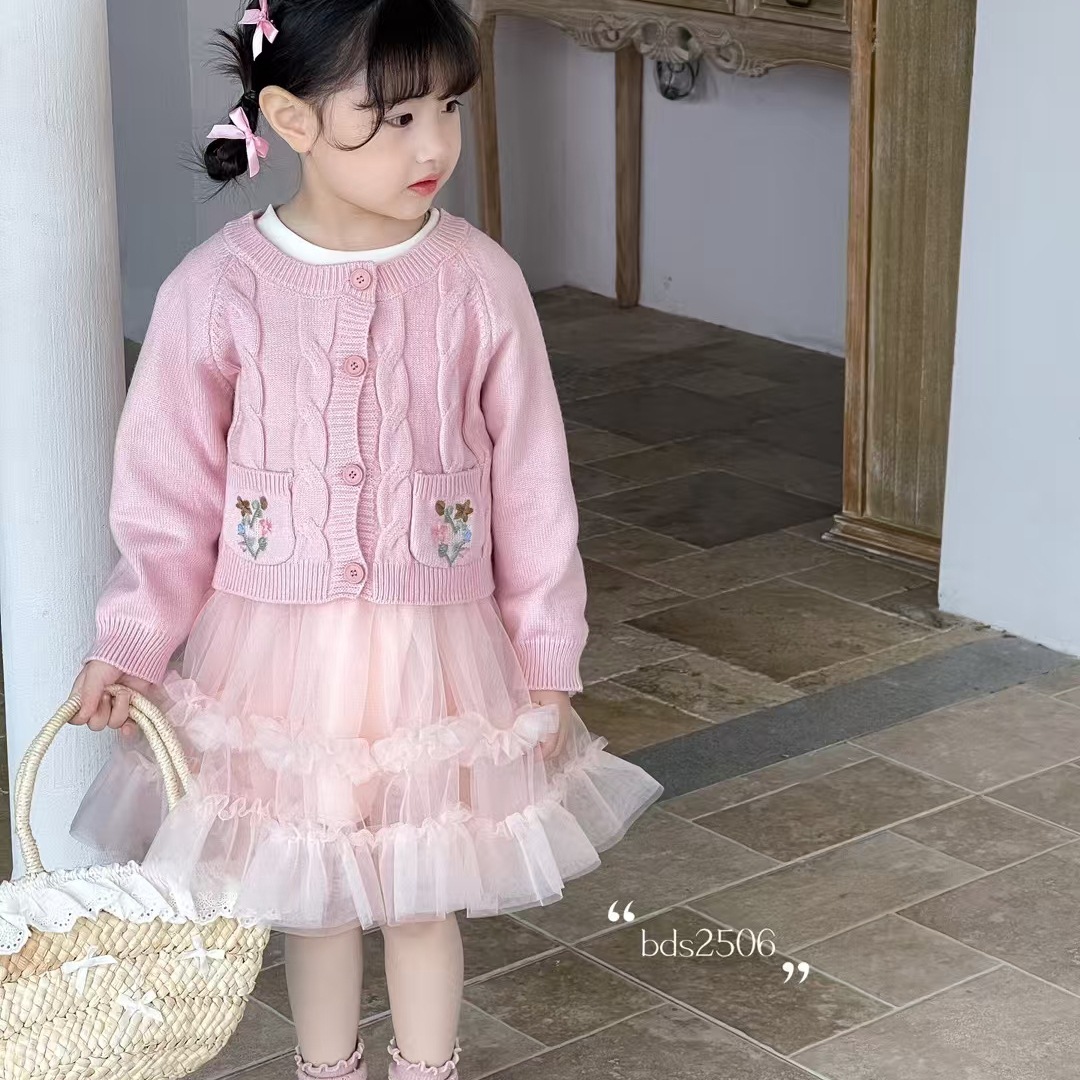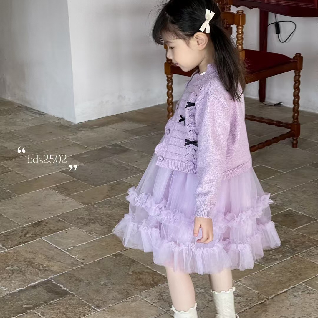 2025女童连衣裙子春季连衣裙两件套童装布袋开衫香风外套针织衫