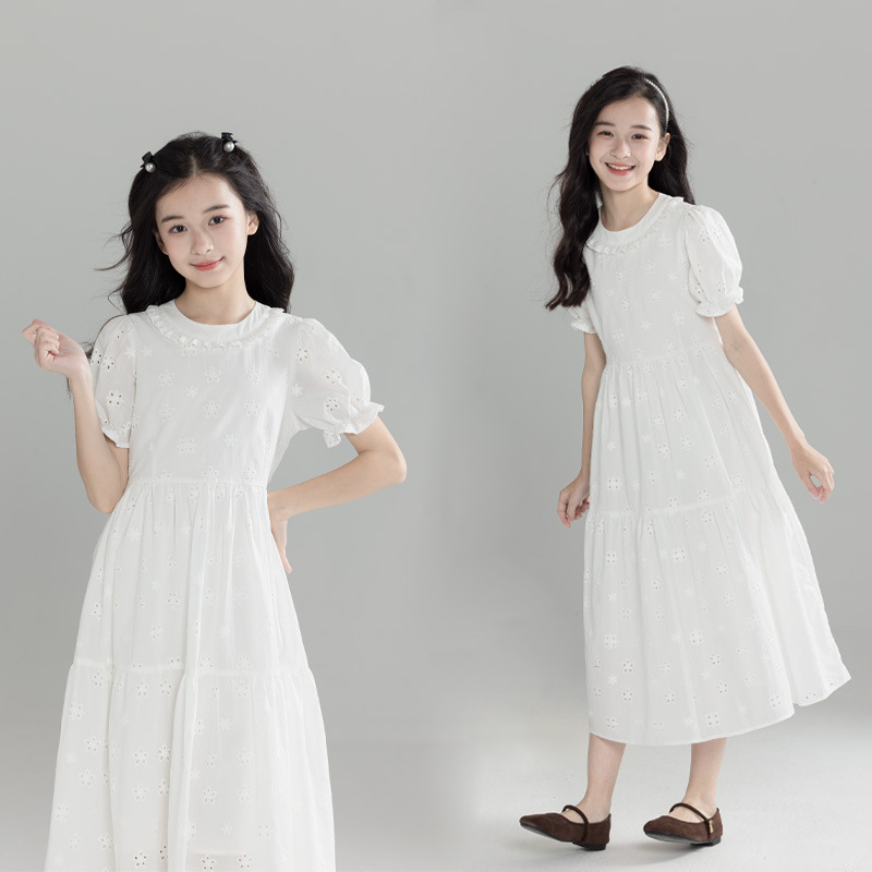 여자 원피스 2025 여름 달콤한 화이트 레이스 귀 크루 넥 퍼프 슬리브 공주 원피스 중학생 화이트 원피스스토어 가기