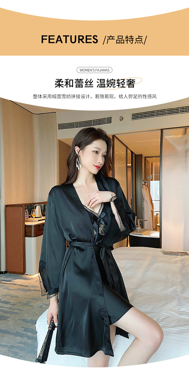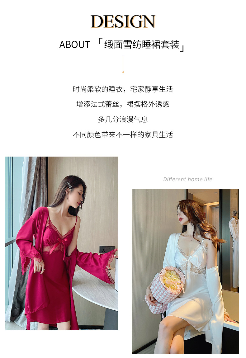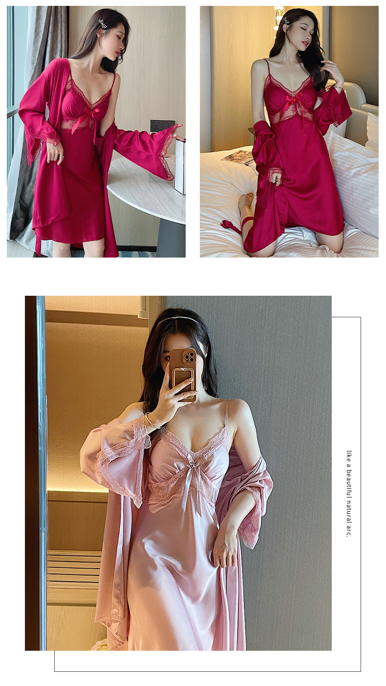 2024 봄 패션 투피스 새틴 쉬폰 여성 레이스 트림 긴 소매 가운 슬립 홈웨어 잠옷스토어 가기