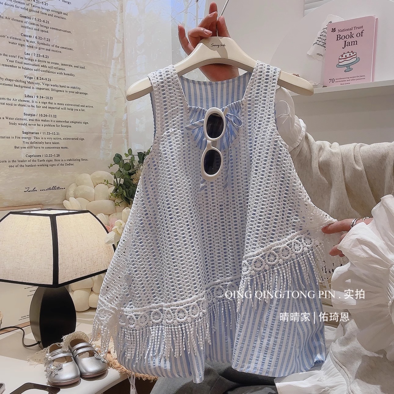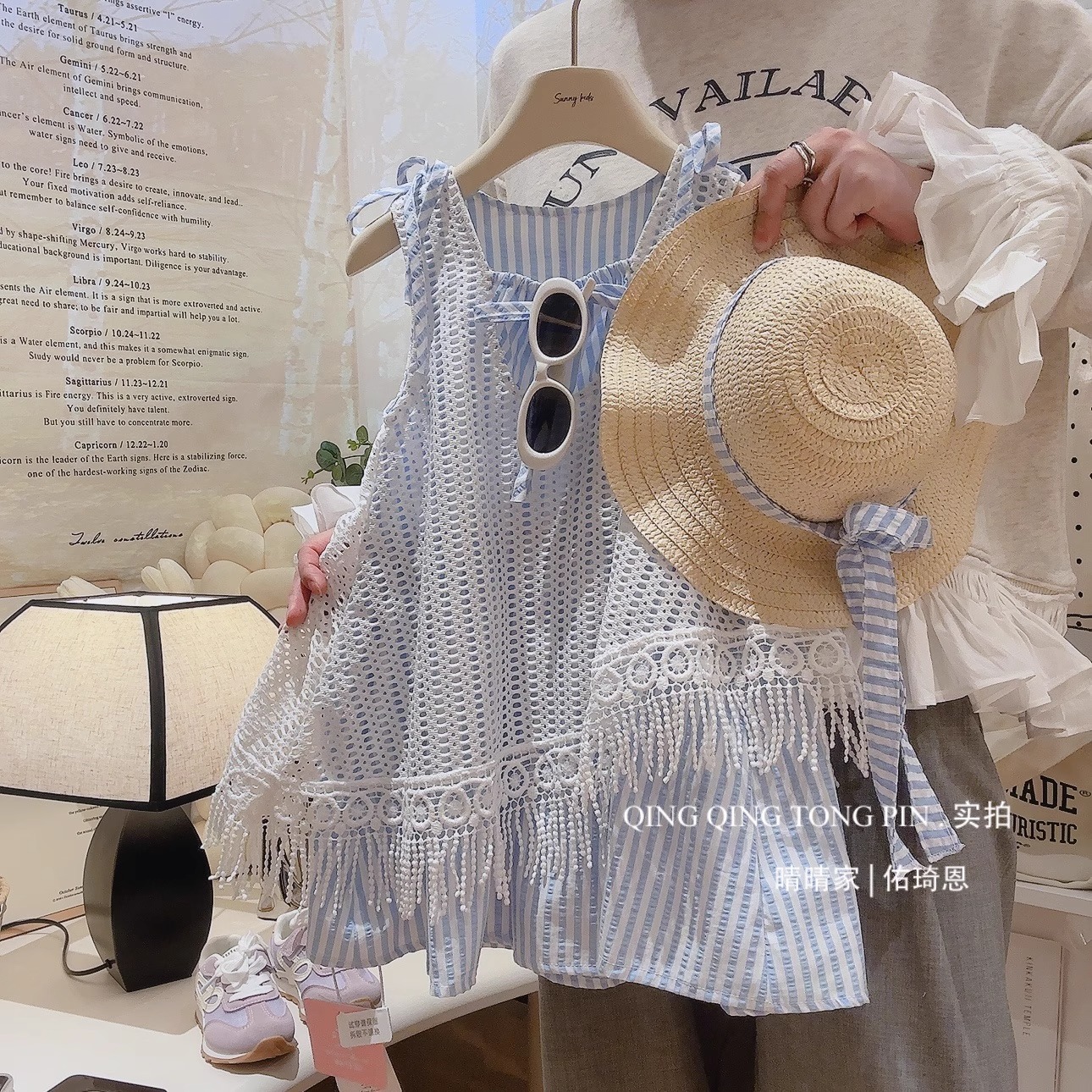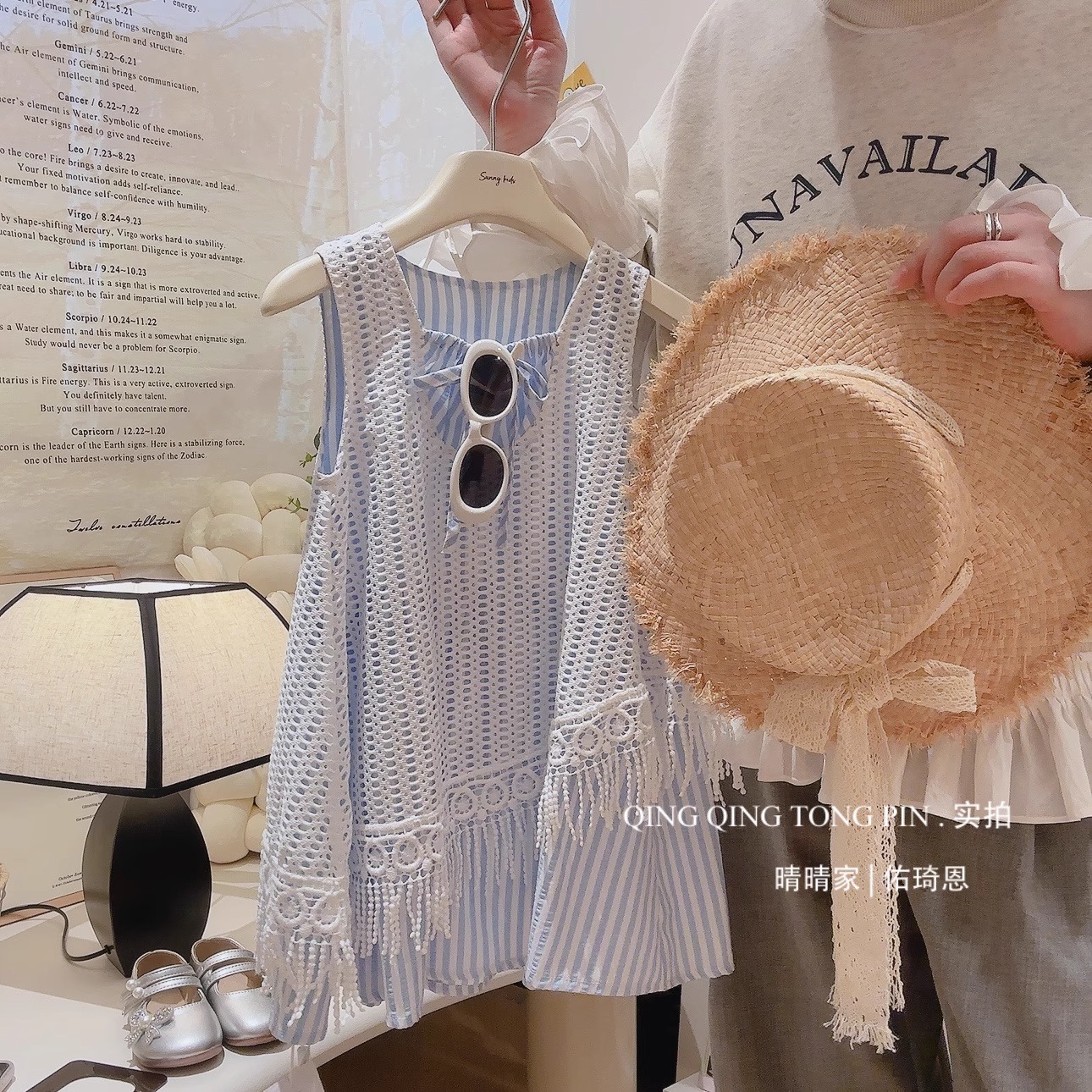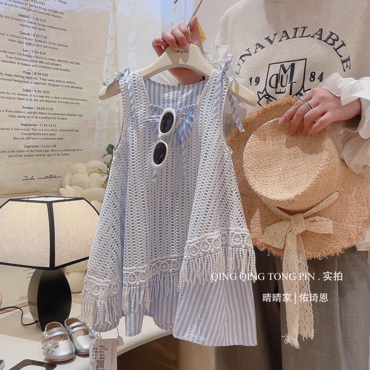소녀 원피스 2025 새 여름 어린이 세련 된 할로우 블라우스 서스펜더 스커트 소녀 홀리데이 스타일스토어 가기