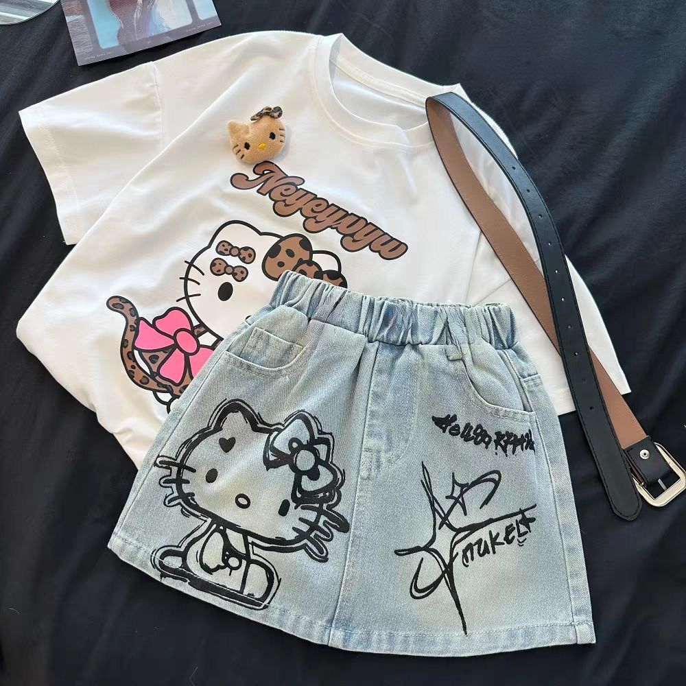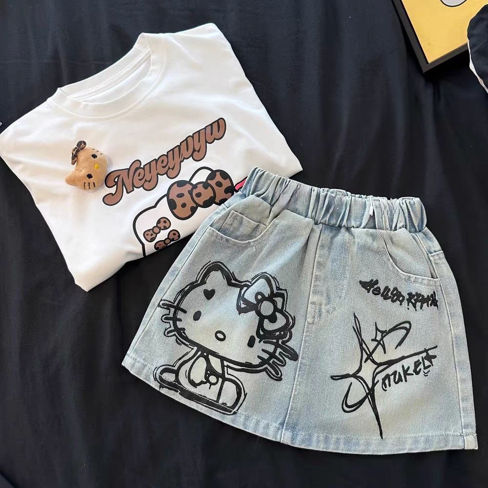 소녀 여름 세트 2025 새로운 아기 소녀 만화 인쇄 티셔츠 귀여운 인쇄 데님 치마 투피스 세트스토어 가기