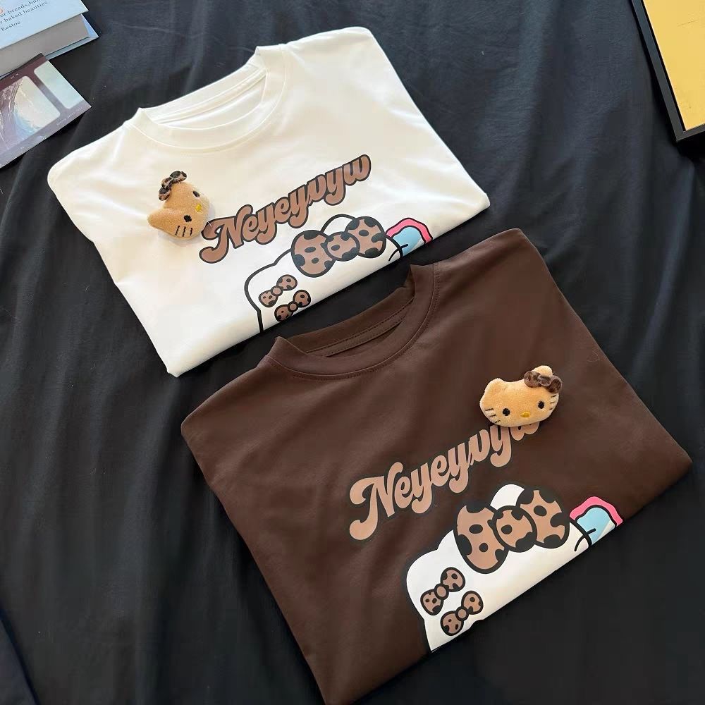 • 브라운 캣 반팔 + 프린트 데님 스커트