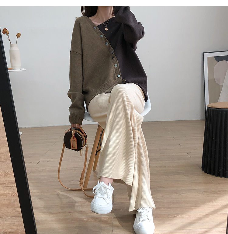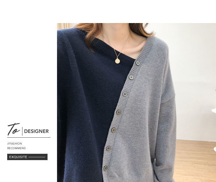 2023 봄과 가을 새로운 한국 스타일 느슨한 슬리밍 스웨터 불규칙한 비스듬한 버튼 비스듬한 칼라 컬러 대비 긴 소매 스웨터스토어 가기
