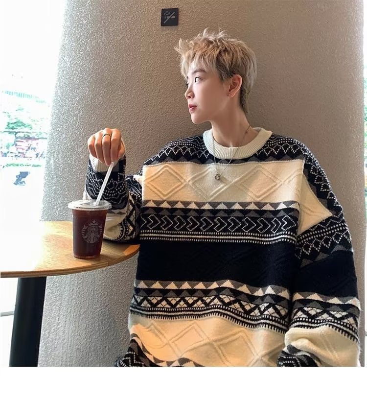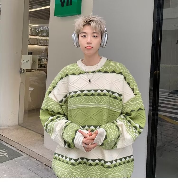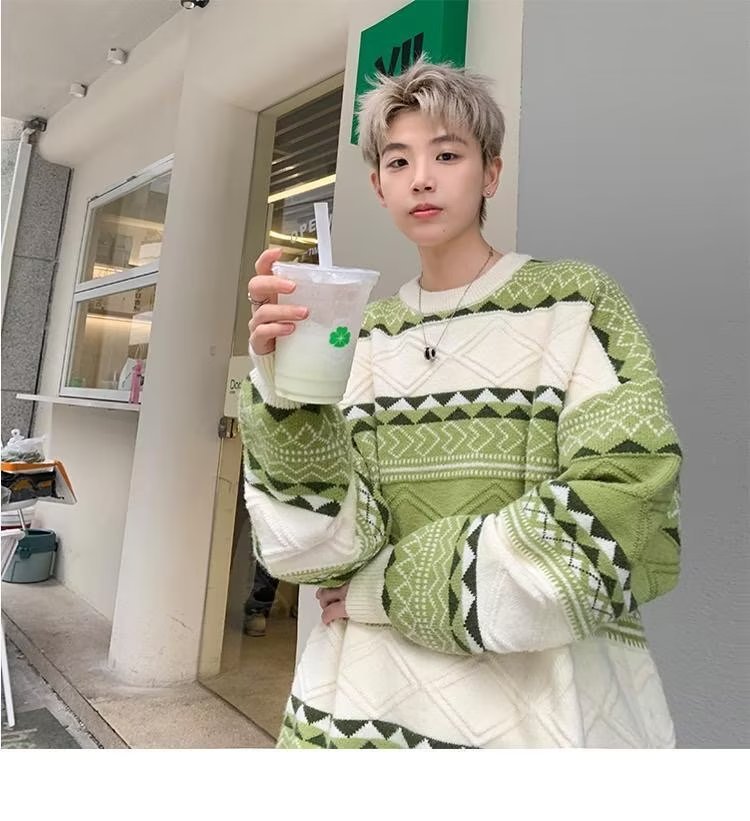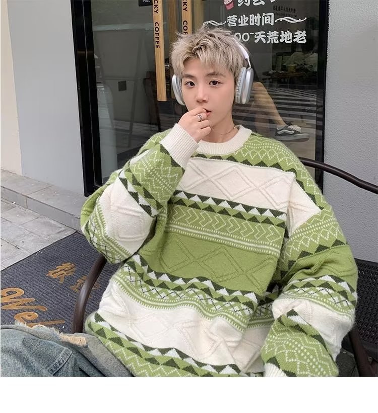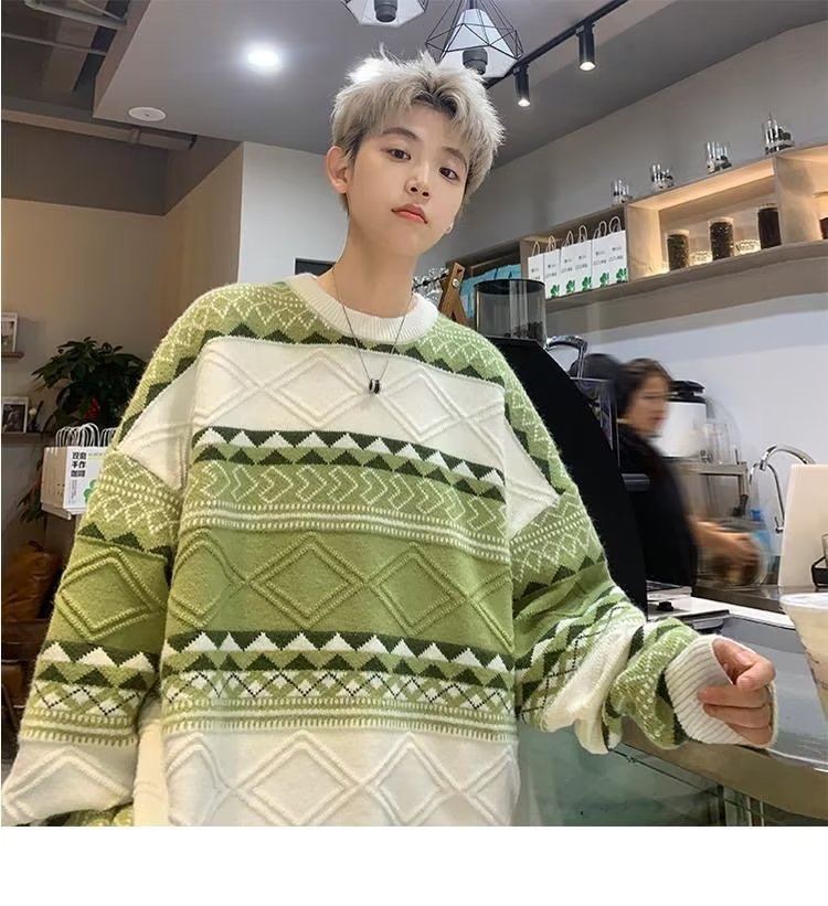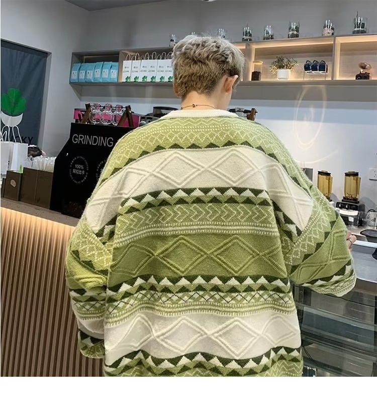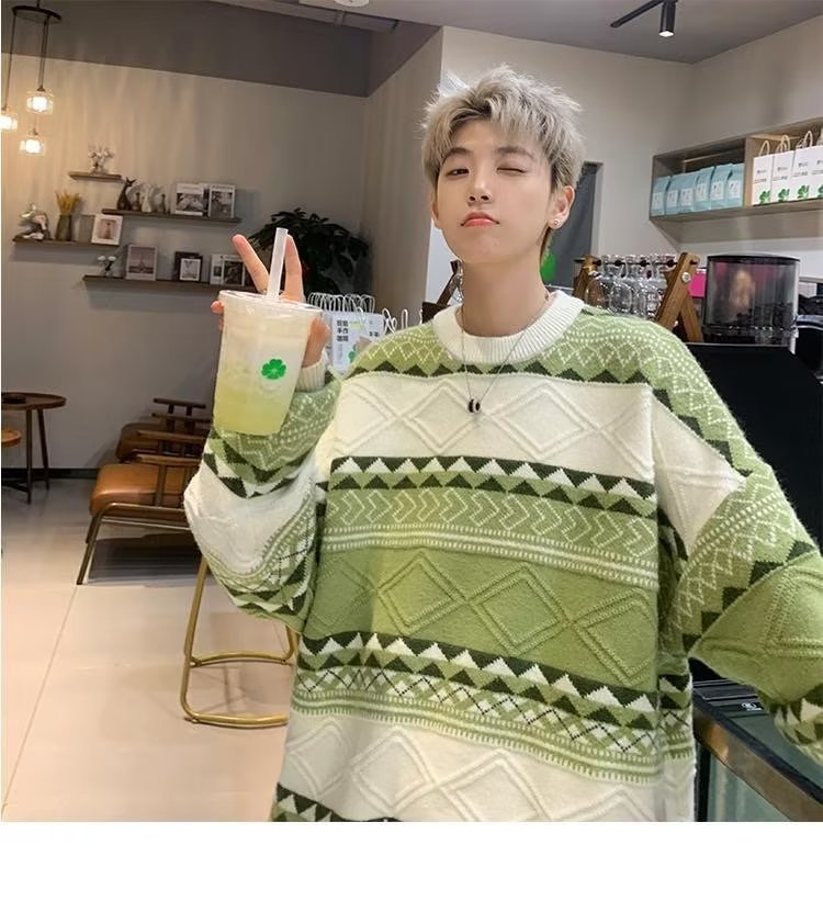 아오카도 그린 스트라이프 스티칭 디자인 스웨터 남자의 가을과 겨울 틈새 일본 스타일 게으른 스타일 레트로 니트 스웨터스토어 가기