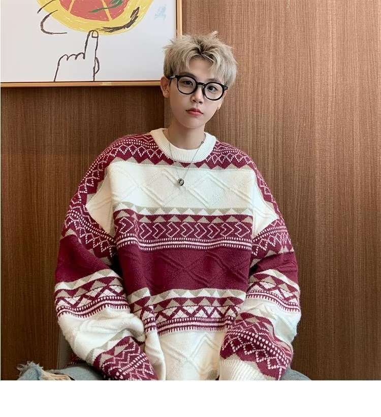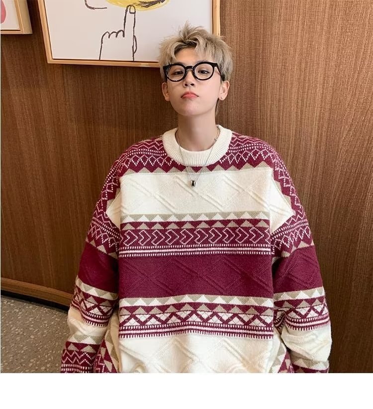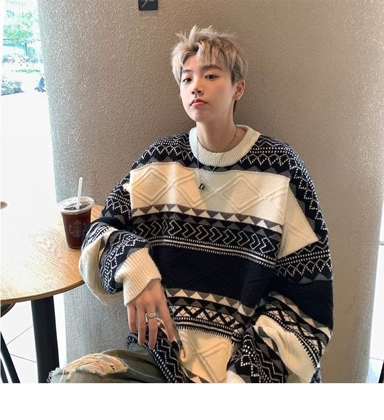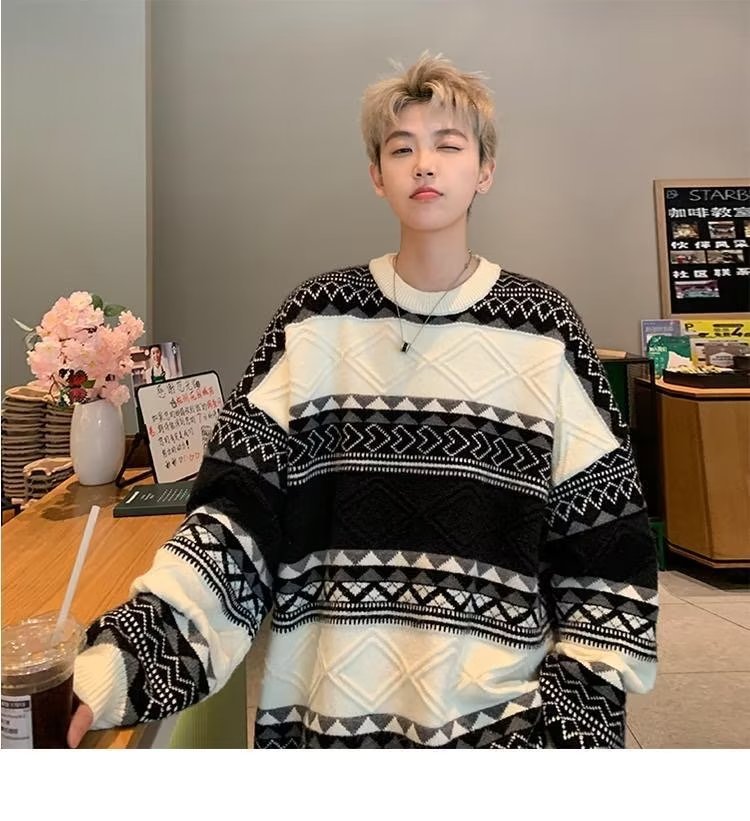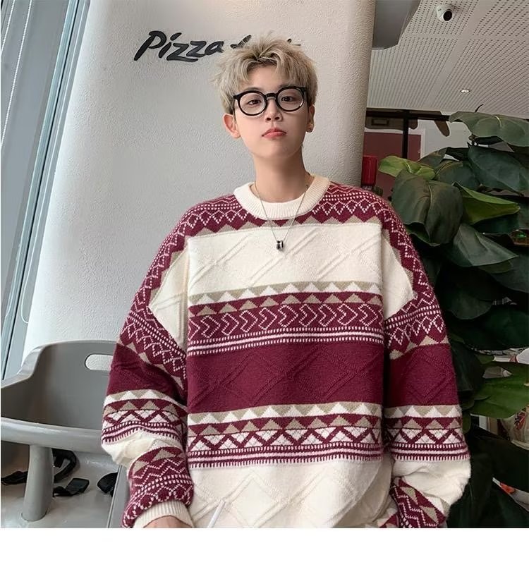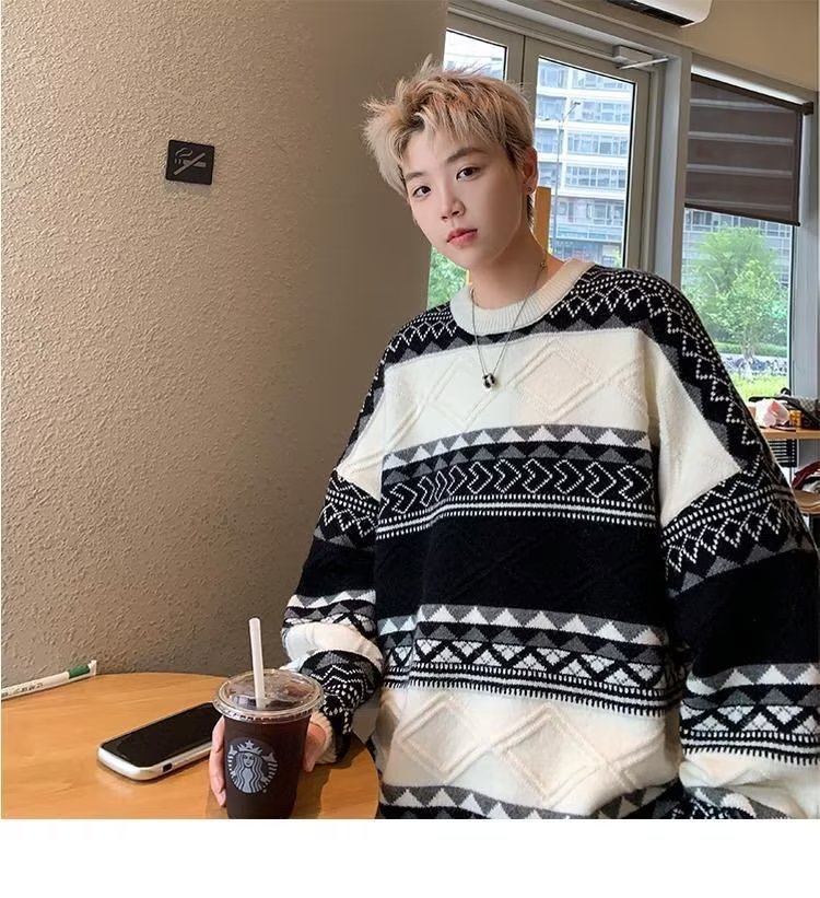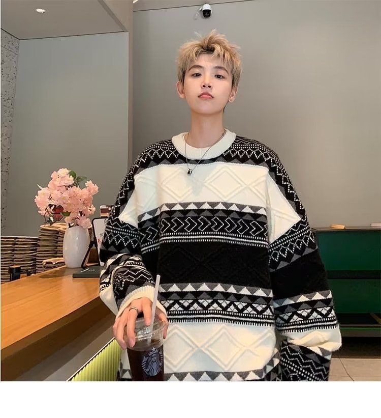 아오카도 그린 스트라이프 스티칭 디자인 스웨터 남자의 가을과 겨울 틈새 일본 스타일 게으른 스타일 레트로 니트 스웨터스토어 가기