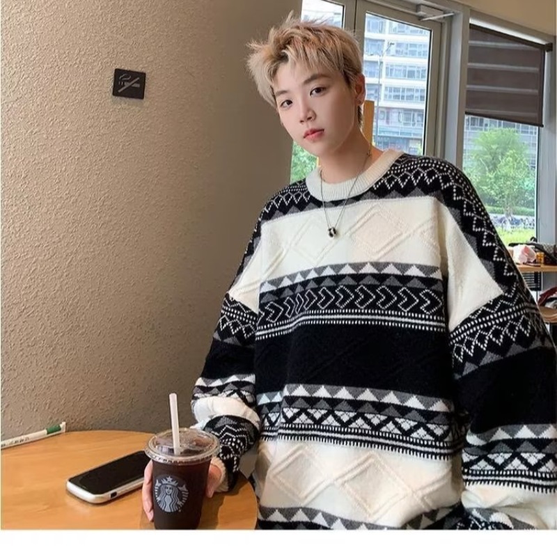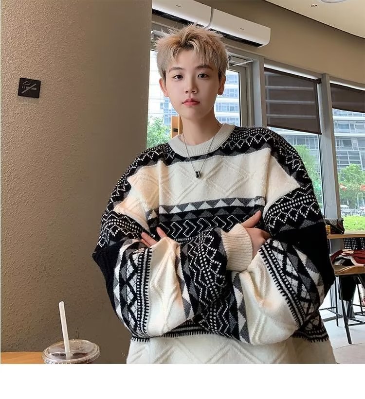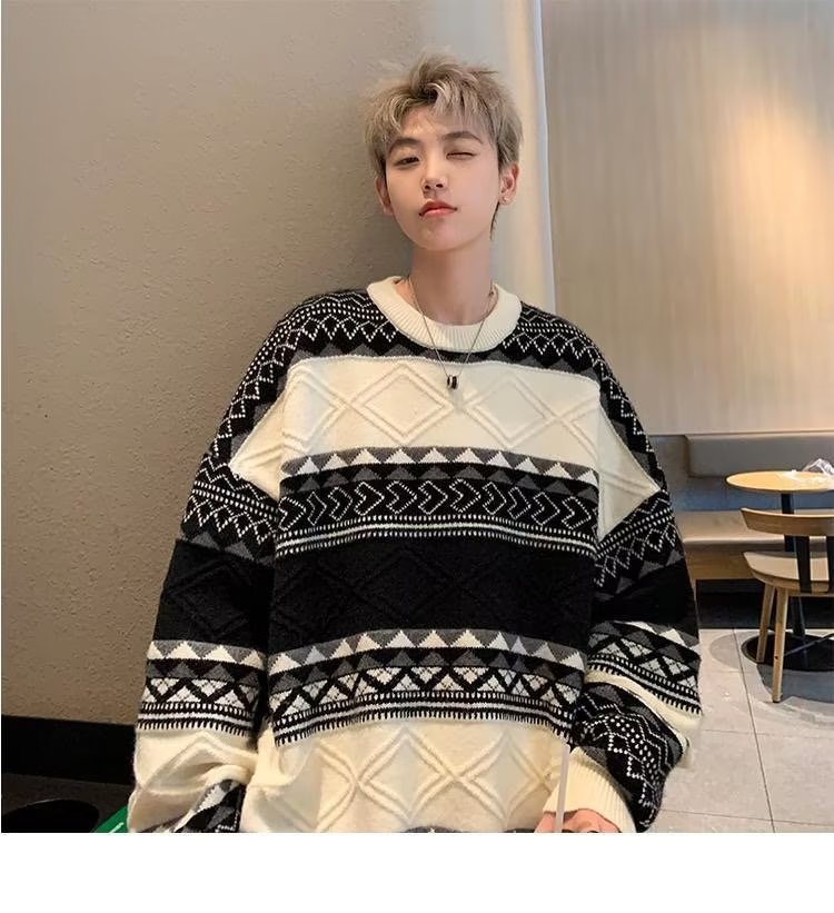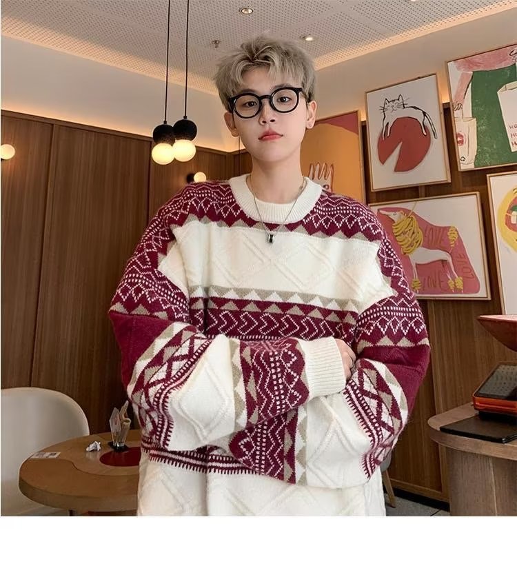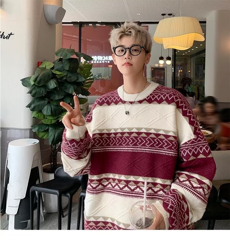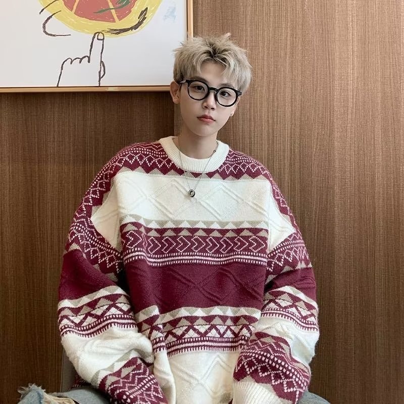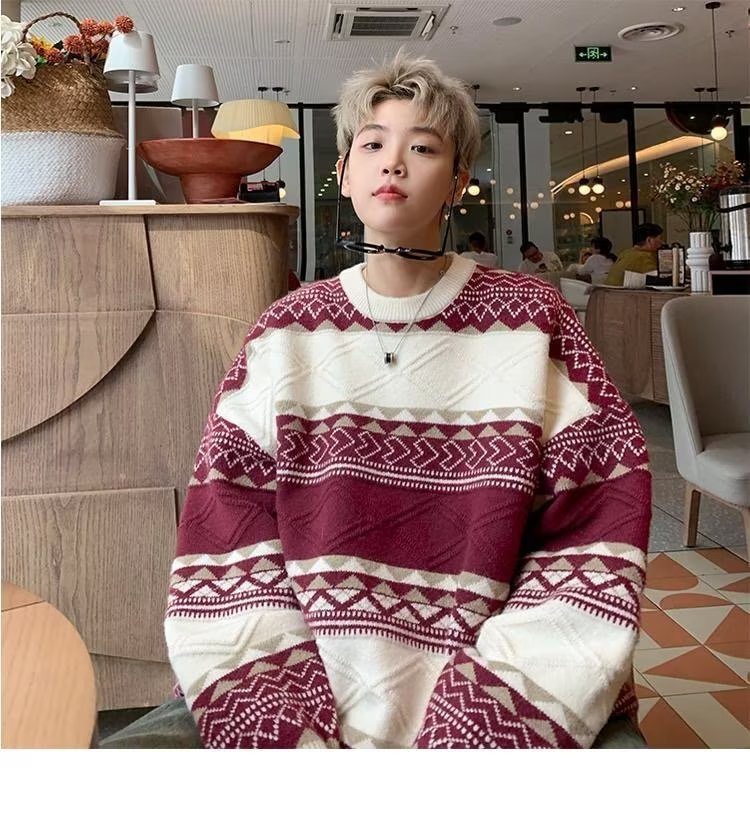 아오카도 그린 스트라이프 스티칭 디자인 스웨터 남자의 가을과 겨울 틈새 일본 스타일 게으른 스타일 레트로 니트 스웨터스토어 가기