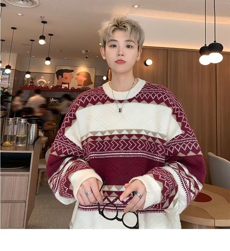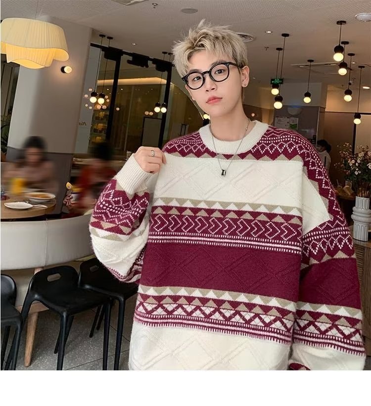 아오카도 그린 스트라이프 스티칭 디자인 스웨터 남자의 가을과 겨울 틈새 일본 스타일 게으른 스타일 레트로 니트 스웨터