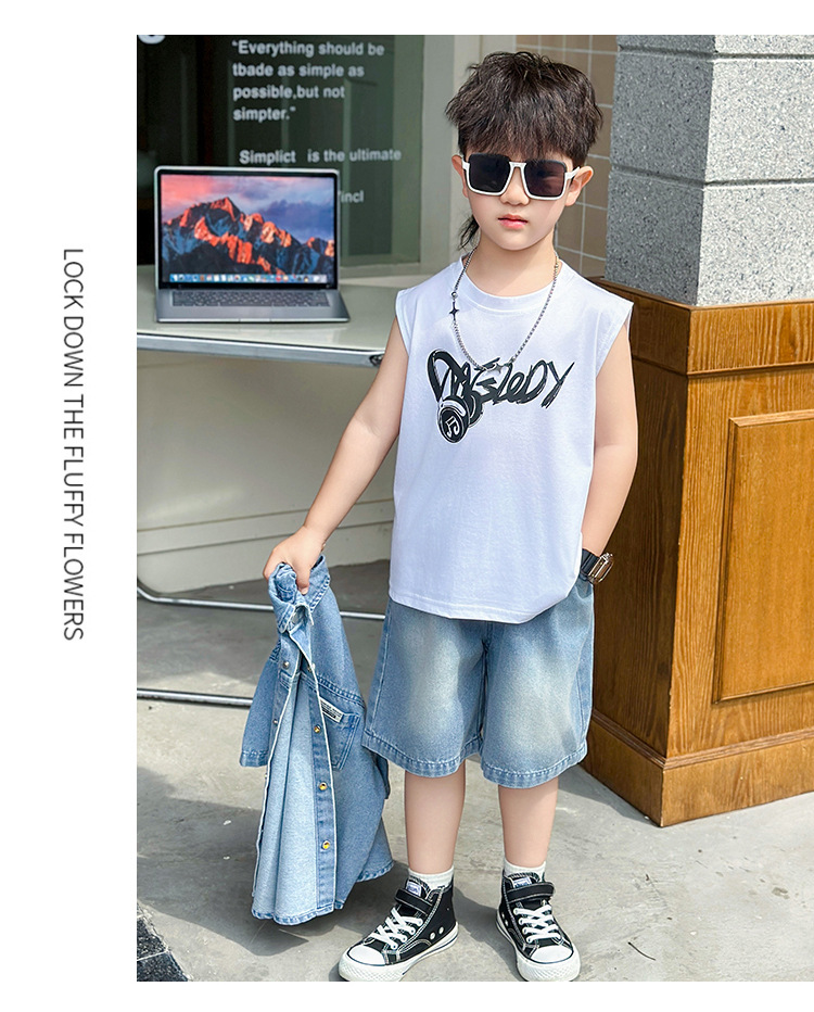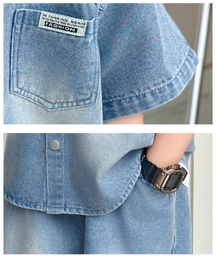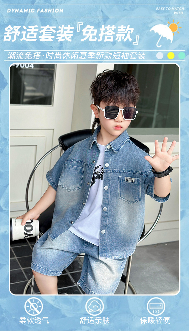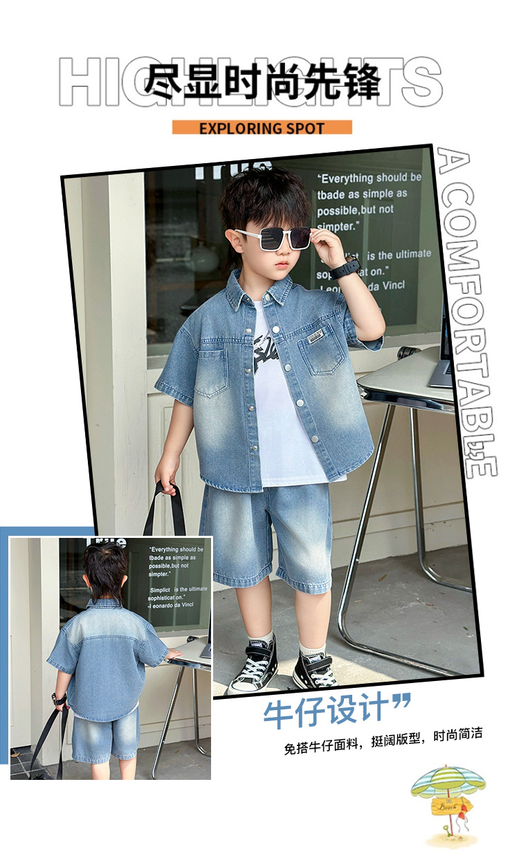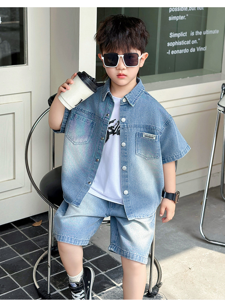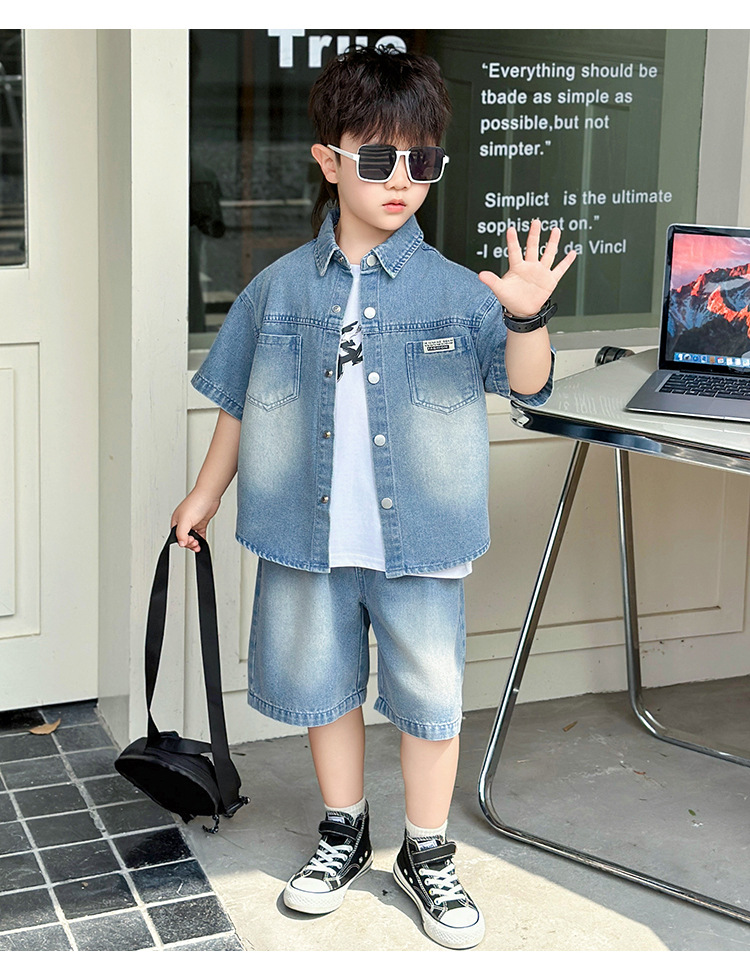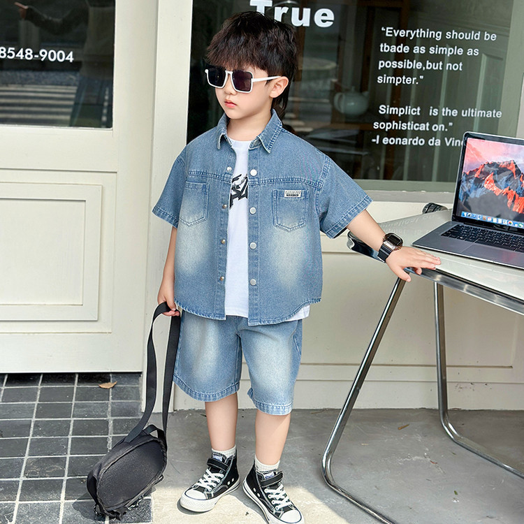 남아용 반팔 데님 3피스 여름 정장, 어린아이용 멋진 서양식 정장, 아기 트렌디하고 멋진 옷, 대외 무역스토어 가기