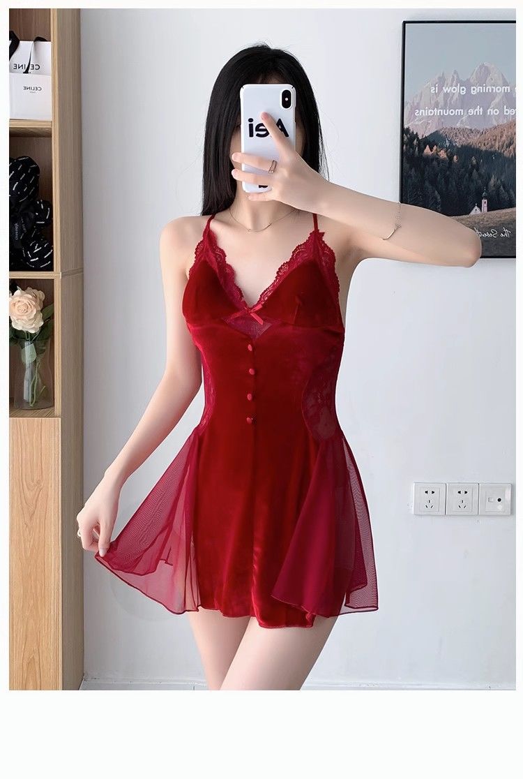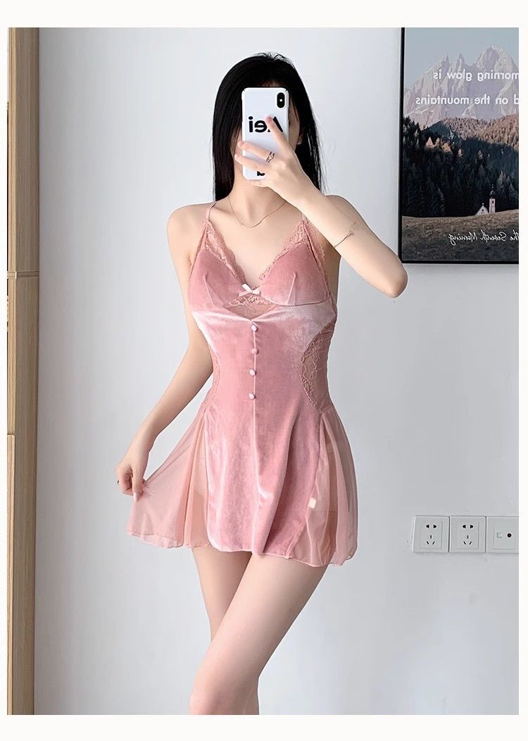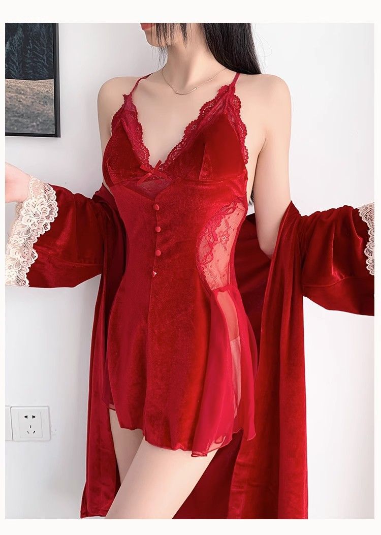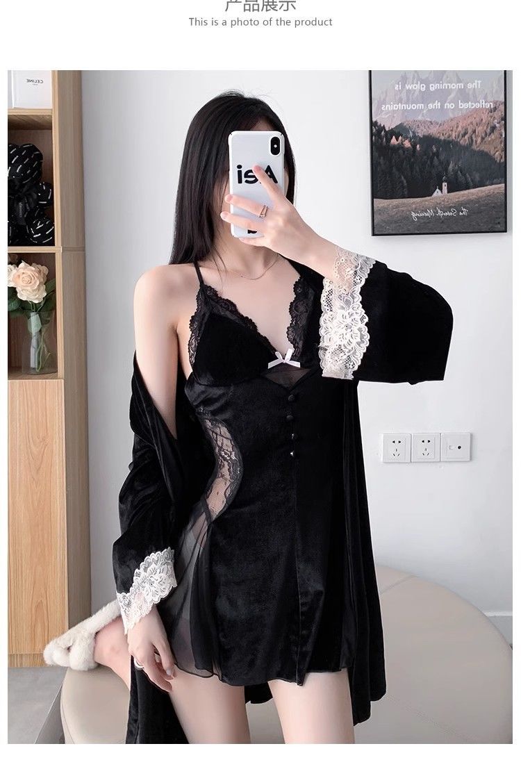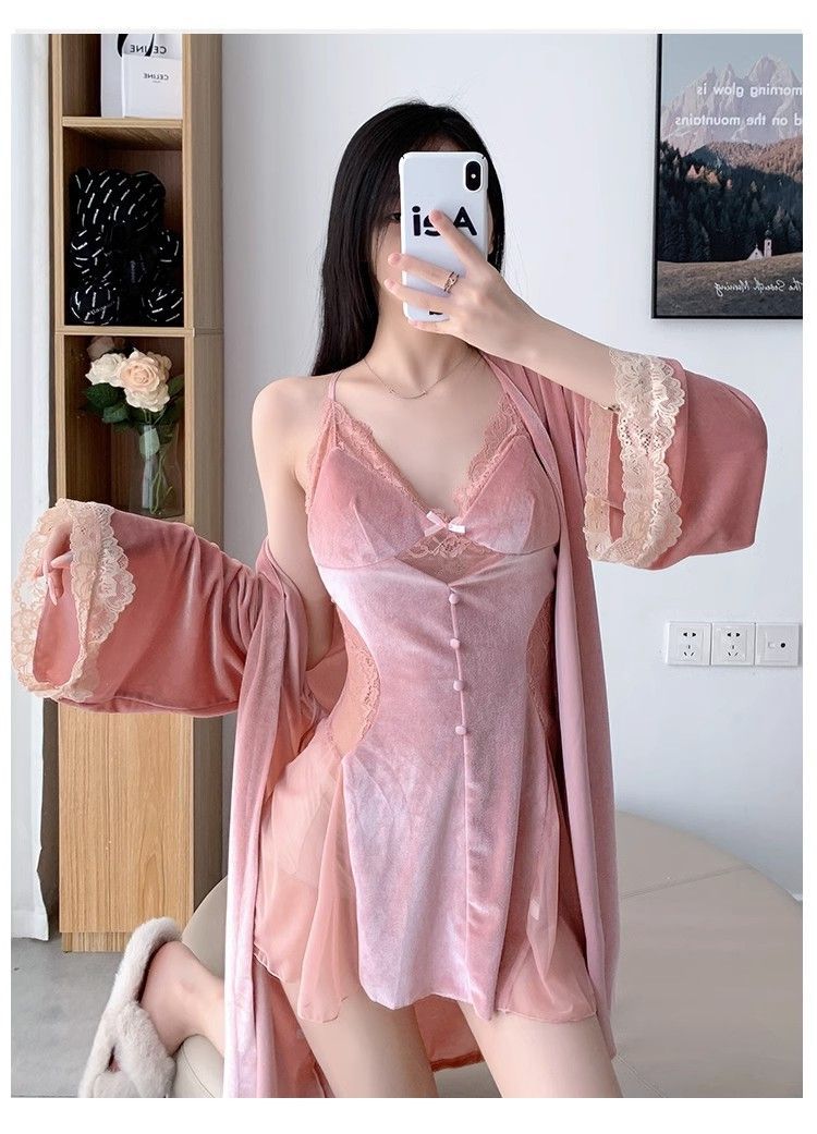 섹시 파자마 뉴 골드 벨벳 슬링 나이트 가운 세트 가을과 겨울 레이스 벨트 가슴 패드 벨벳 홈 옷
