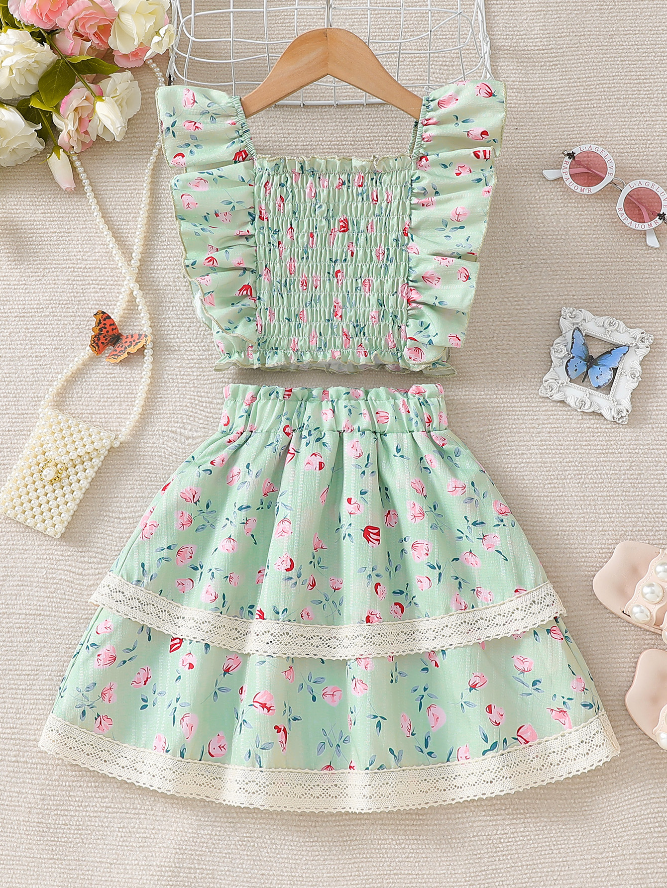 국경 간 여자 치마 세트 프렌치 플라잉 슬리브 작은 꽃 녹색 케이크 스커트 여름 어린이 치마 투피스 세트