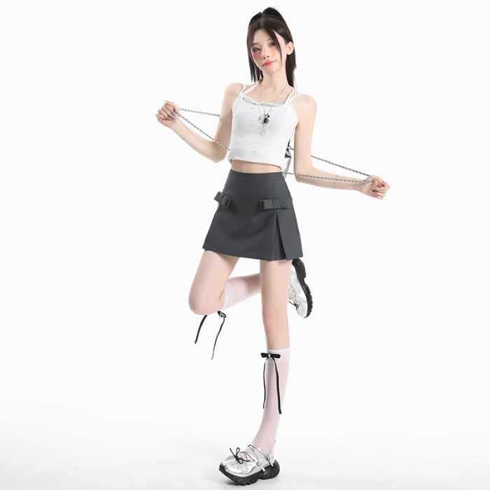 BBN 그레이 보우 스커트 여성 여름 신작 하이 웨이스트 슬림 A 라인 스커트 쁘띠 슈트 스커트