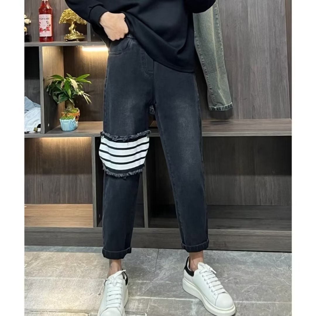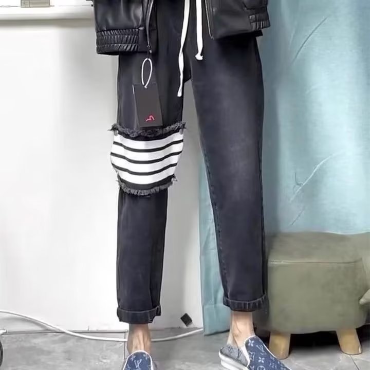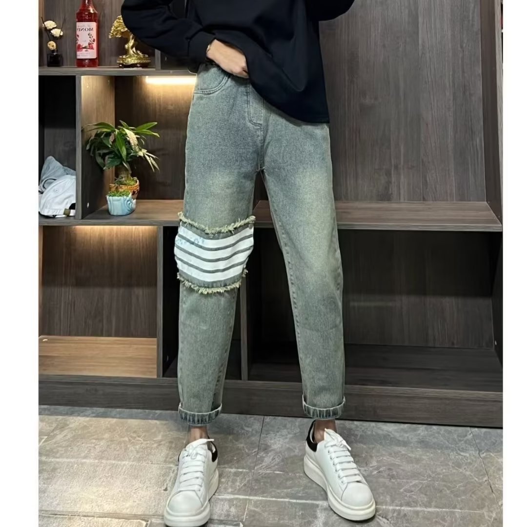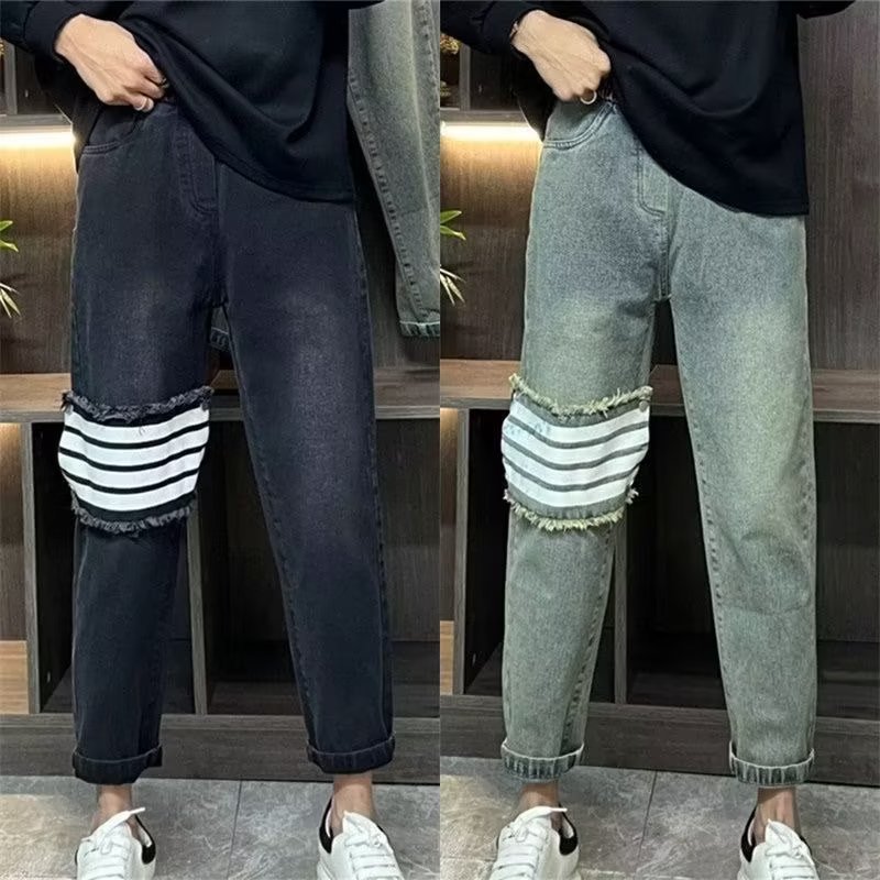 바이브 디자인 센스 4 웨이 바 청바지 남성용 대형 일본식 레트로 스트레이트 루즈 슬리밍 팬츠스토어 가기