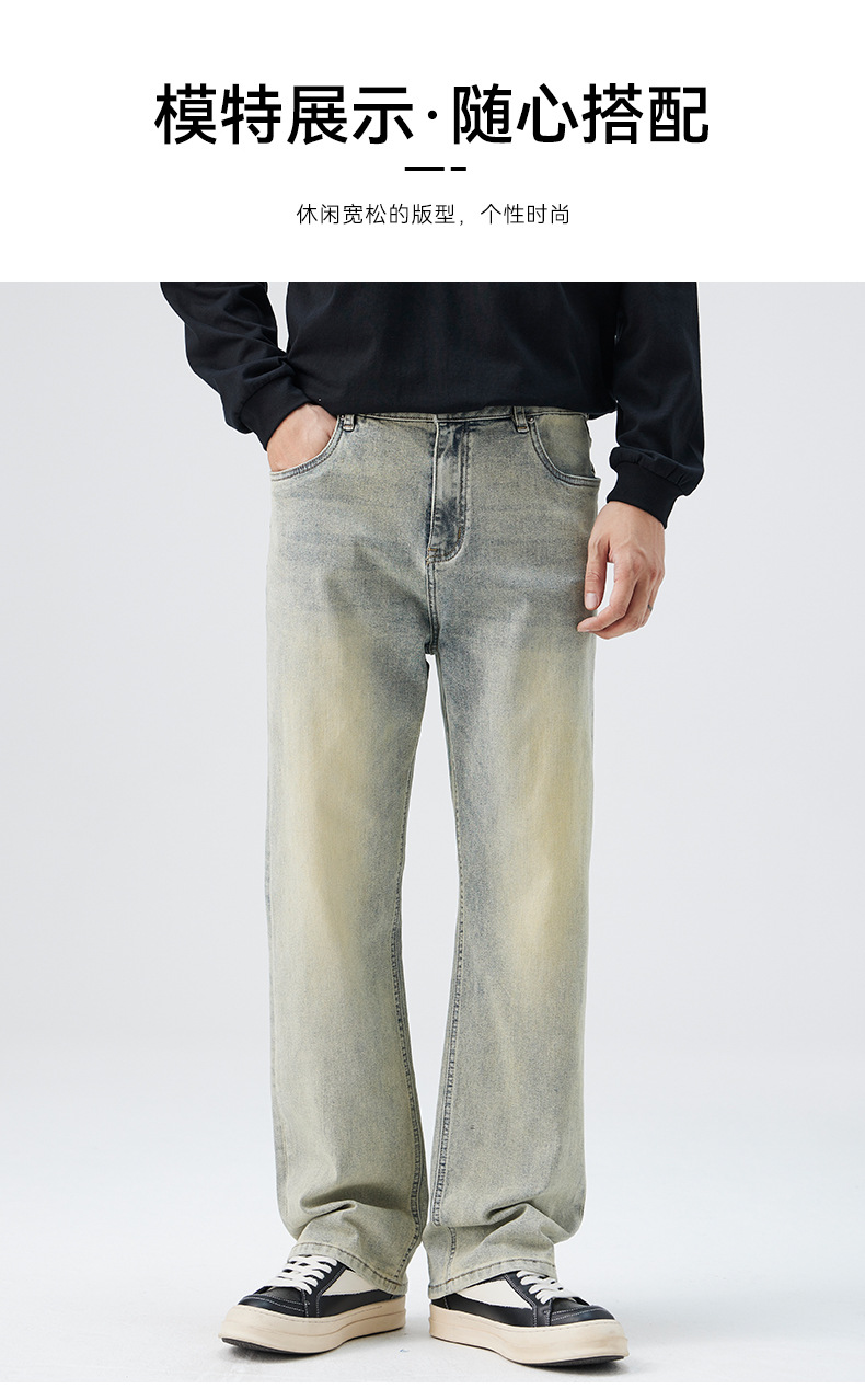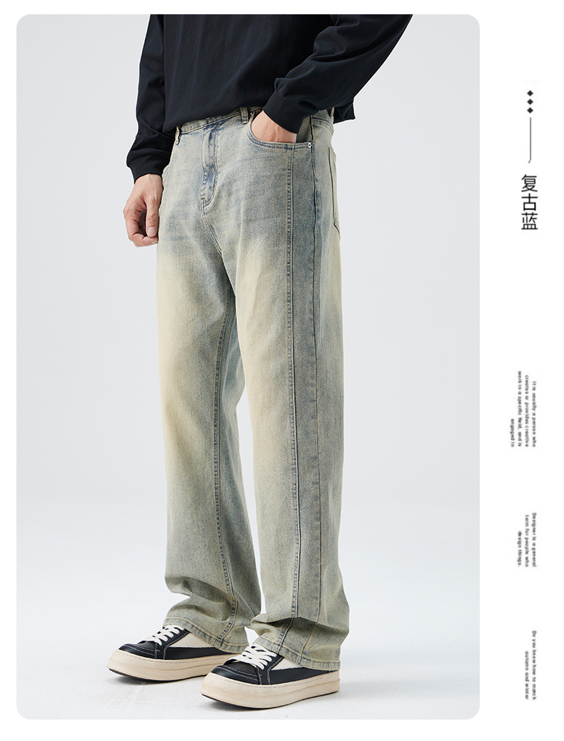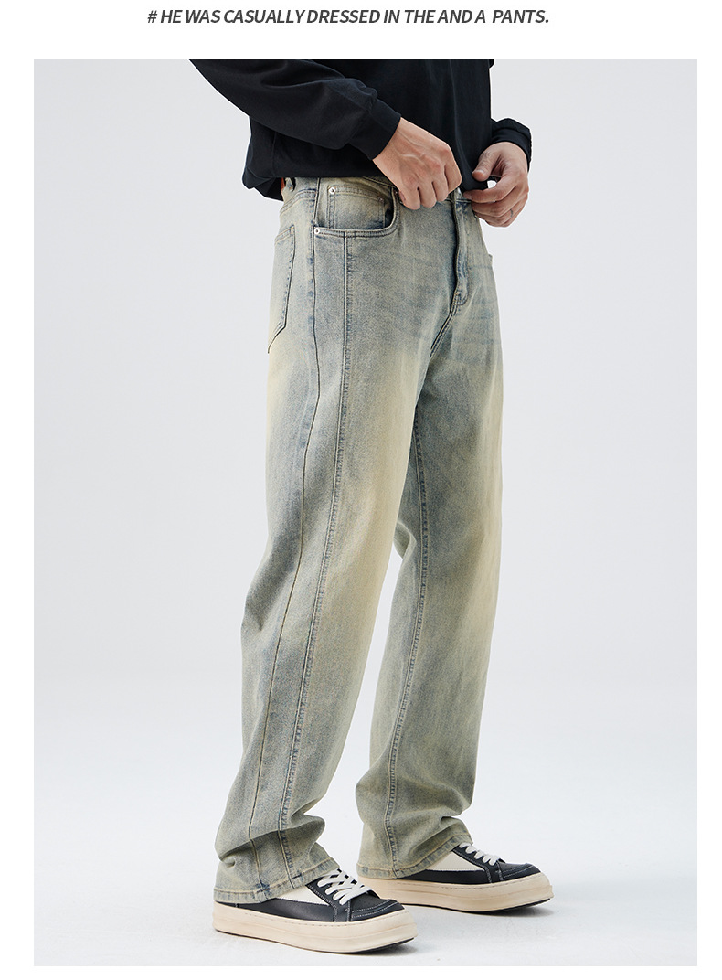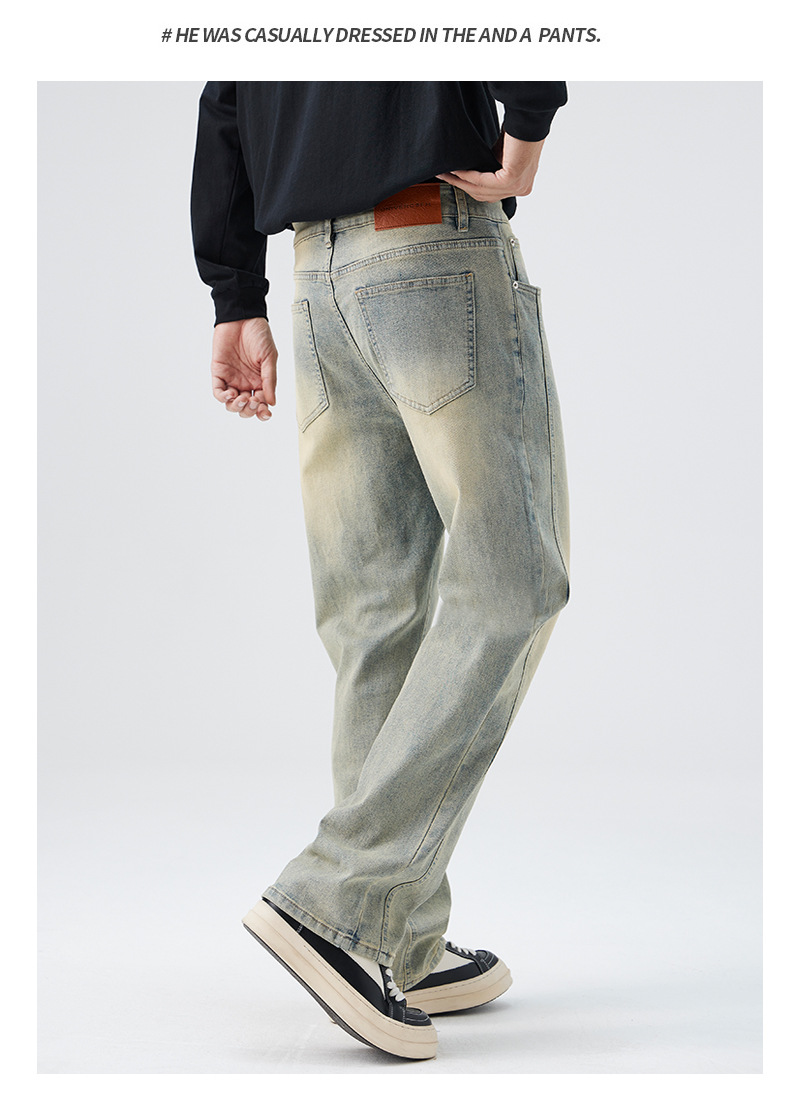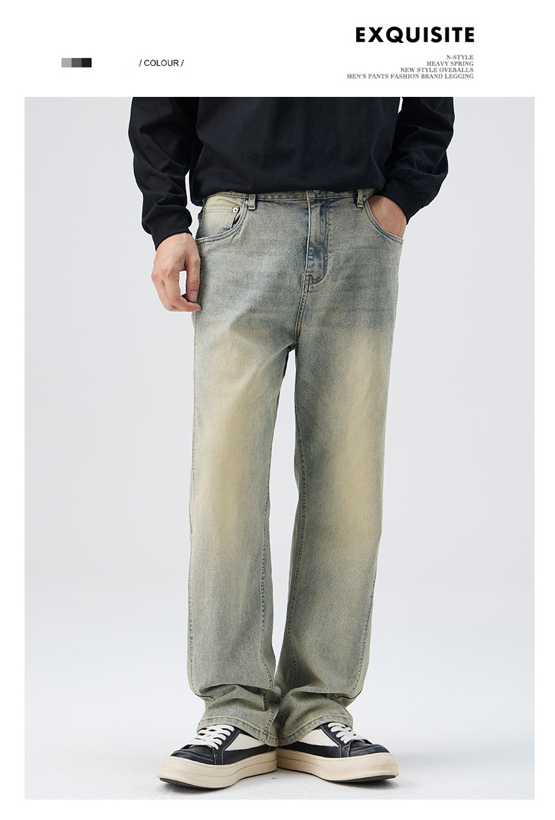 남녀공용 아메리칸 헤비웨이트 워싱 황변 청바지, 노란색 진흙 염색 스트레이트 팬츠, 트렌디한 워싱 디스트레스드 캐주얼 롱팬츠스토어 가기