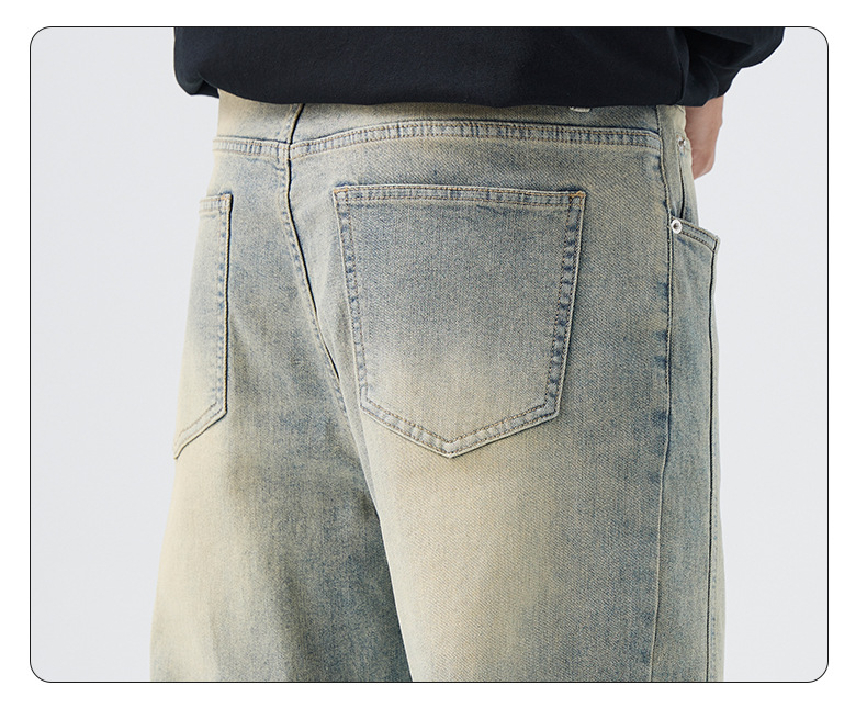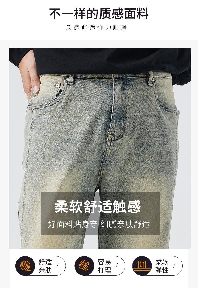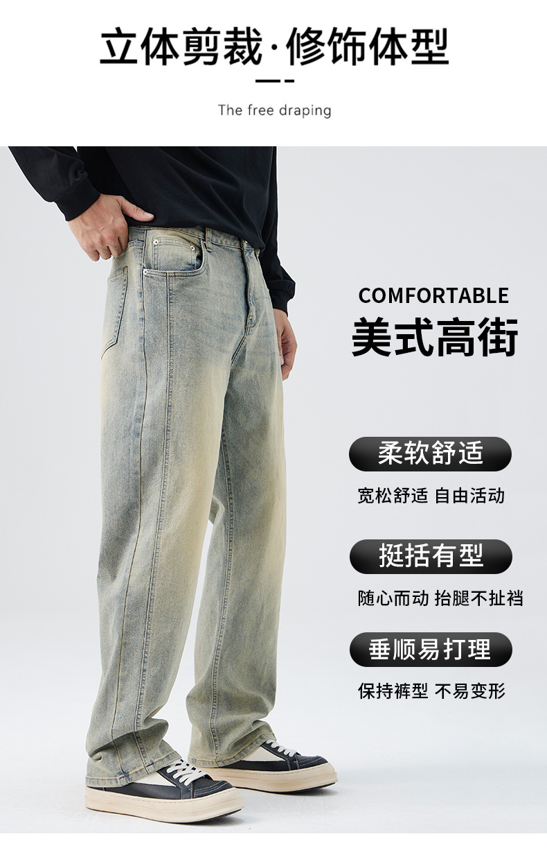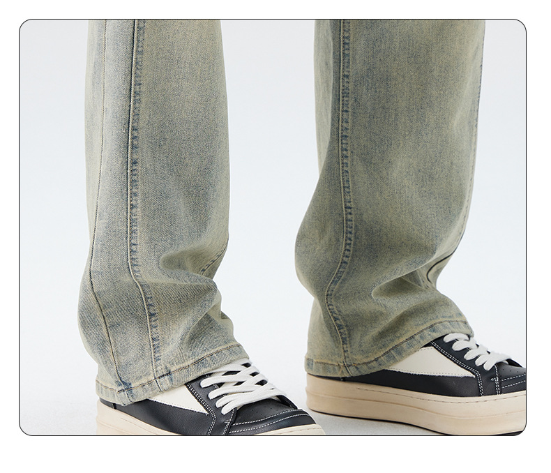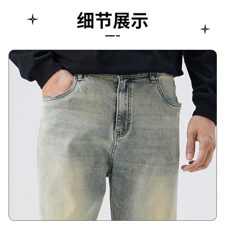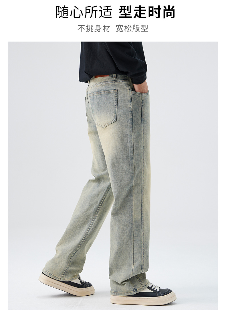 남녀공용 아메리칸 헤비웨이트 워싱 황변 청바지, 노란색 진흙 염색 스트레이트 팬츠, 트렌디한 워싱 디스트레스드 캐주얼 롱팬츠스토어 가기
