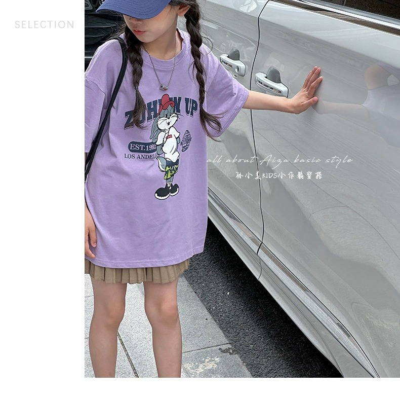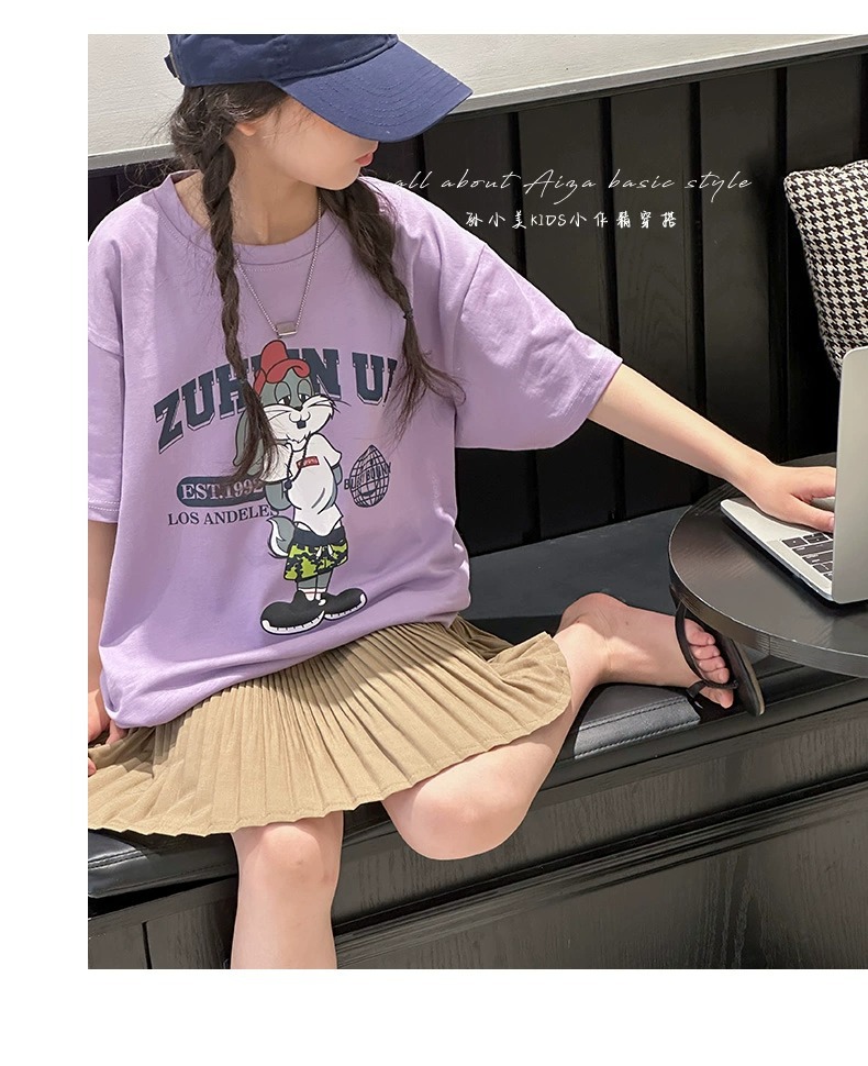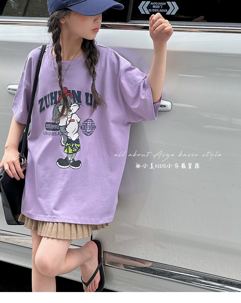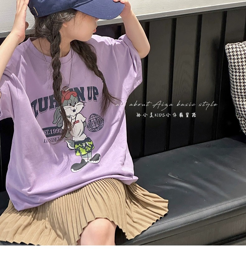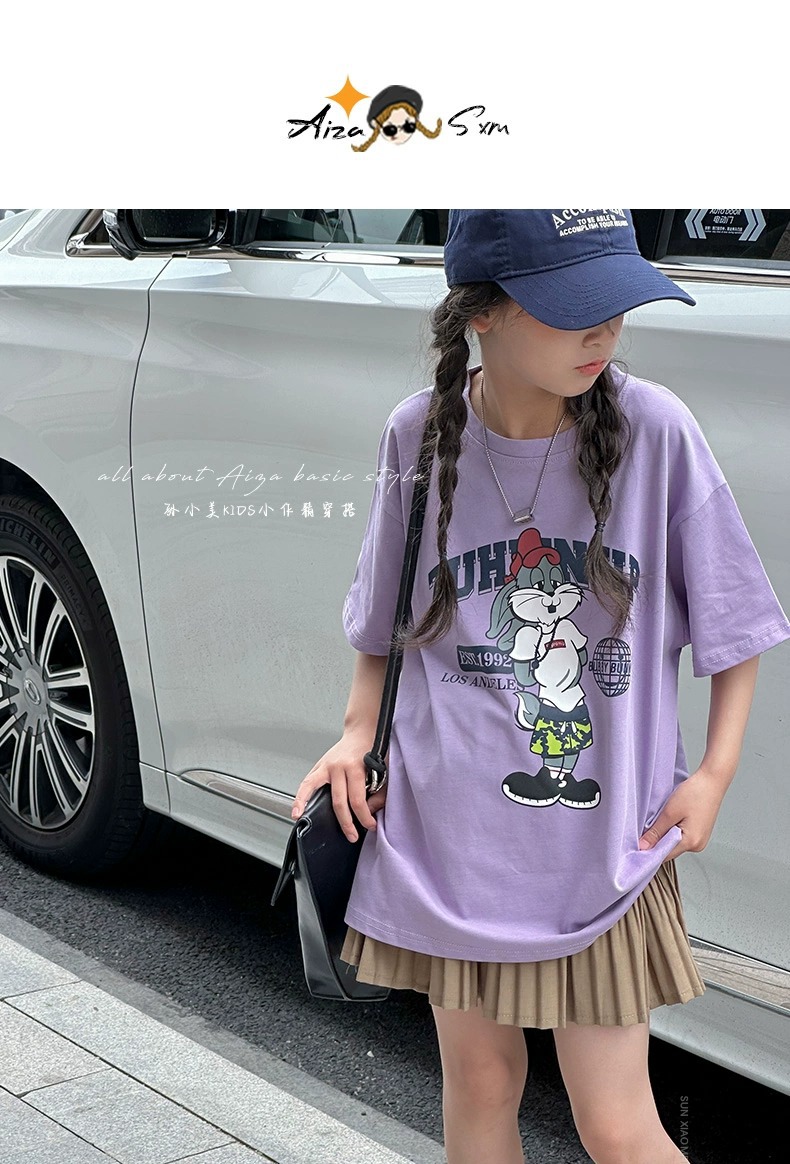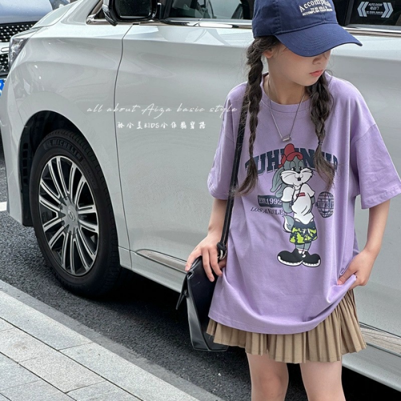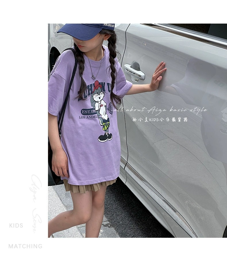 한국 어린이 의류 소녀 티셔츠 2024 년 여름 새로운 느슨한 유행 T를위한 반팔 소녀 캐주얼 의류스토어 가기