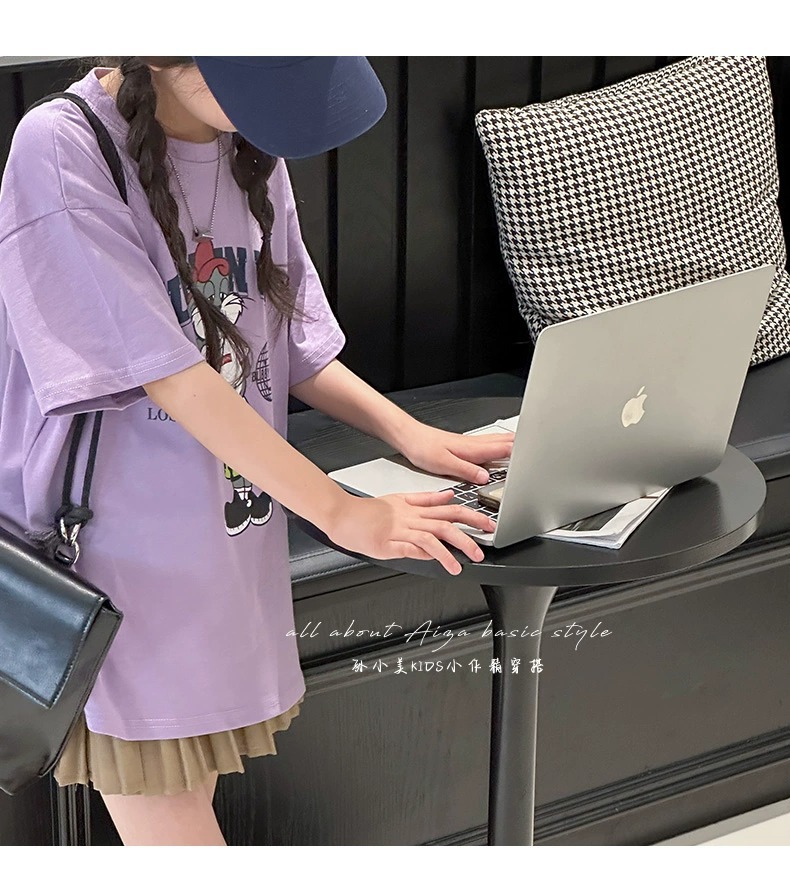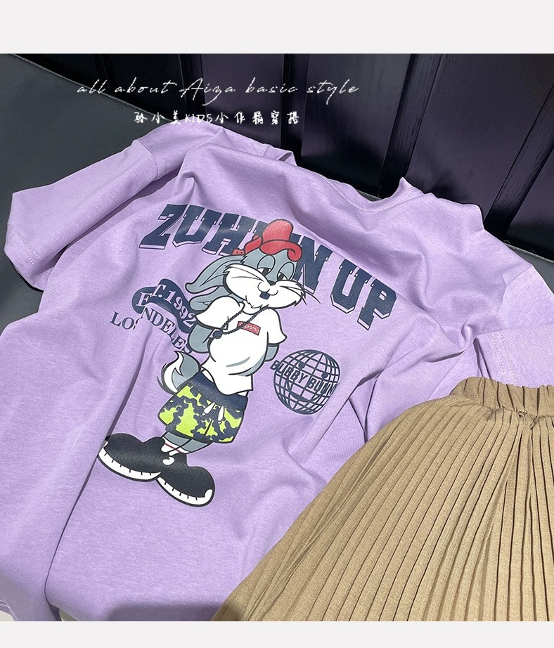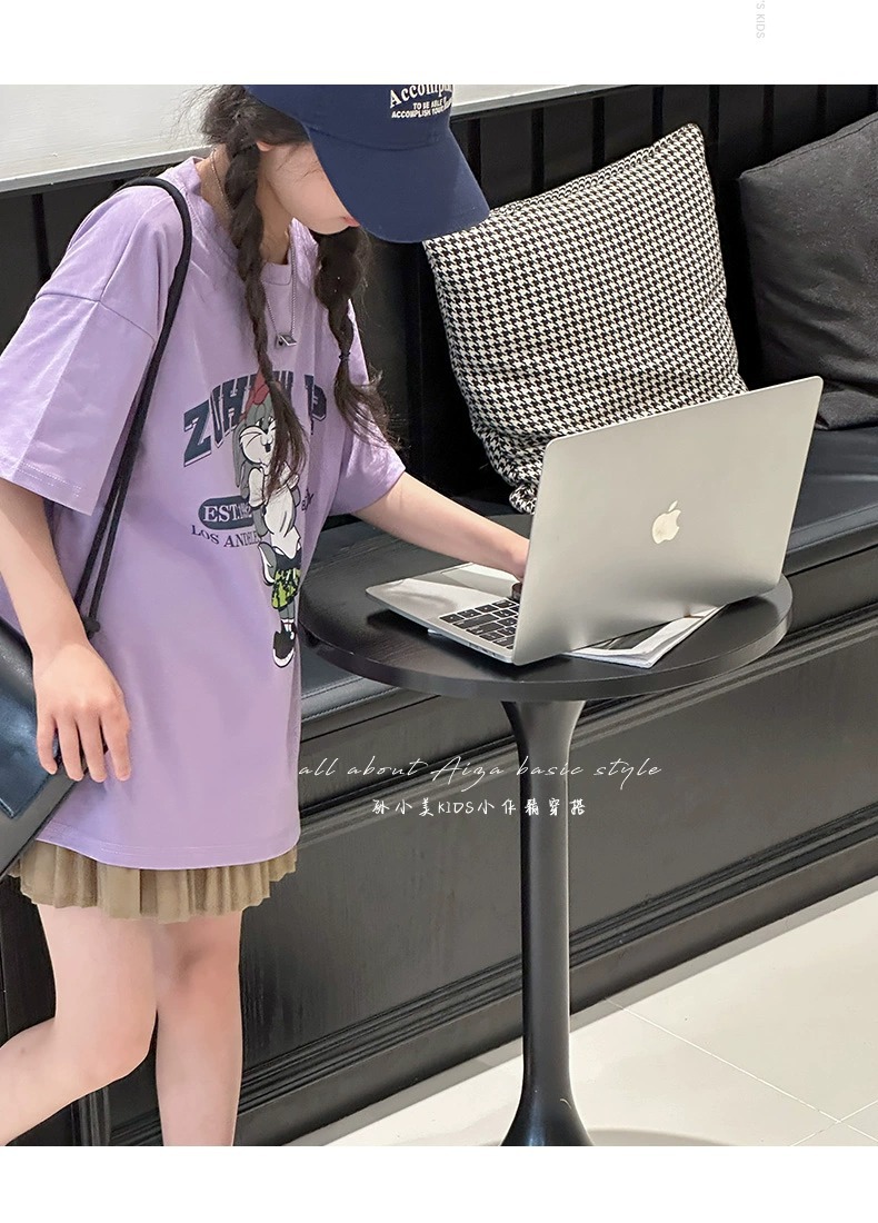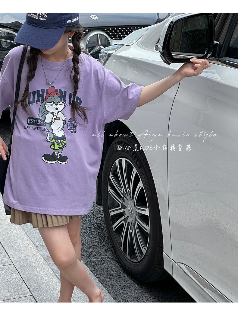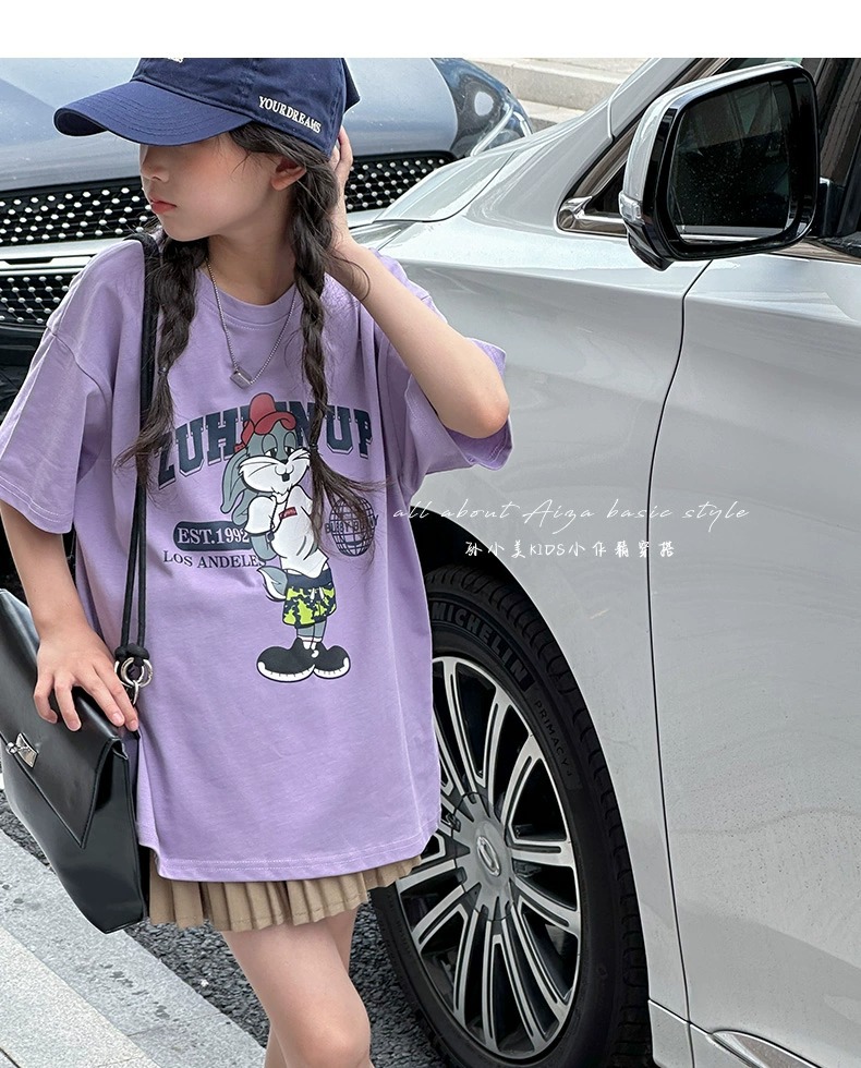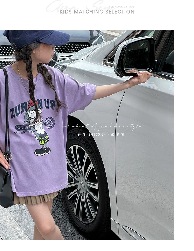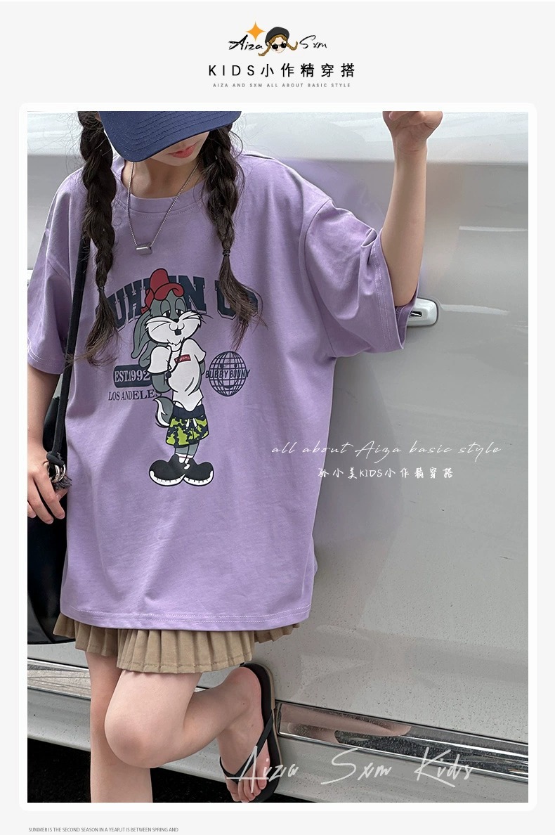 한국 어린이 의류 소녀 티셔츠 2024 년 여름 새로운 느슨한 유행 T를위한 반팔 소녀 캐주얼 의류스토어 가기