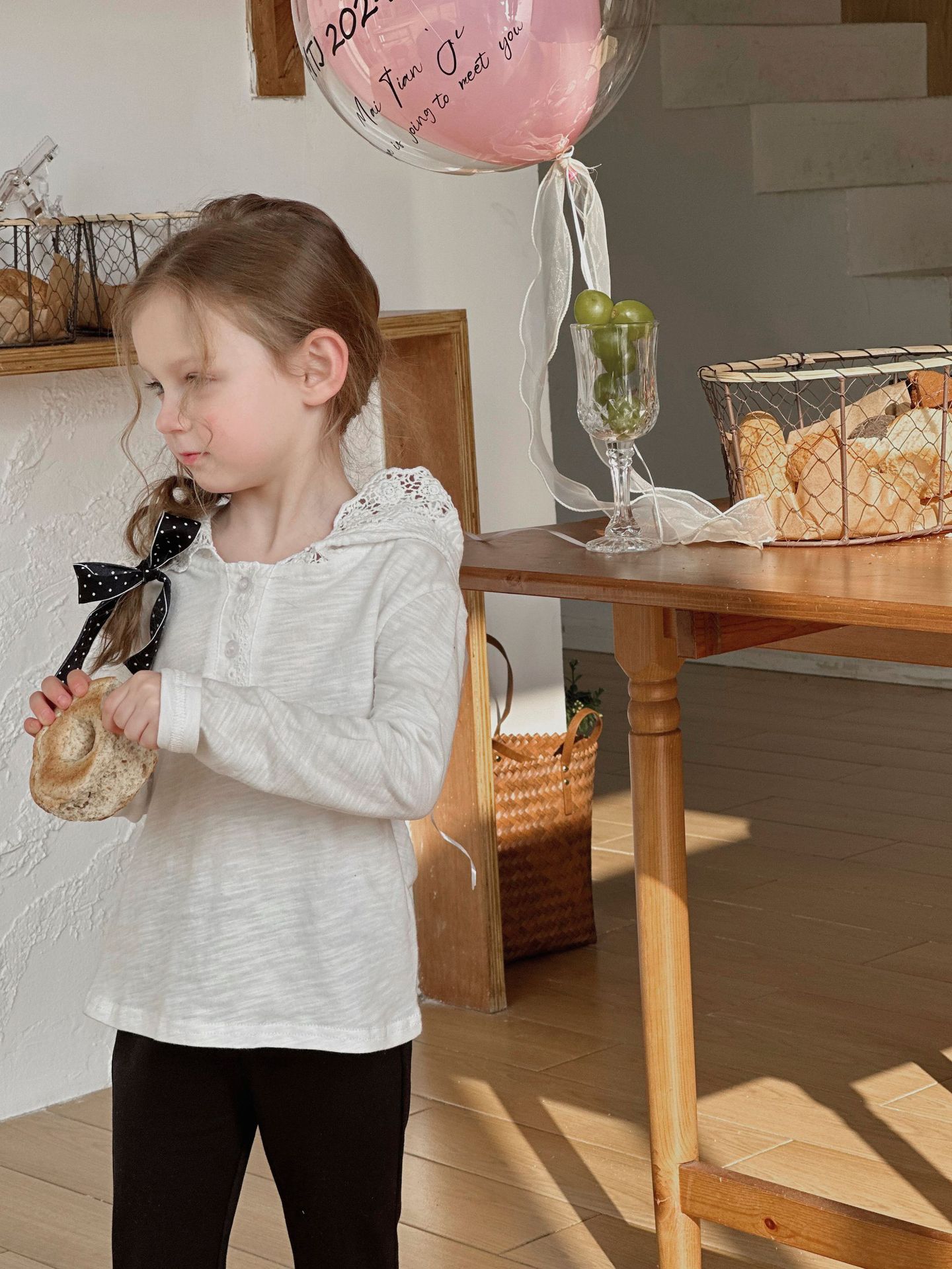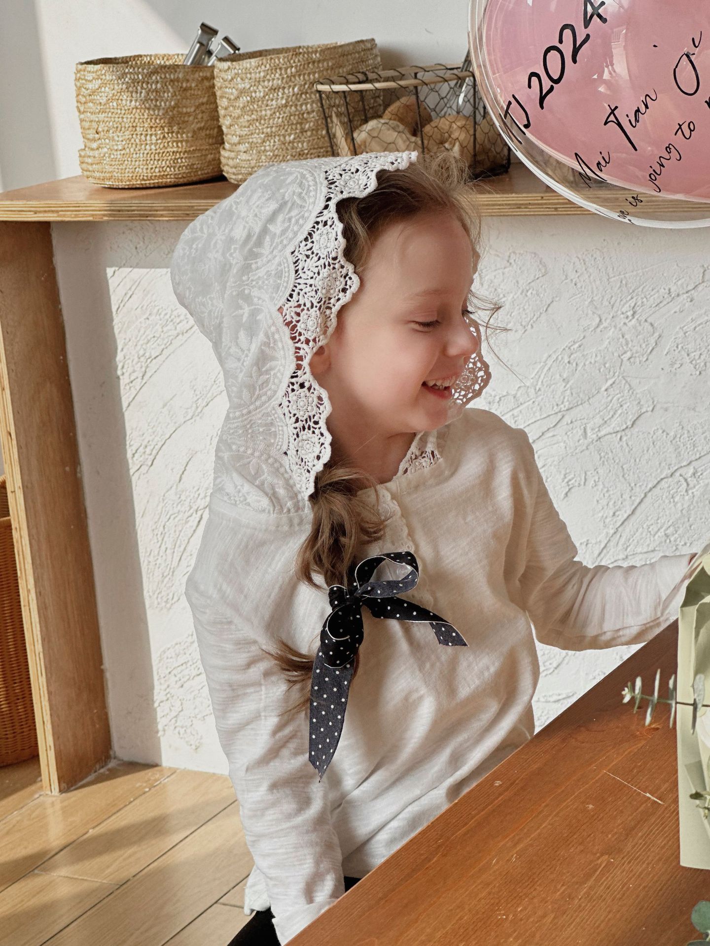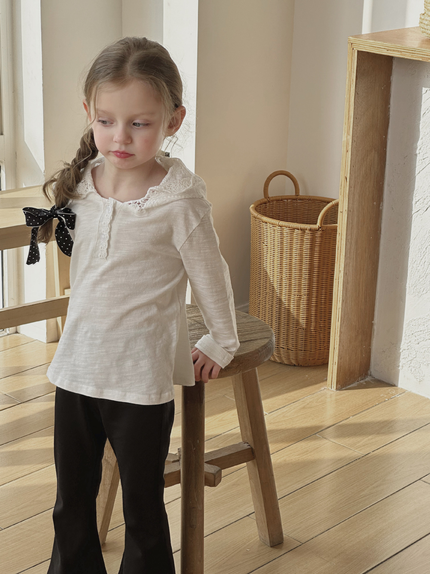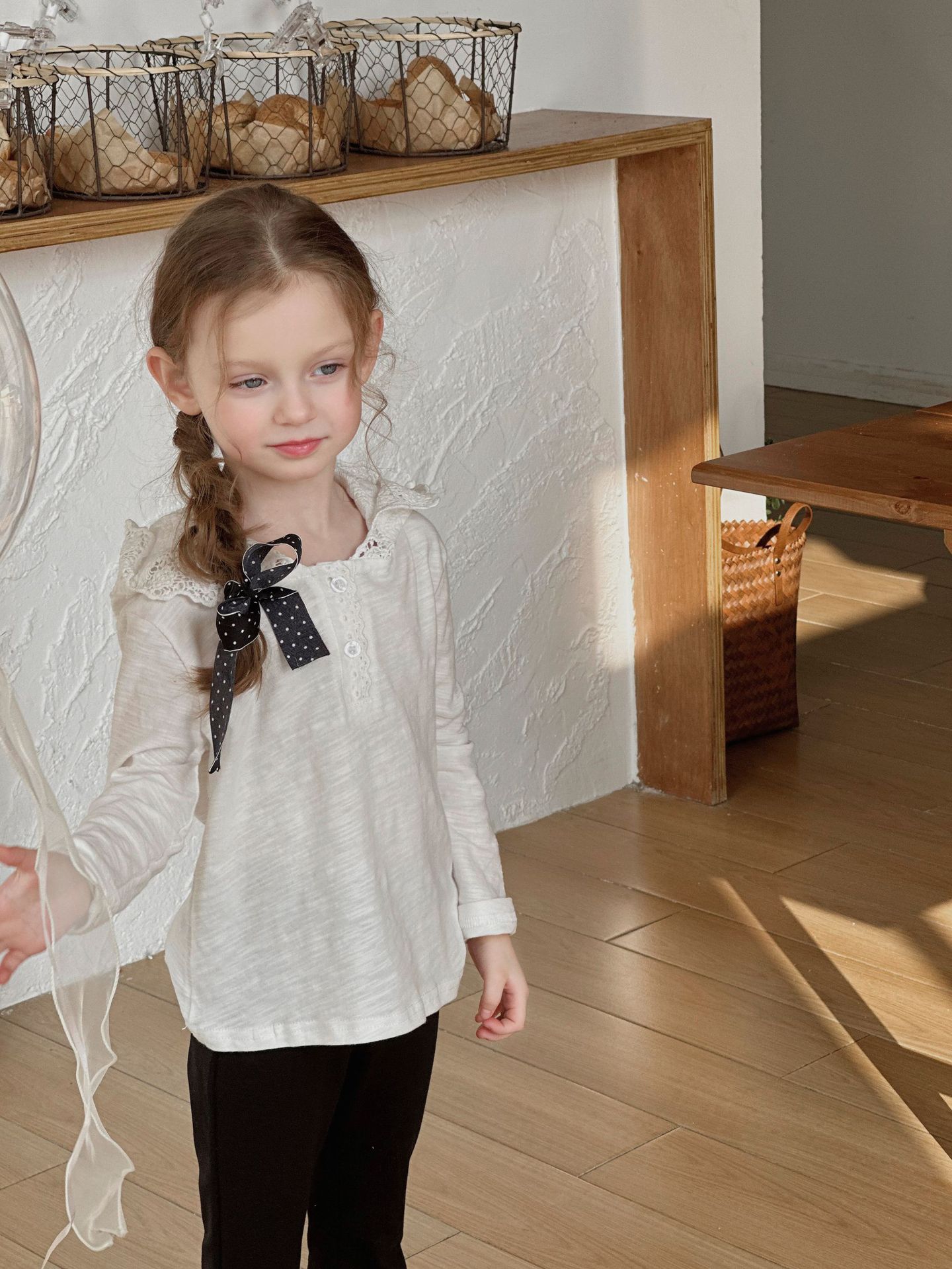 밀밭 시즌 2024 봄 새 여자 긴팔 티셔츠 한국면 레이스 후드 탑 아동베이스 셔츠스토어 가기