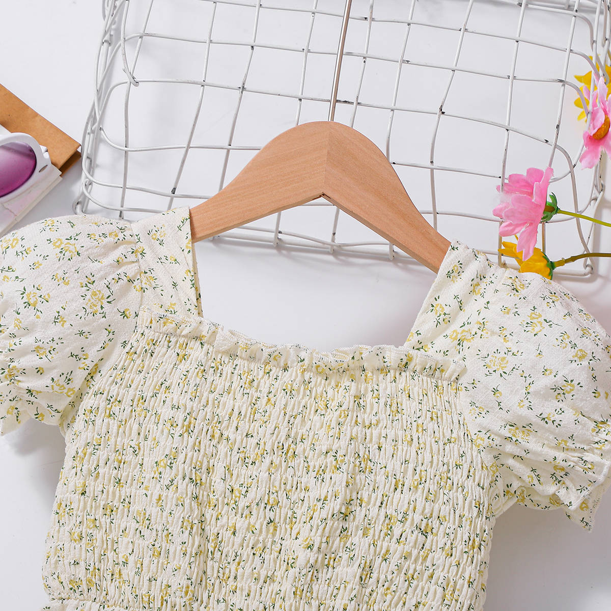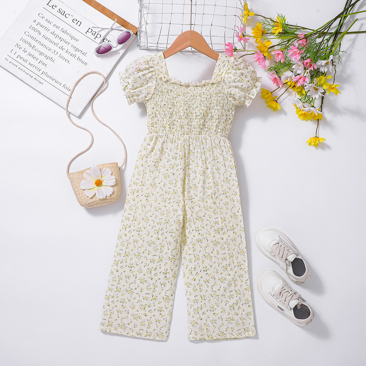 한국 스타일 소녀의 여름 꽃 하카이 등반웨어 반팔 하이 허리 러플 점프 수트
