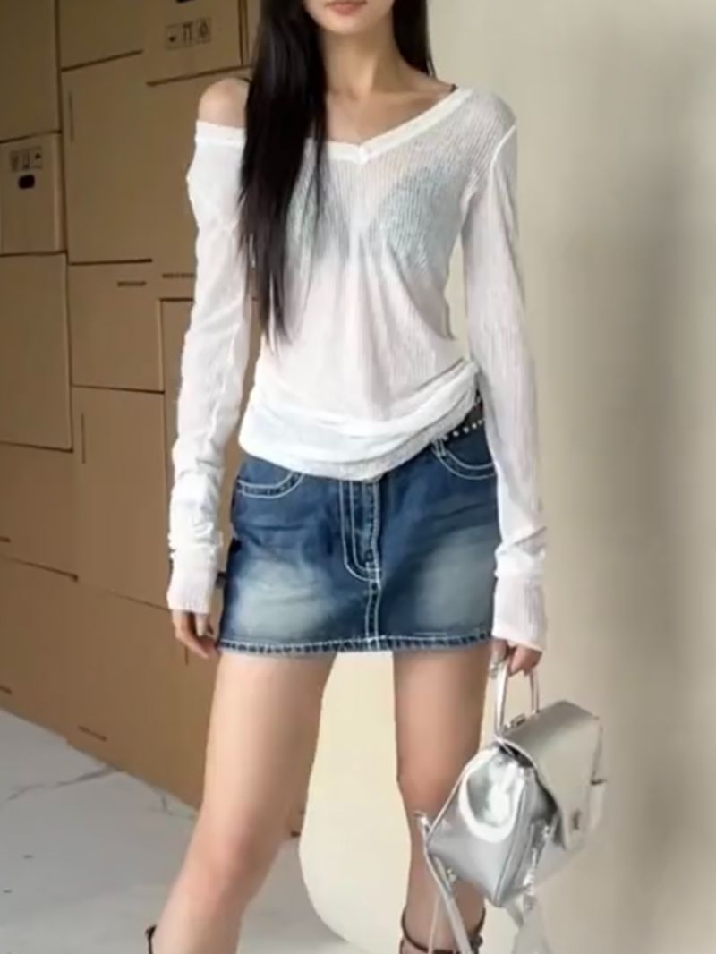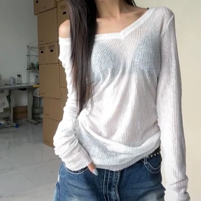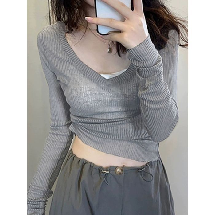 재닌 선 스크린 블라우스 미국 레트로 V 넥 긴 소매 티셔츠 여성용 얇은 순수 스파이스 소녀 틈새 내베이스 셔츠스토어 가기