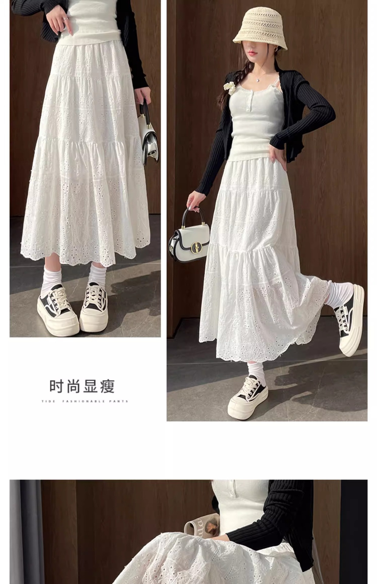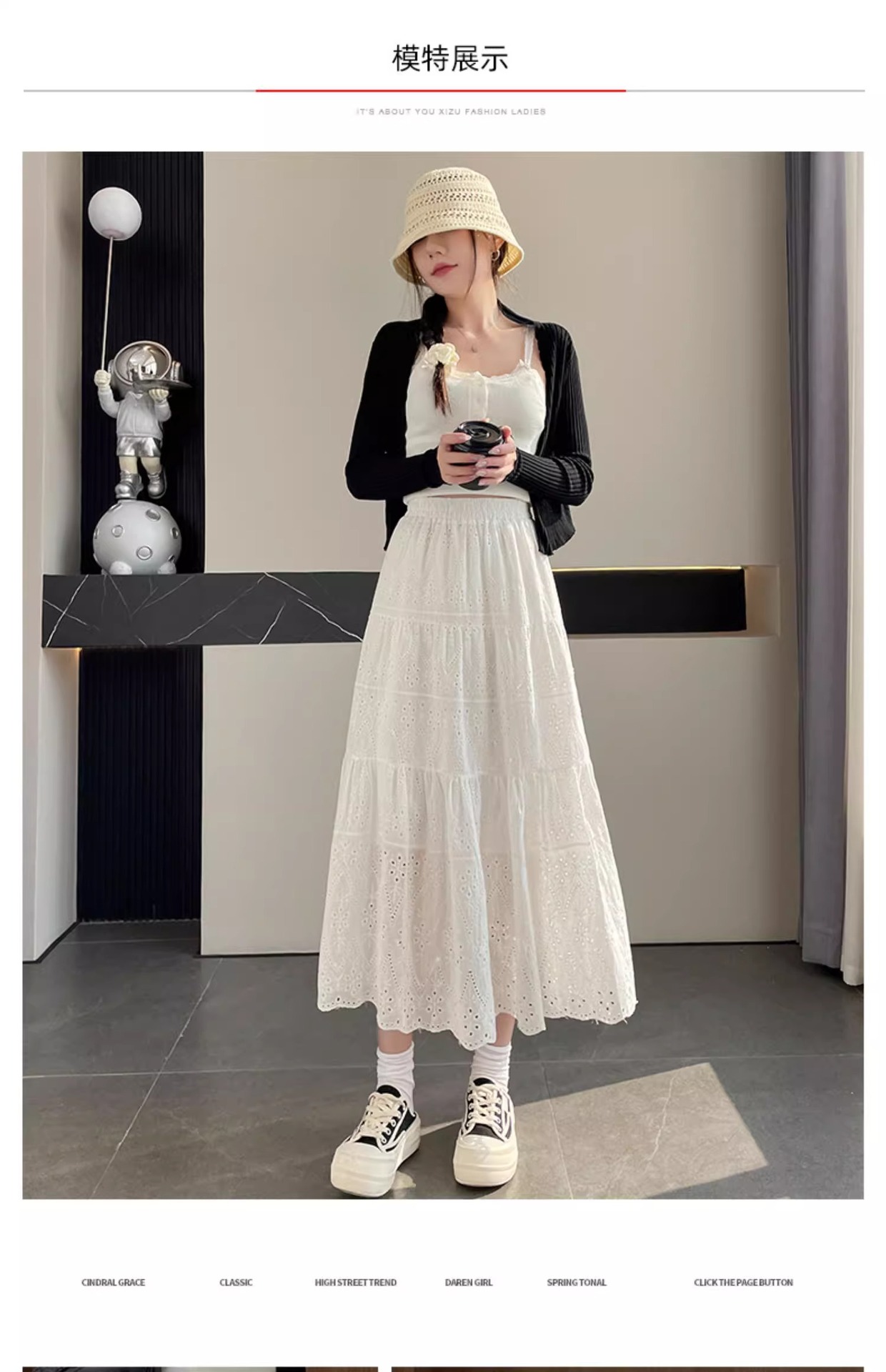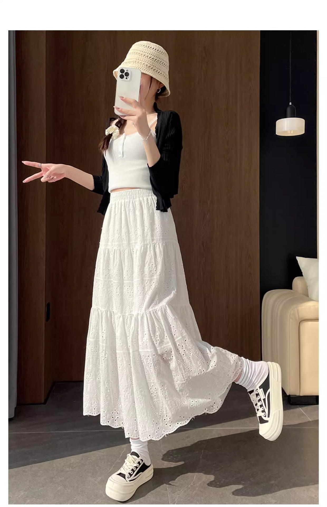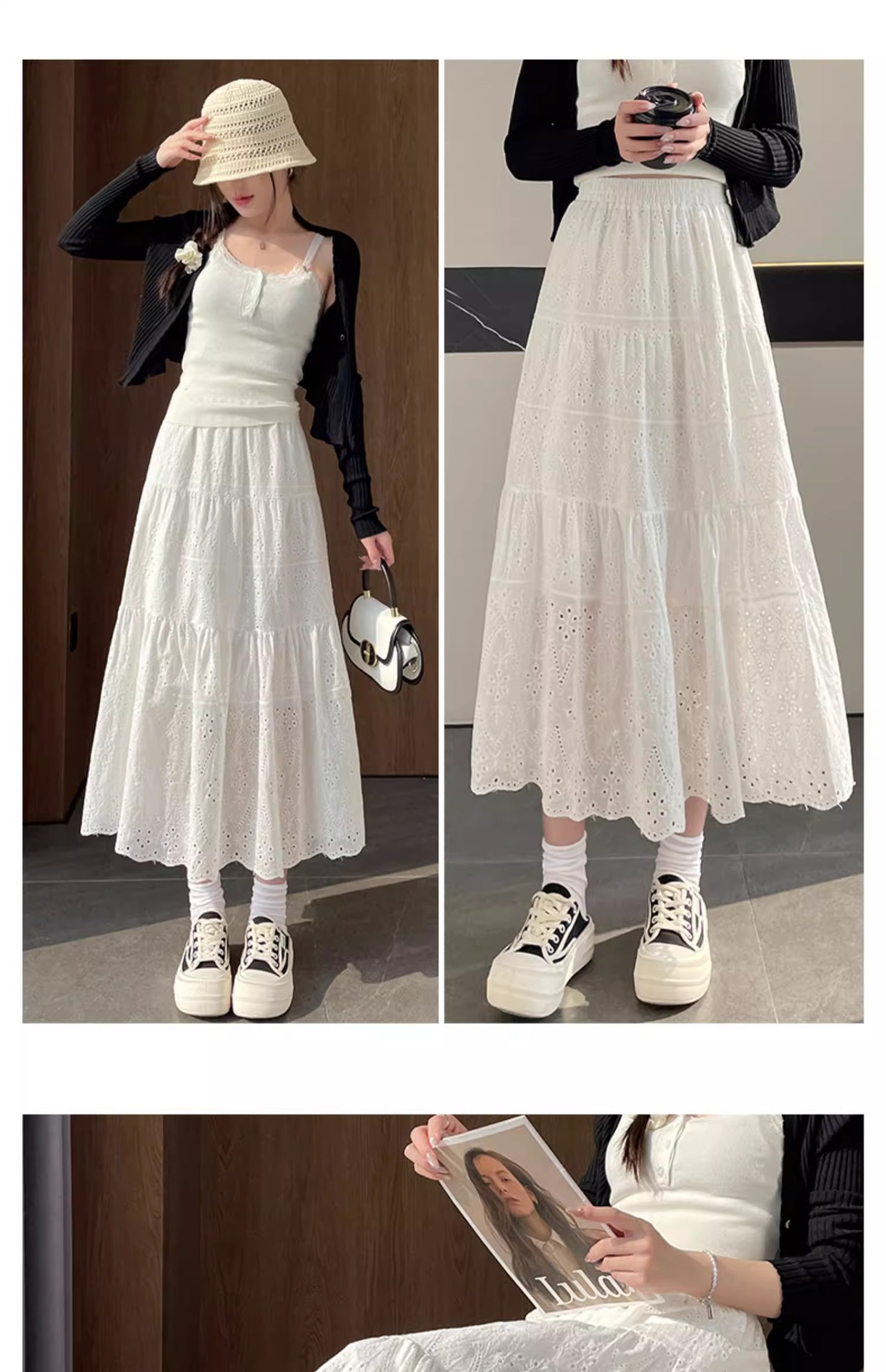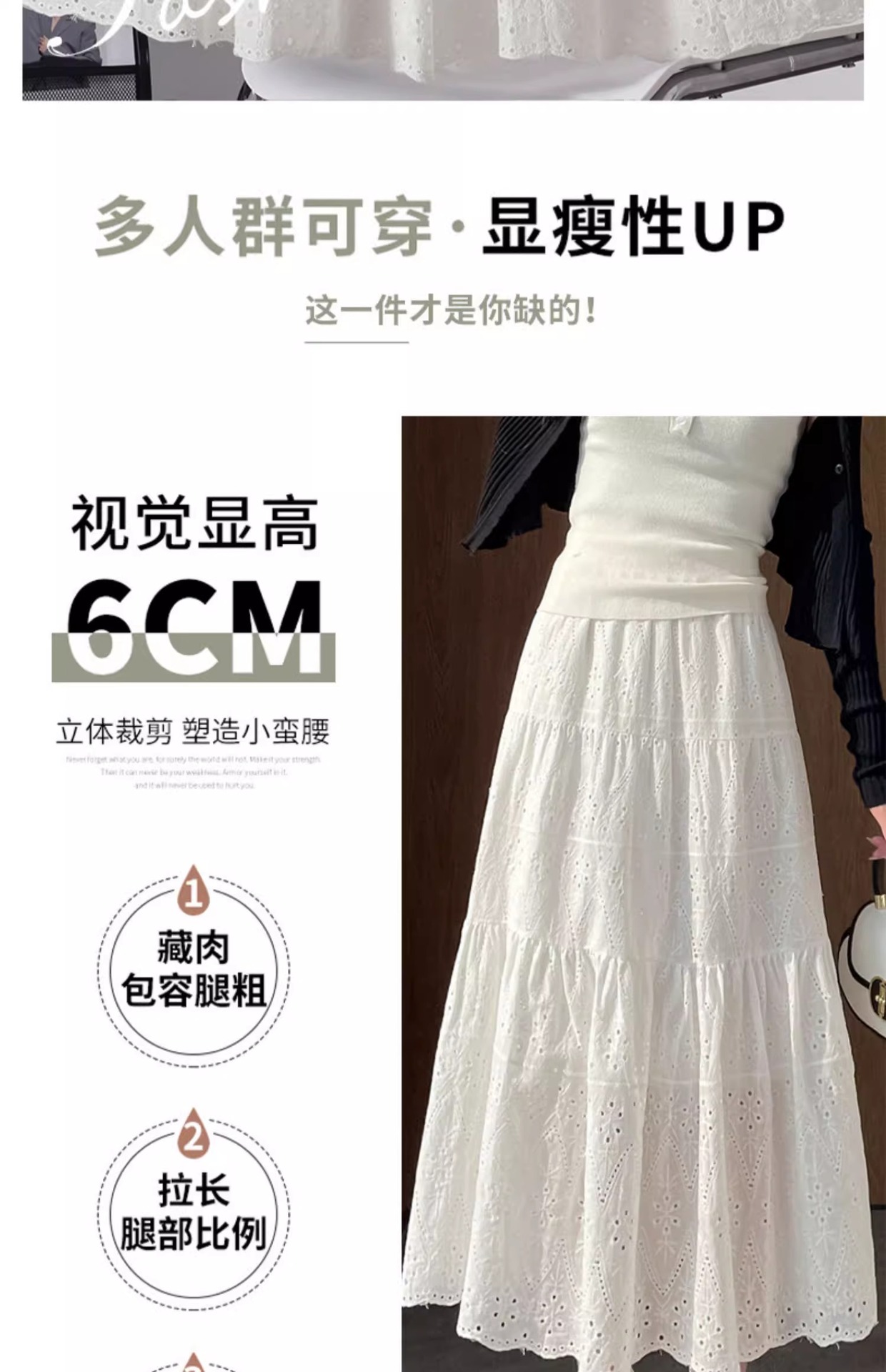 【오리지널 원단】화이트 스커트, 여름용 미디 스커트, 슬림핏, 펀칭 디자인, 여성용 스커트, 넓은 밑단