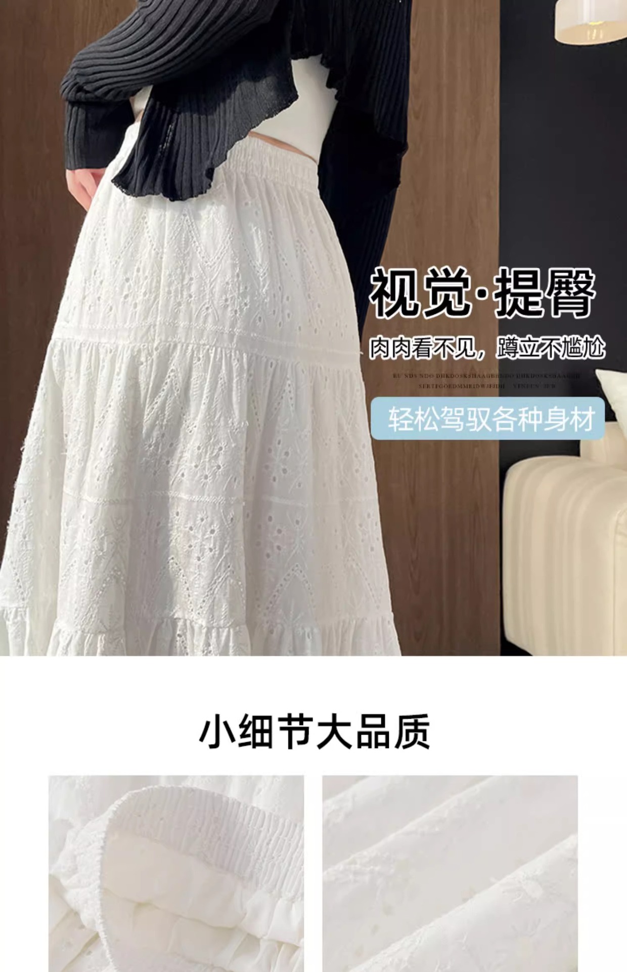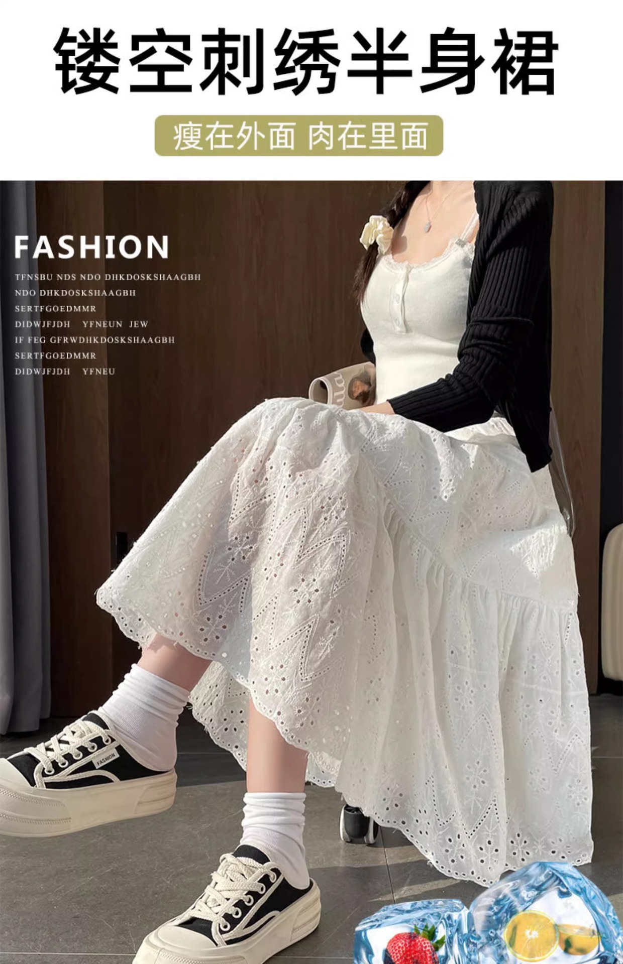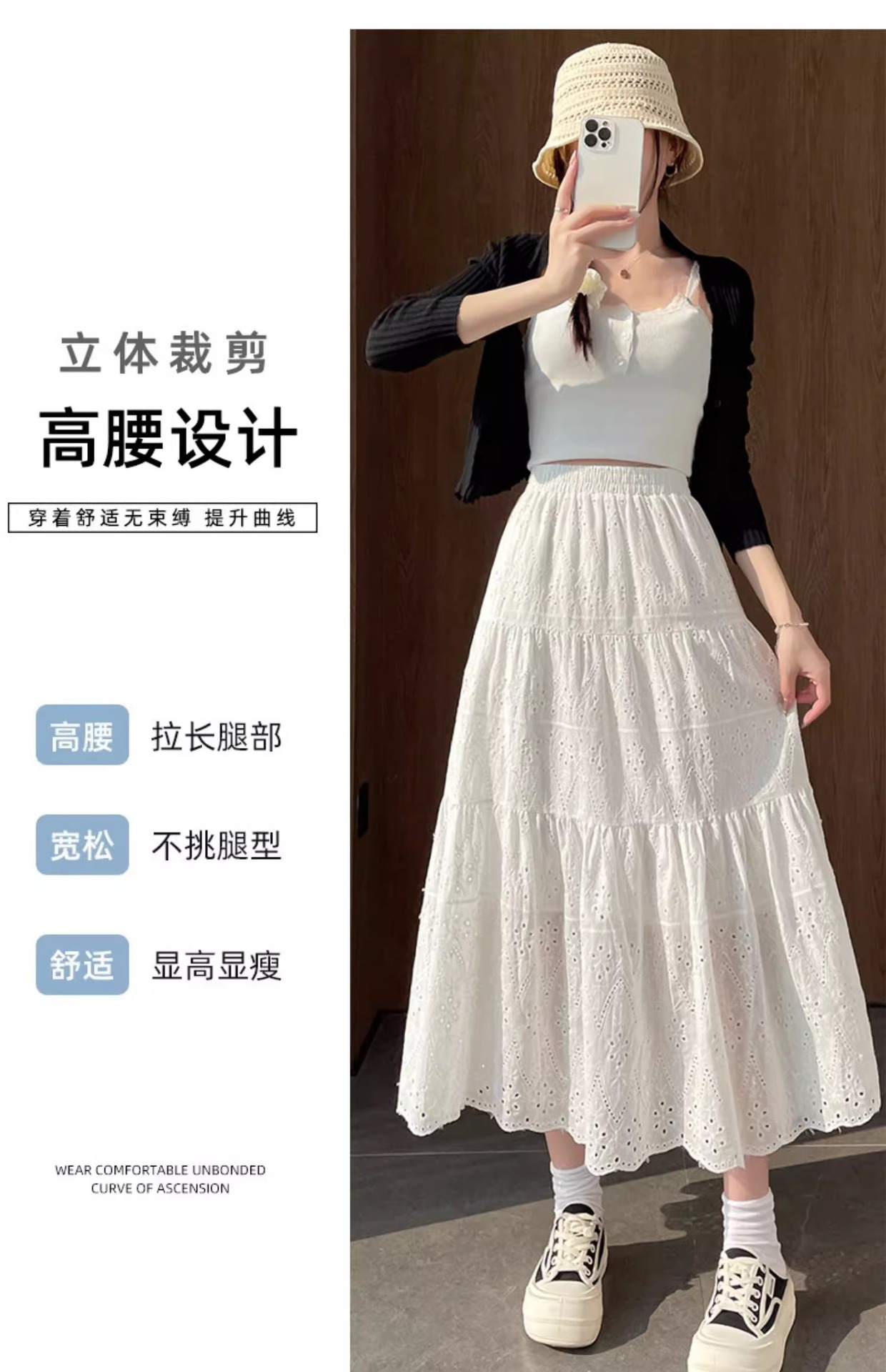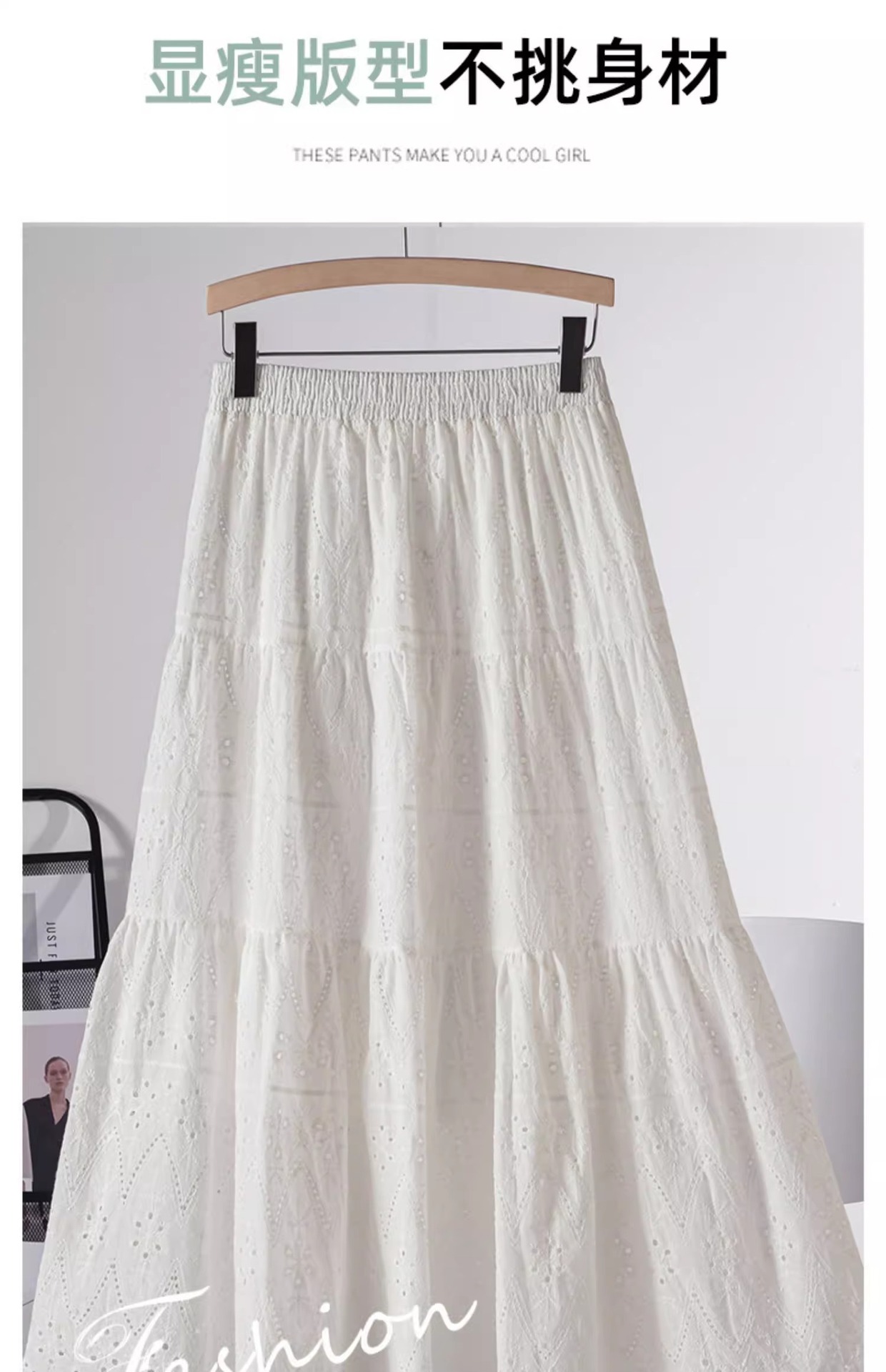 【오리지널 원단】화이트 스커트, 여름용 미디 스커트, 슬림핏, 펀칭 디자인, 여성용 스커트, 넓은 밑단