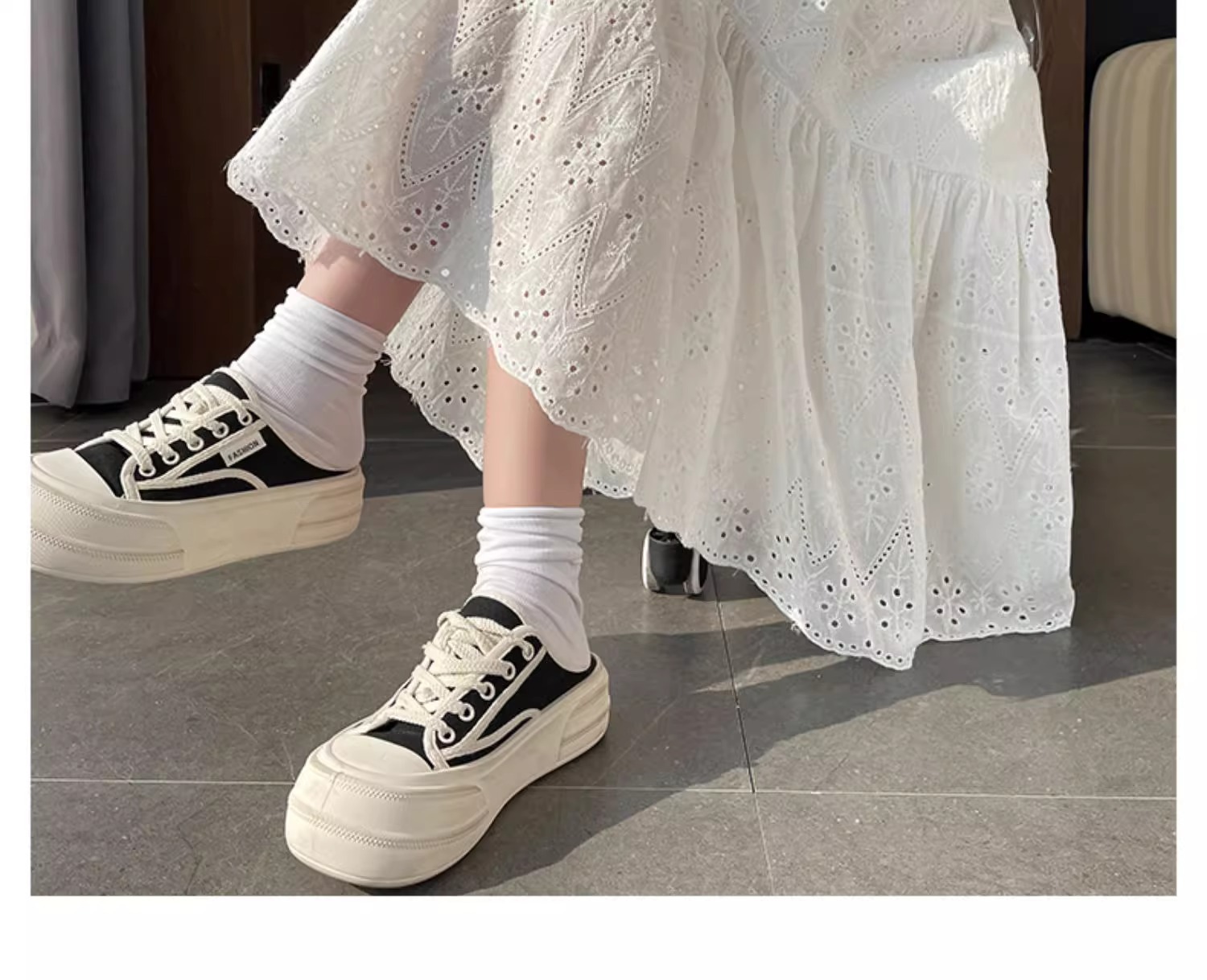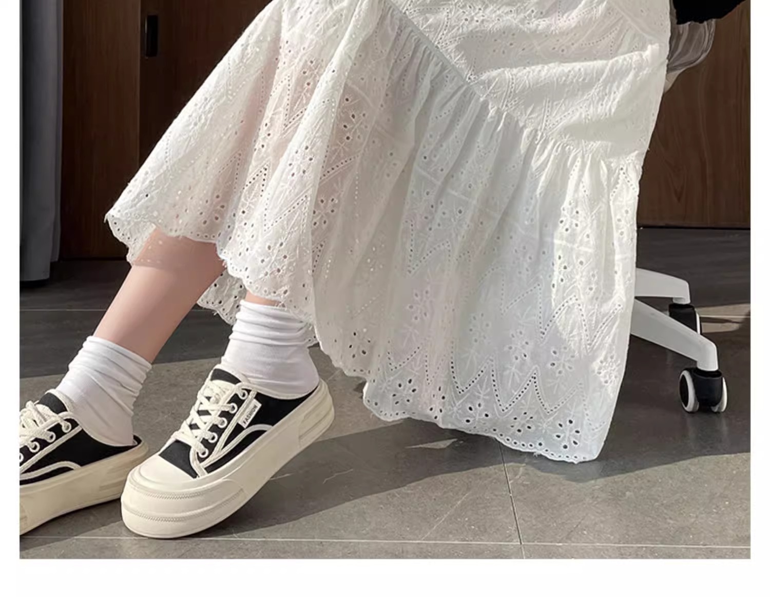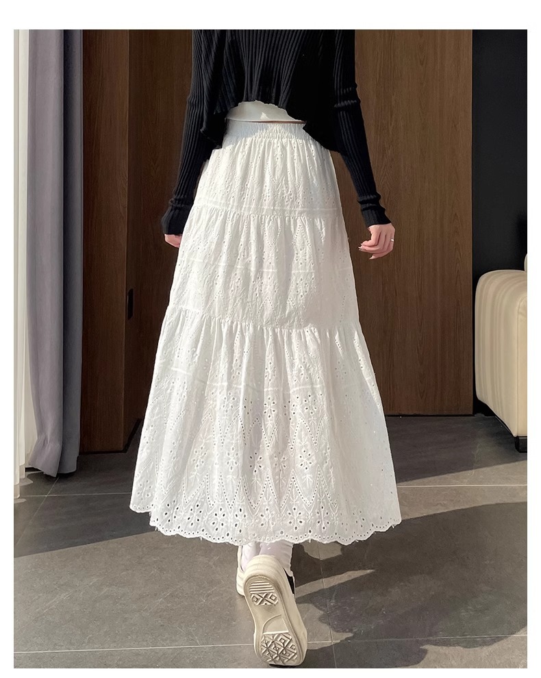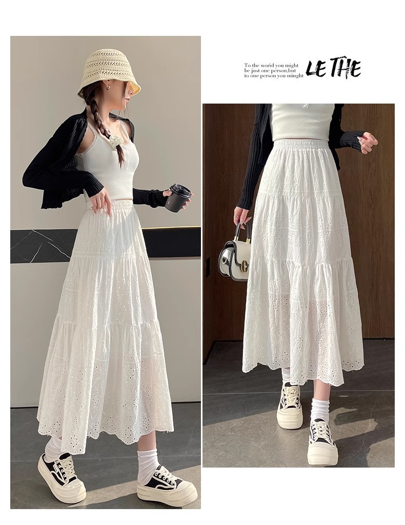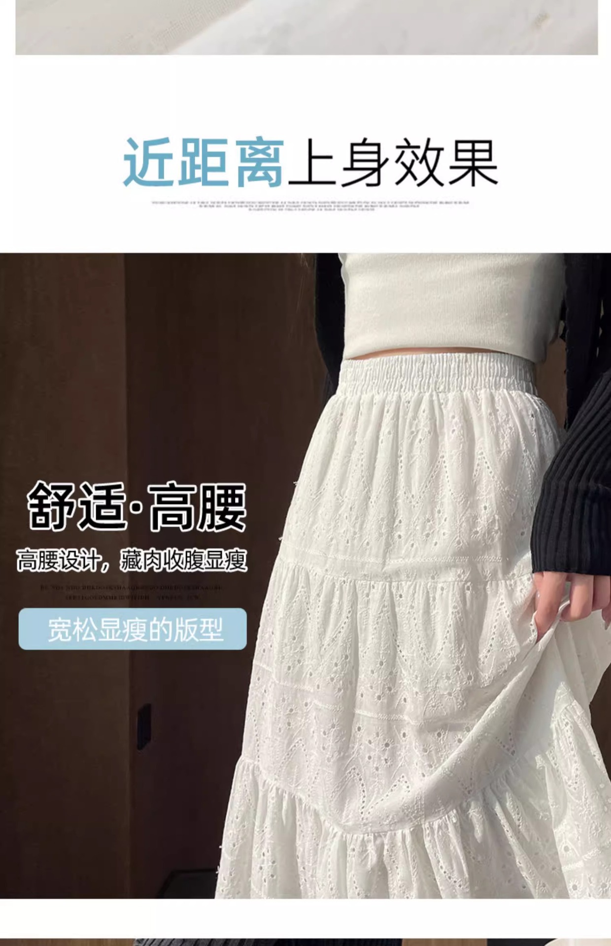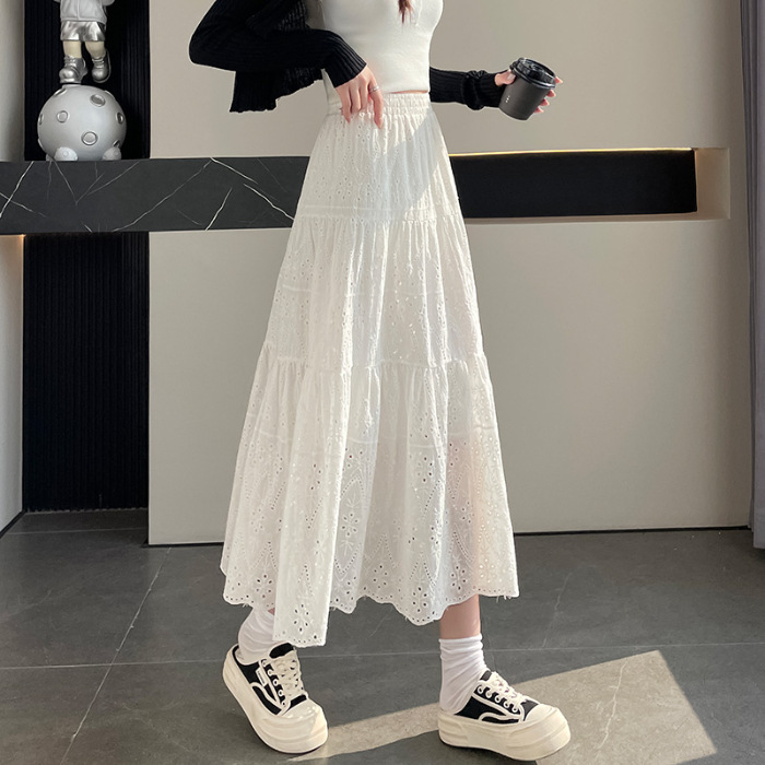 【오리지널 원단】화이트 스커트, 여름용 미디 스커트, 슬림핏, 펀칭 디자인, 여성용 스커트, 넓은 밑단