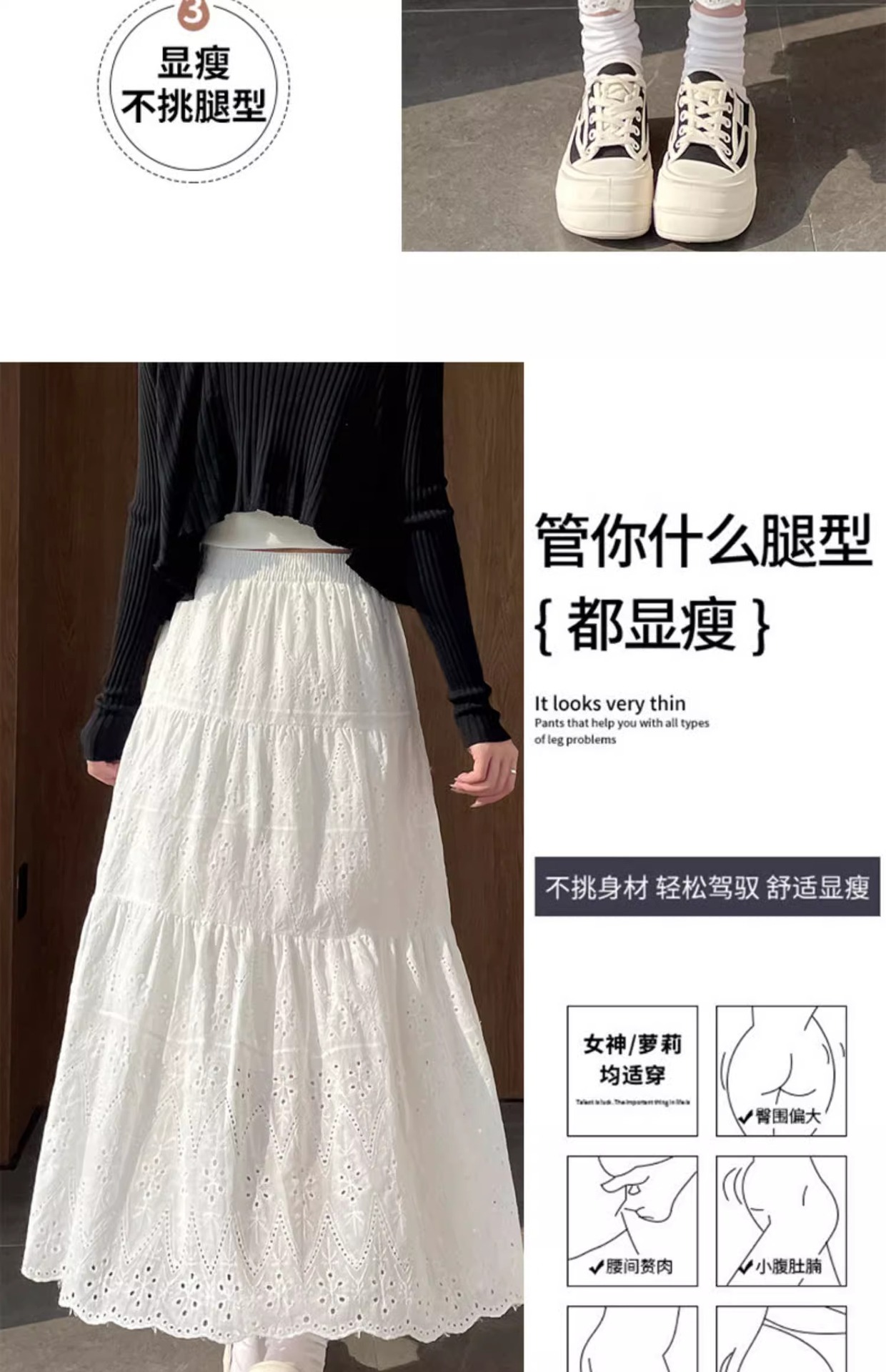 【오리지널 원단】화이트 스커트, 여름용 미디 스커트, 슬림핏, 펀칭 디자인, 여성용 스커트, 넓은 밑단스토어 가기