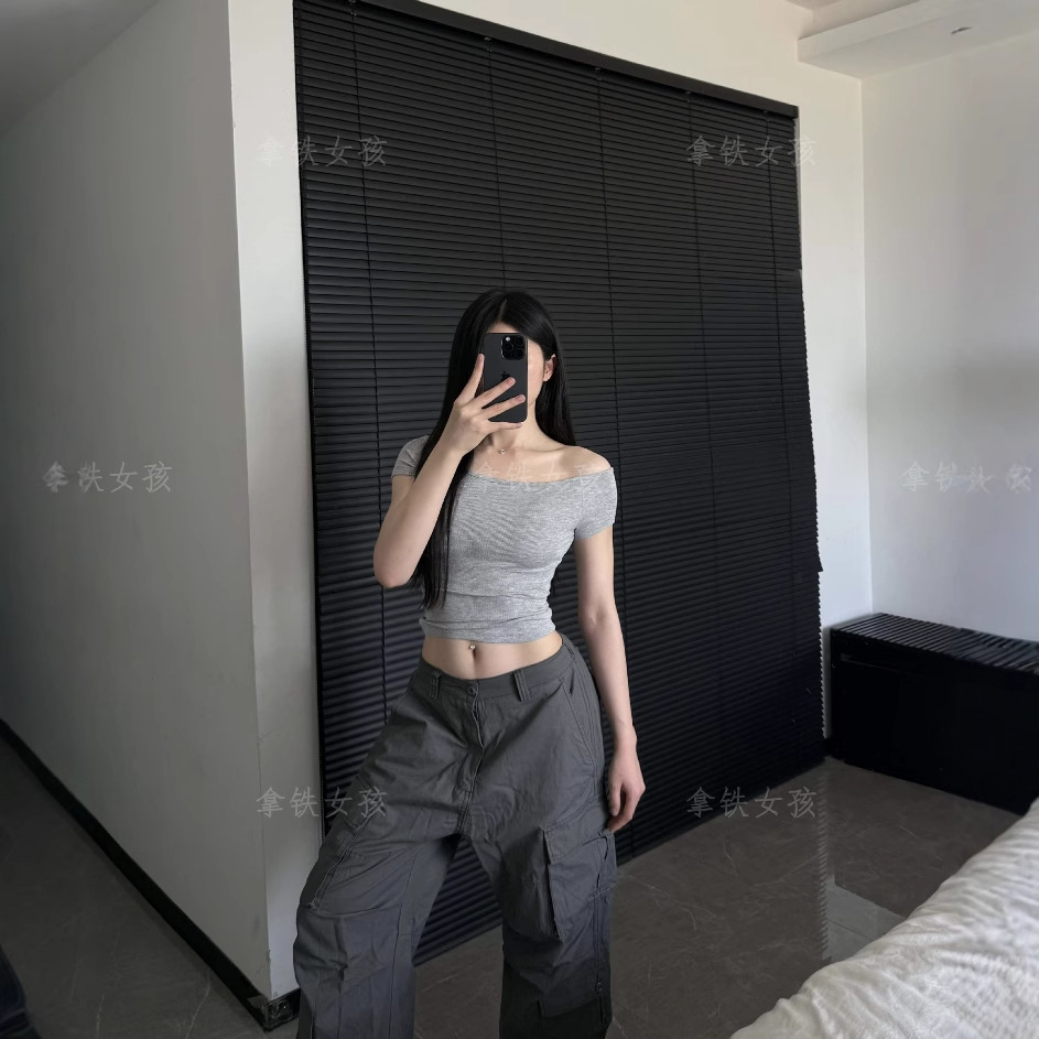 라떼 걸 원 숄더 비스듬한 어깨 반팔 티셔츠 여성 여름 오프 숄더 스레드 스트레치 매력 짧은 캐주얼 다목적스토어 가기