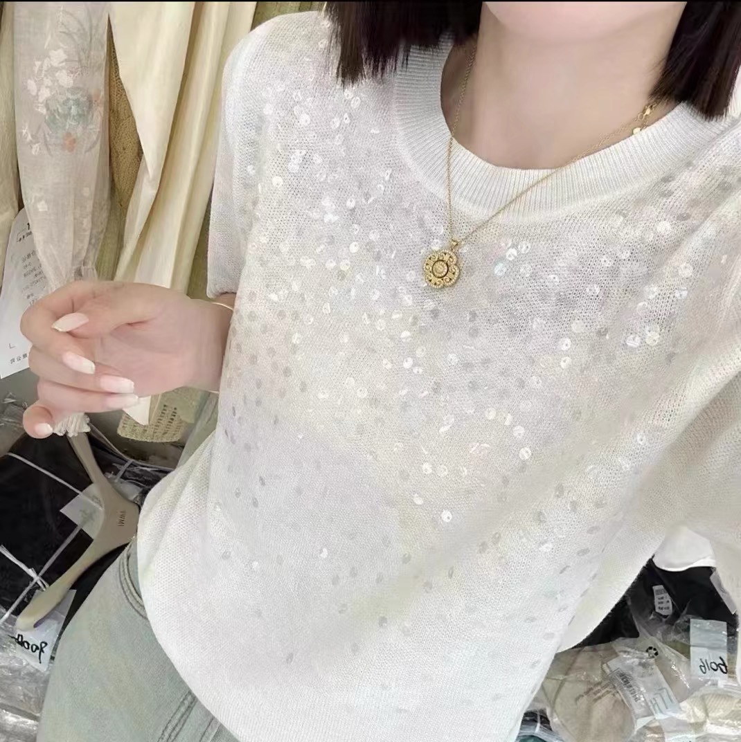 2024 여름 새로운 패션 간단한 기질 하이 엔드 스팽글 올 매치 반팔 울 티셔츠 여성용 스웨터스토어 가기