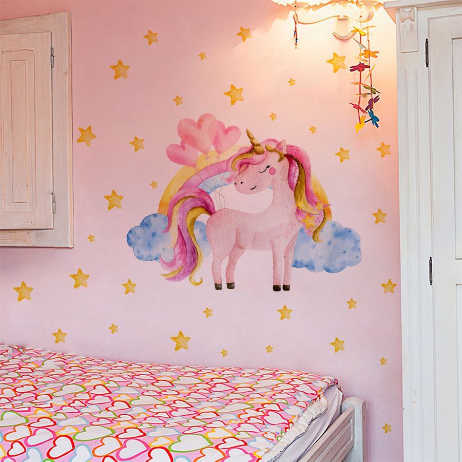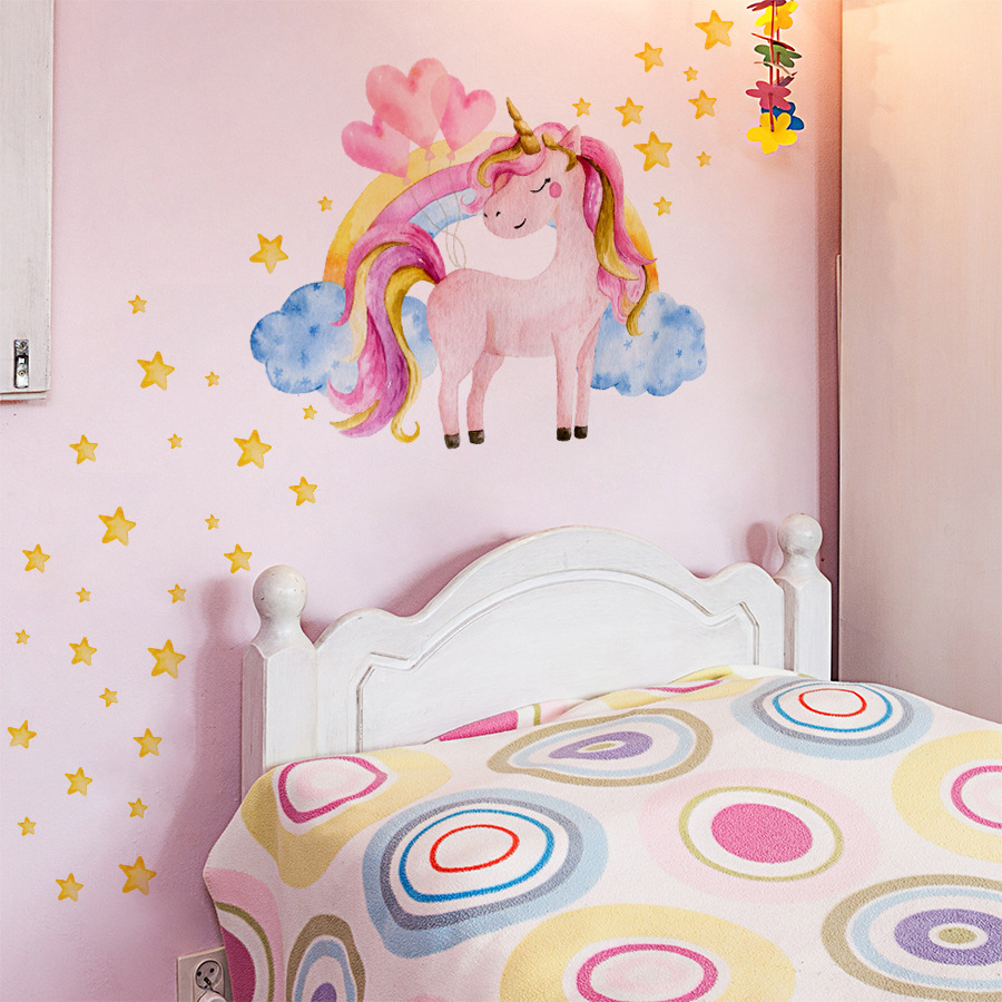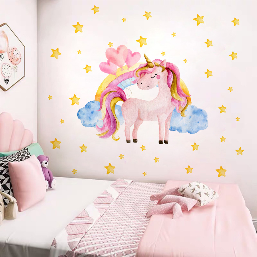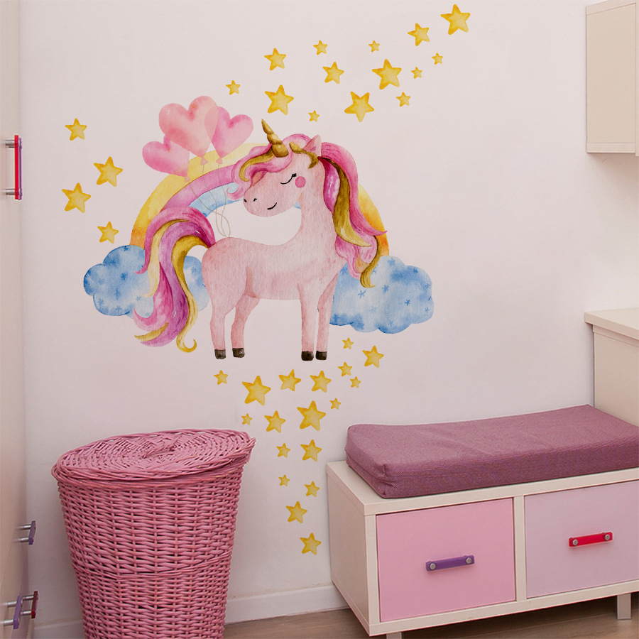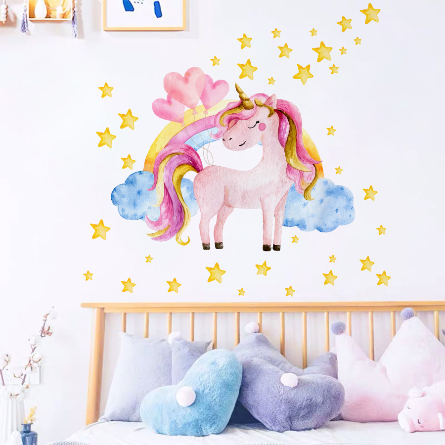 BR3723Q 만화 무지개 풍선 유니콘 스타 자기 접착 애니메이션 벽 스티커 침실 어린이 방 장식 스티커