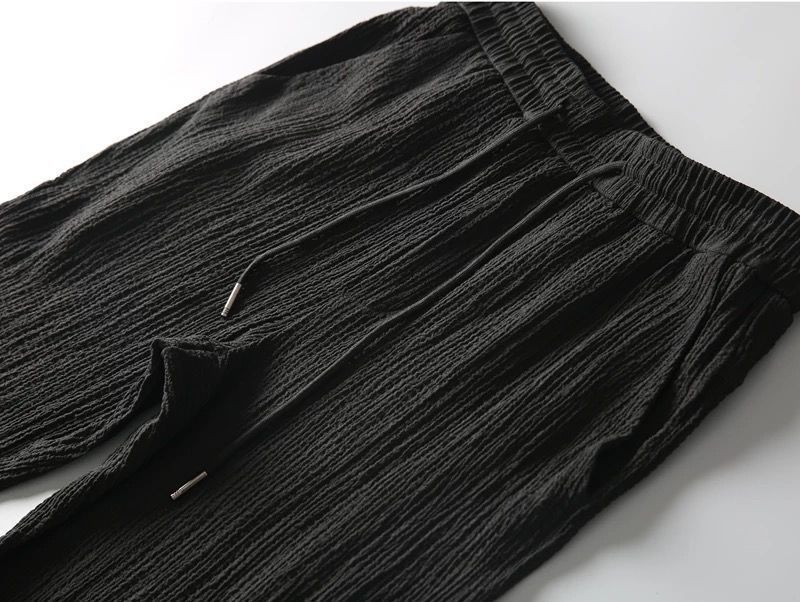 夏季轻奢褶皱休闲运动套装男士轻薄透气时尚翻领短袖长裤两件套