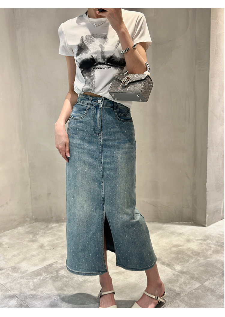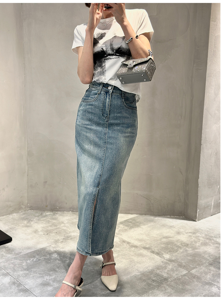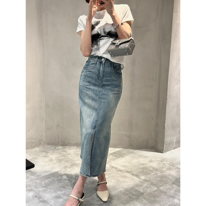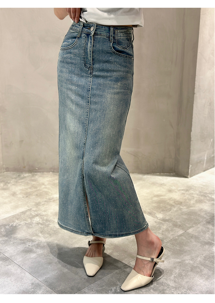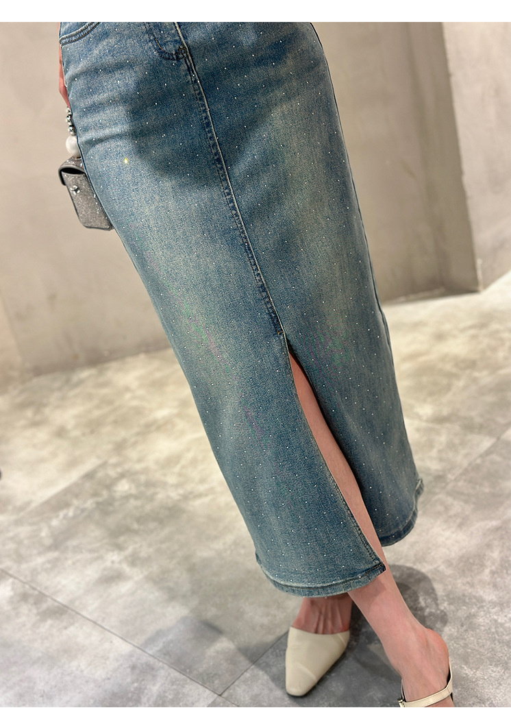 뜨거운 드릴링 스트레치 패션 데님 스커트 여성의 2024 여름 새로운 높은 허리 슬리밍 중간 길이 A 라인 스플릿 스커트