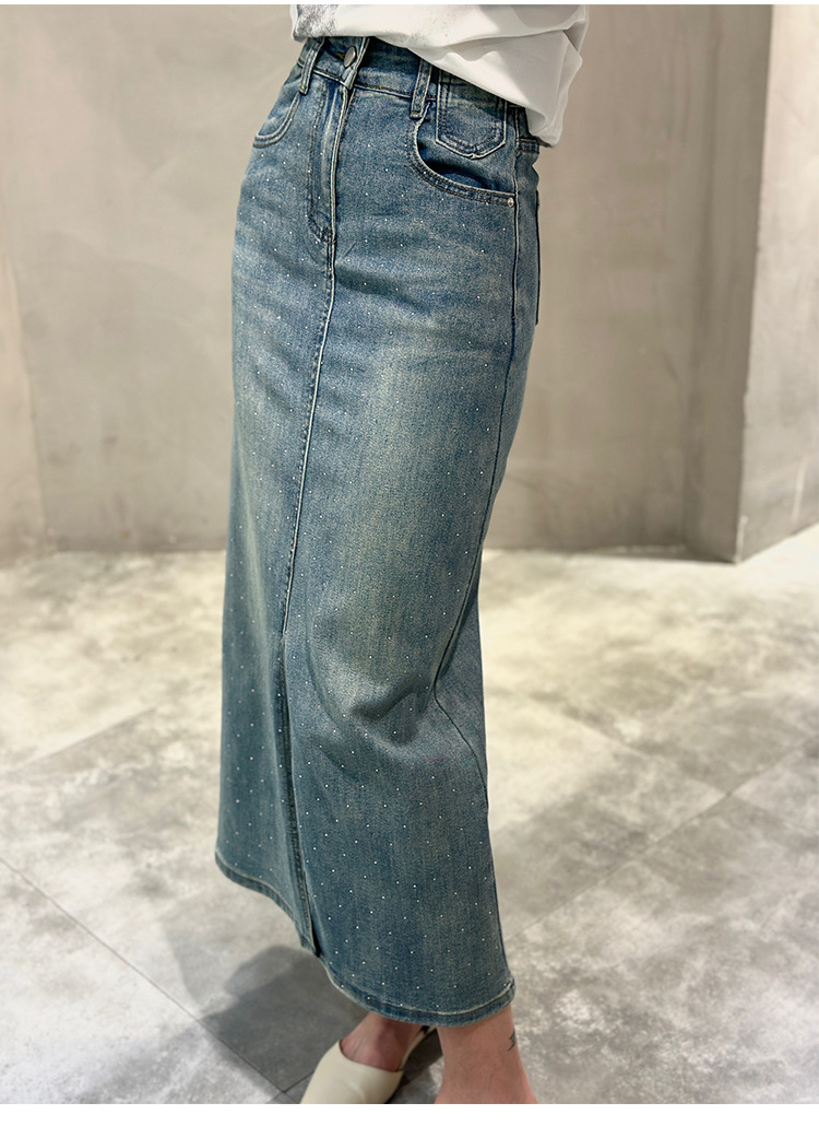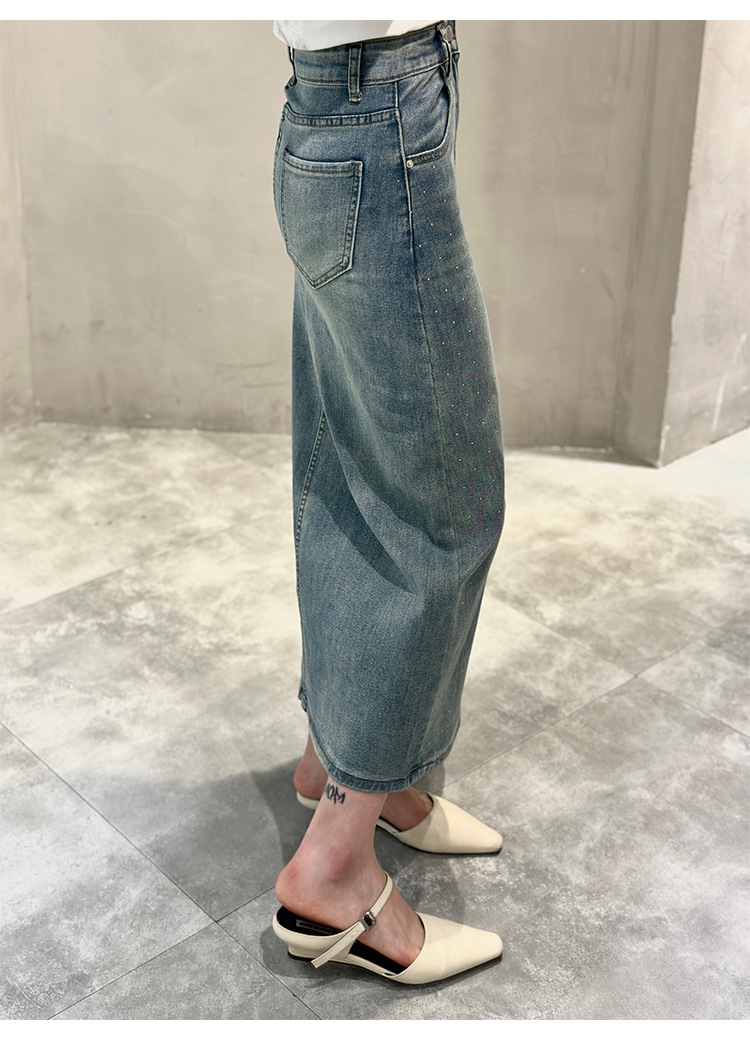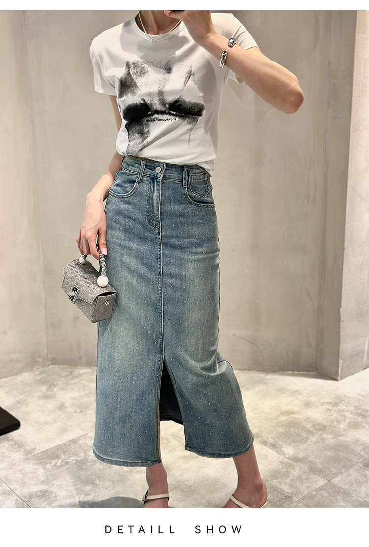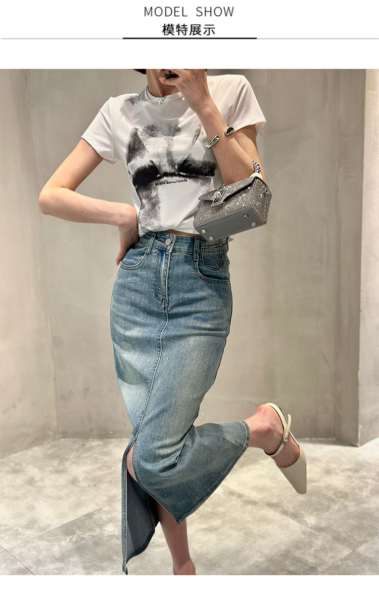 뜨거운 드릴링 스트레치 패션 데님 스커트 여성의 2024 여름 새로운 높은 허리 슬리밍 중간 길이 A 라인 스플릿 스커트
