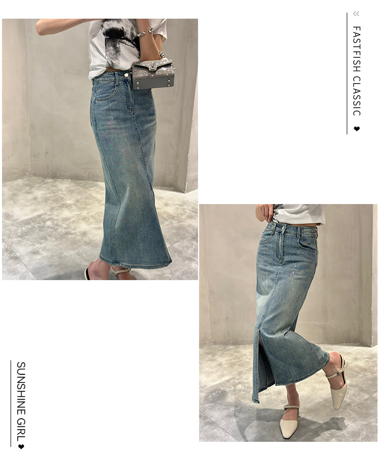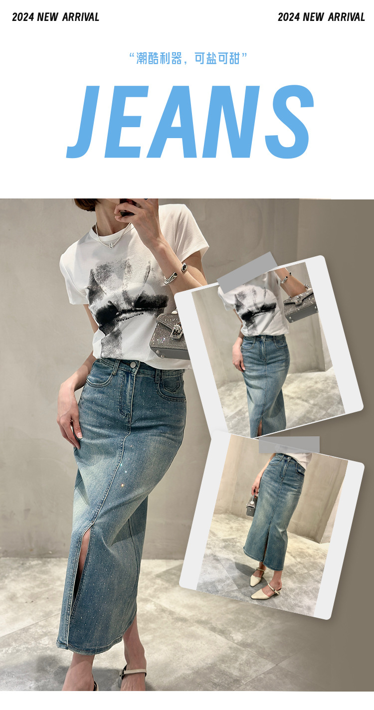 뜨거운 드릴링 스트레치 패션 데님 스커트 여성의 2024 여름 새로운 높은 허리 슬리밍 중간 길이 A 라인 스플릿 스커트스토어 가기