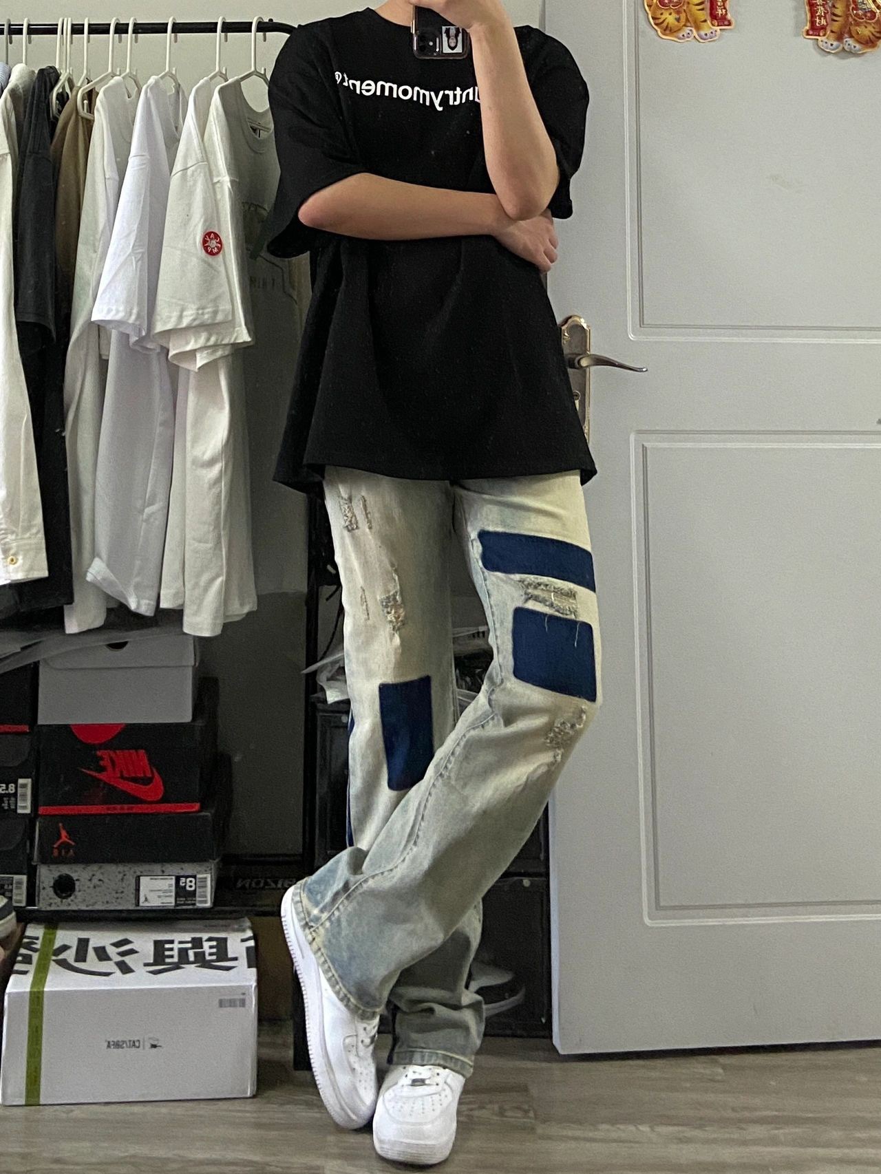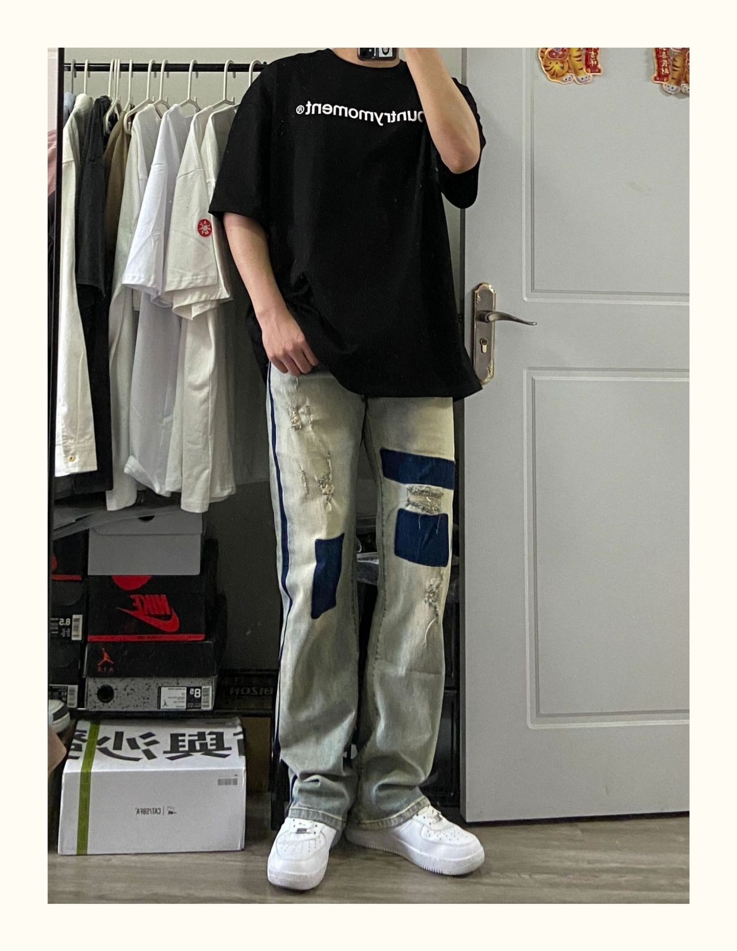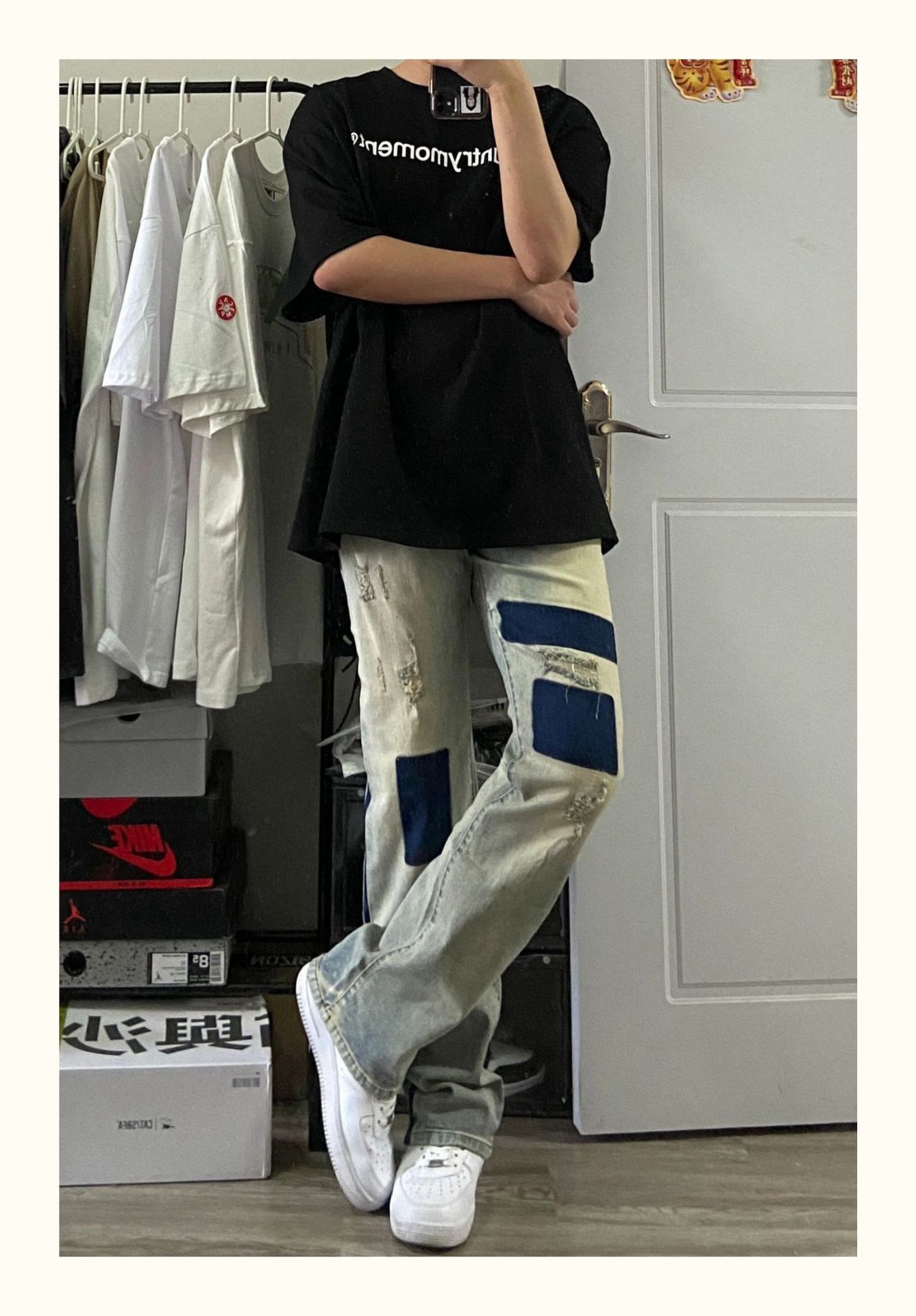 破洞牛仔裤男百搭宽松直筒阔腿混色拼接拖地贴布黄泥色裤子潮贴补