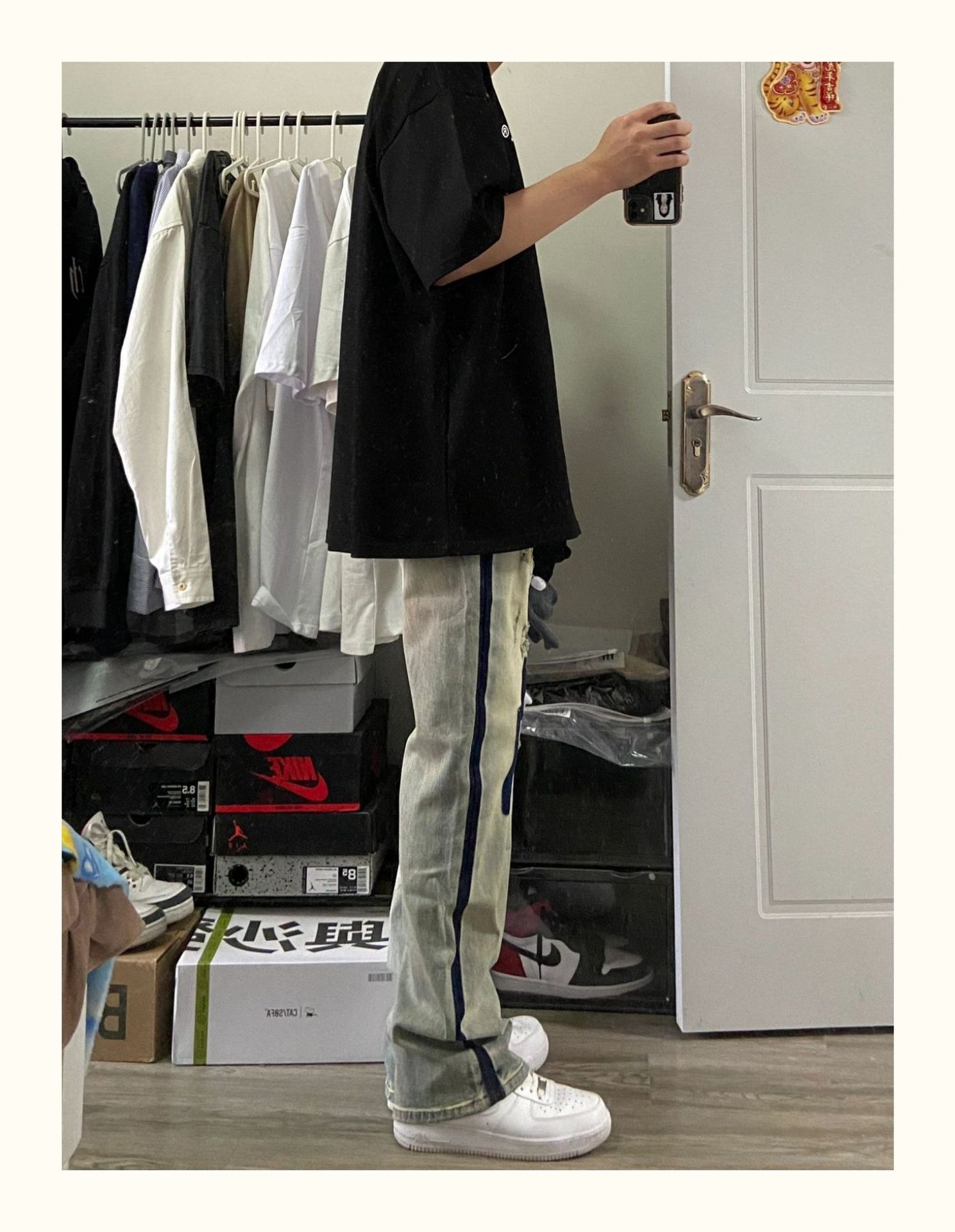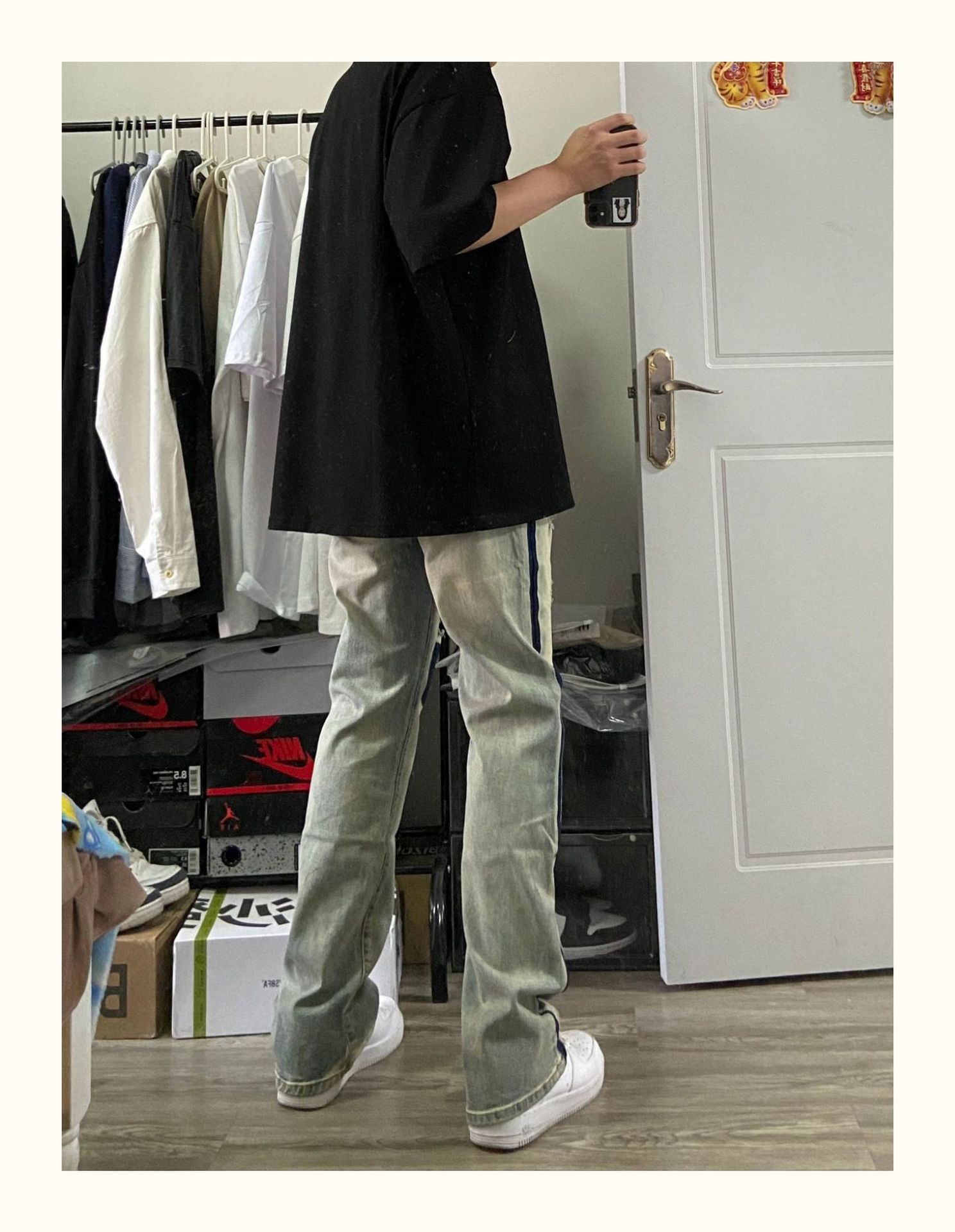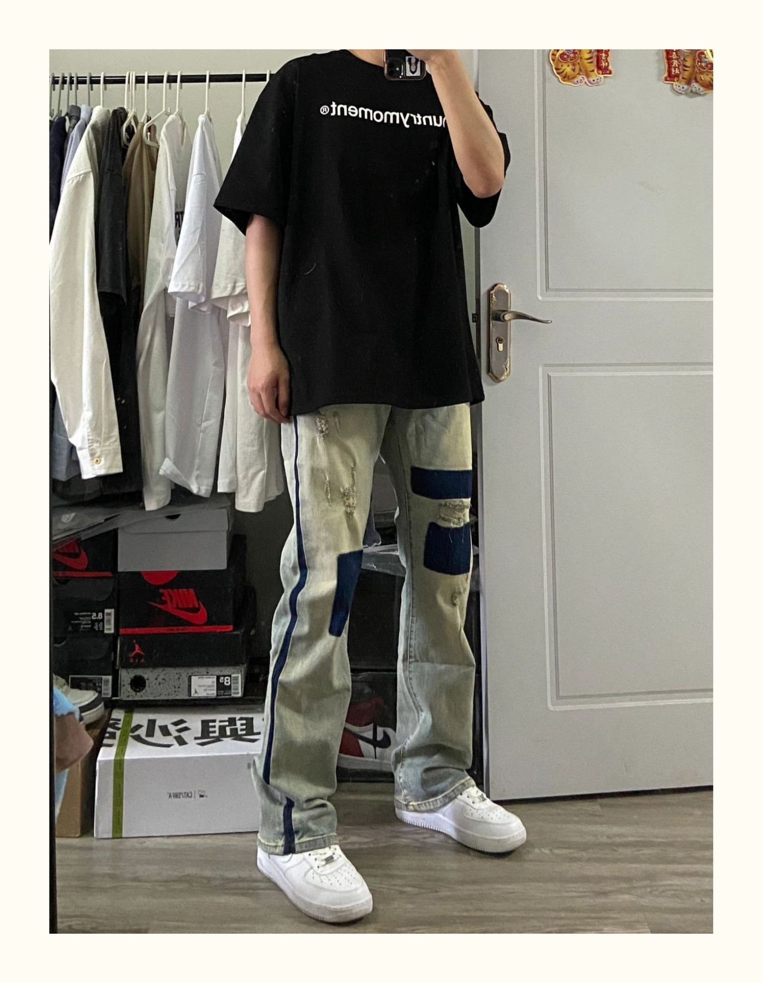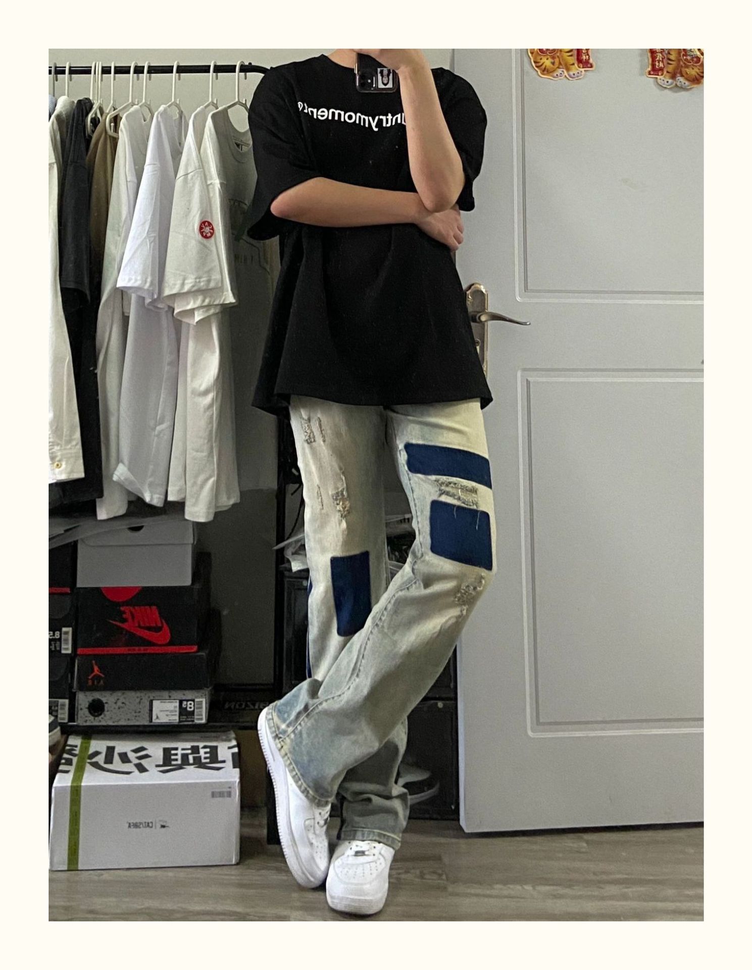 破洞牛仔裤男百搭宽松直筒阔腿混色拼接拖地贴布黄泥色裤子潮贴补