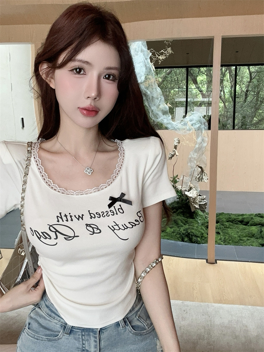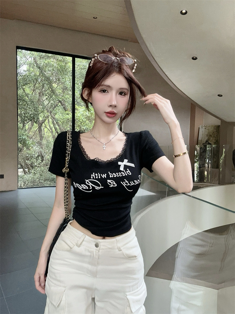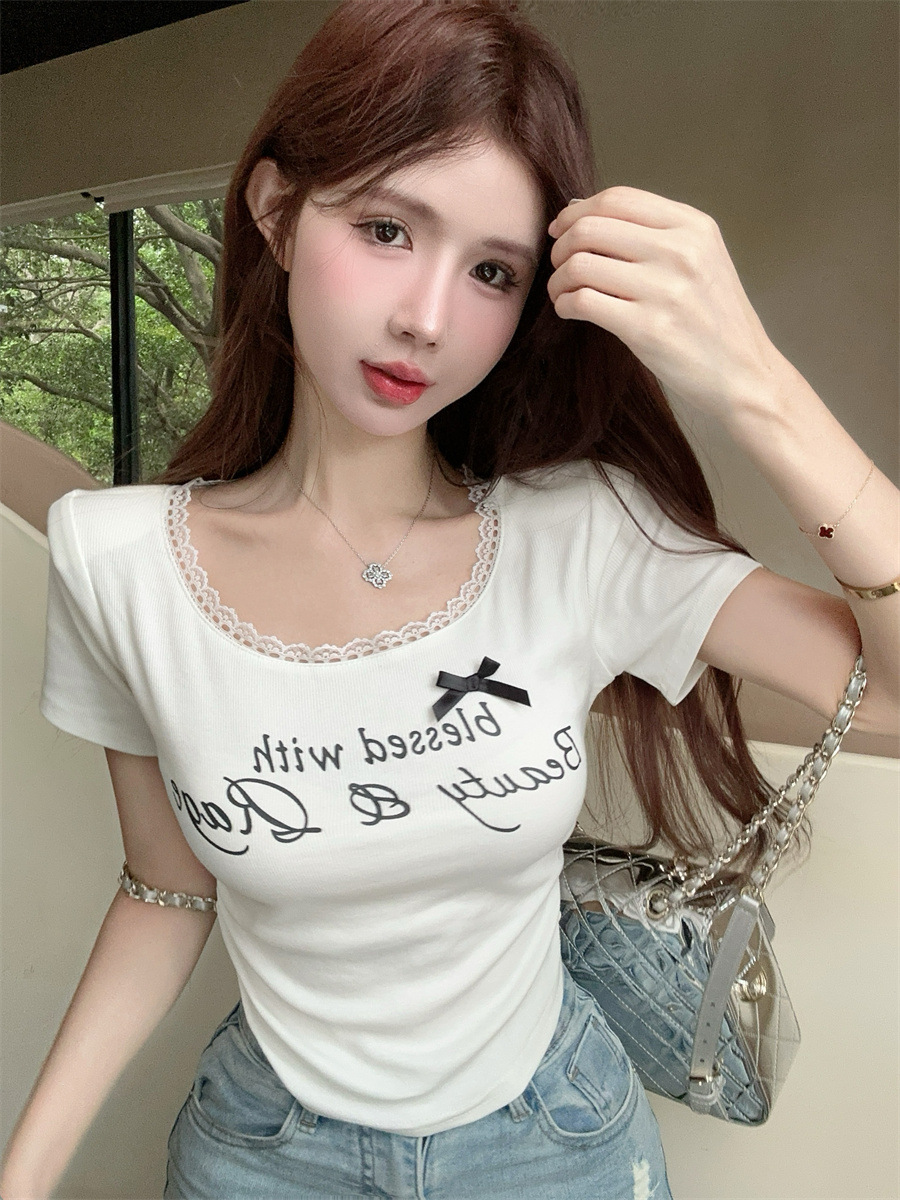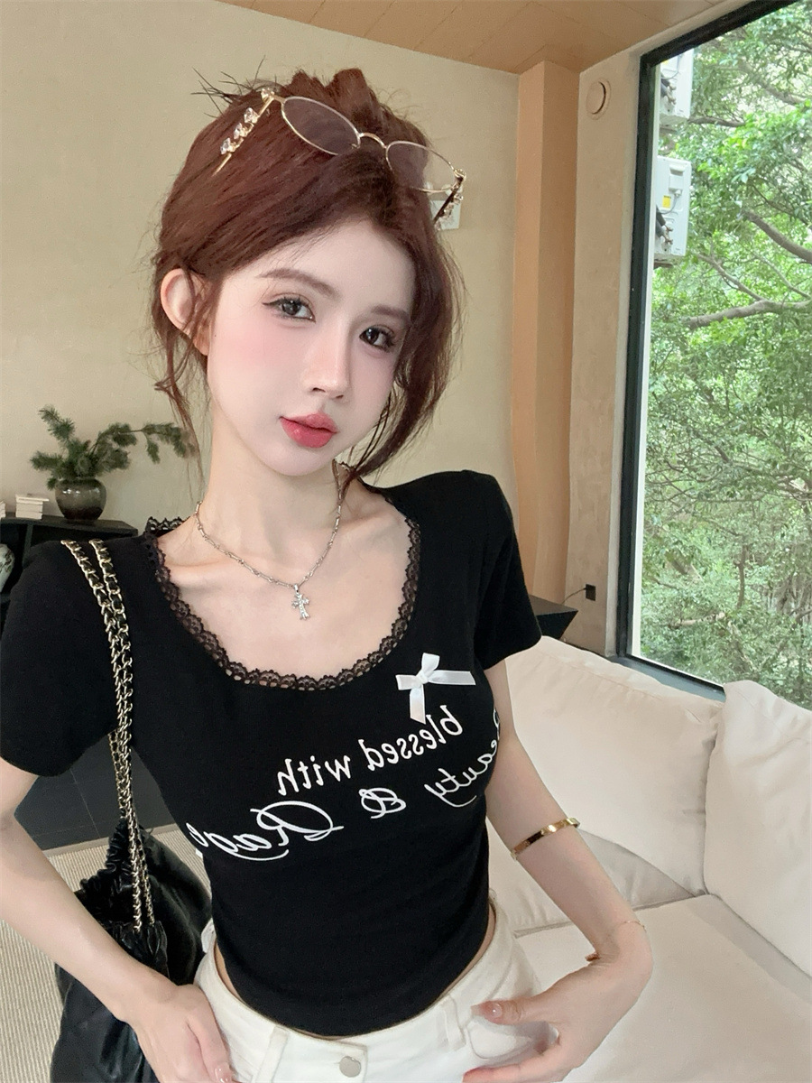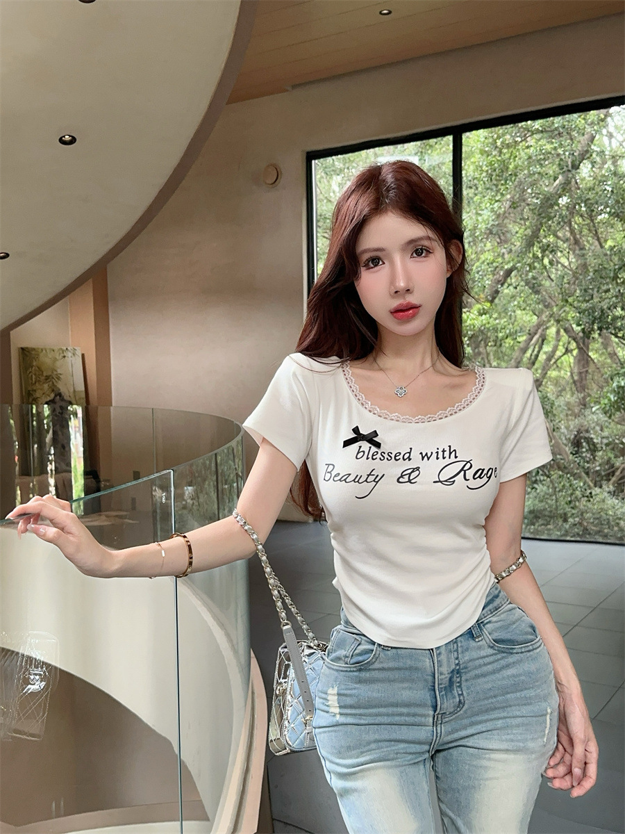 아메리칸 스타일 여름 디자인 새로운 도착 짧은 레이스 인쇄 짧은 소매 티셔츠 레이스 2024 슬림 핏 핫 걸탑