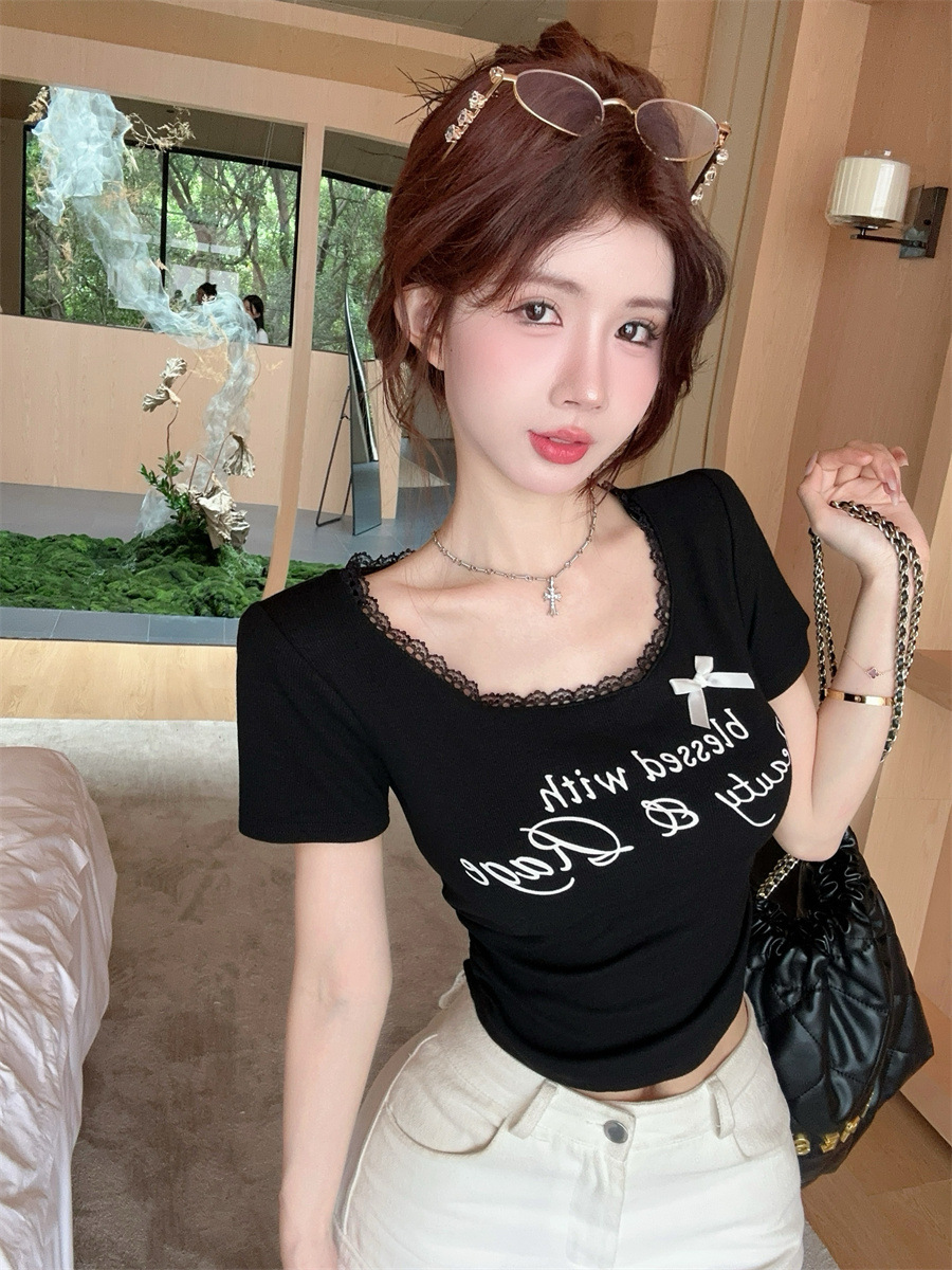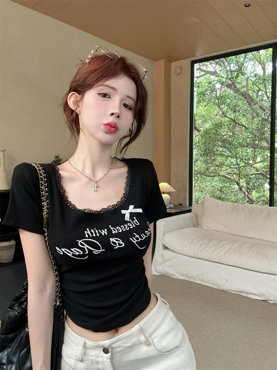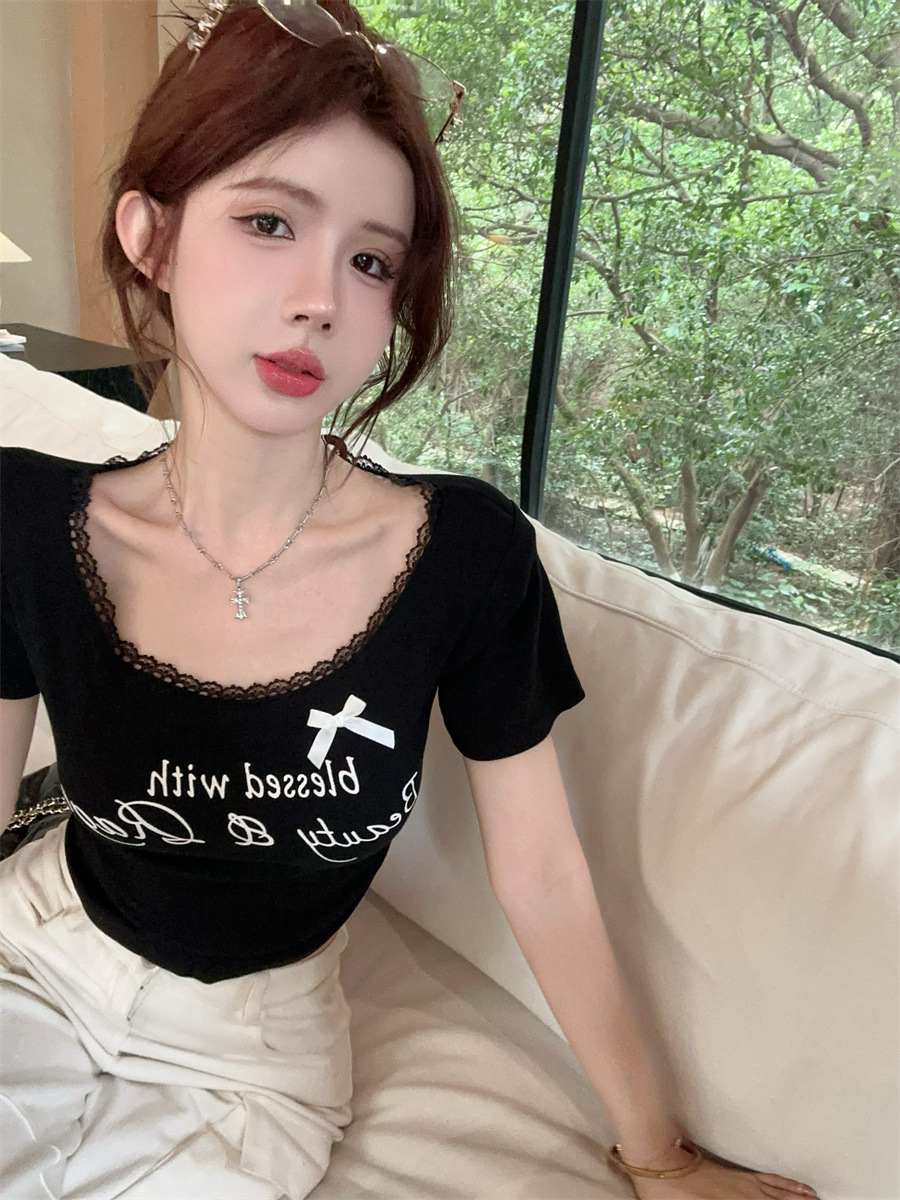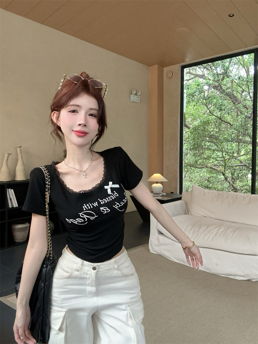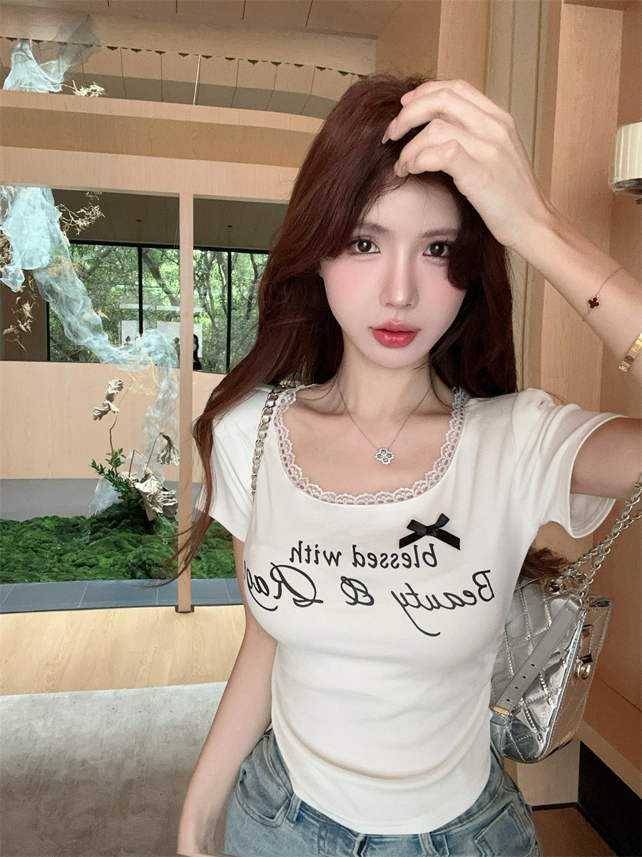 아메리칸 스타일 여름 디자인 새로운 도착 짧은 레이스 인쇄 짧은 소매 티셔츠 레이스 2024 슬림 핏 핫 걸탑