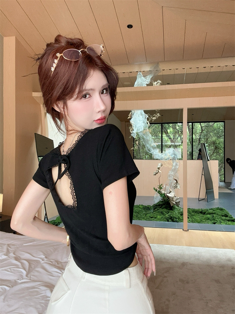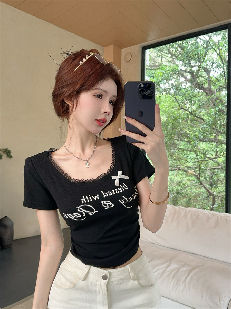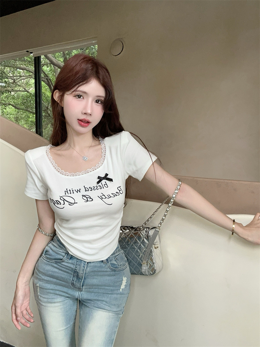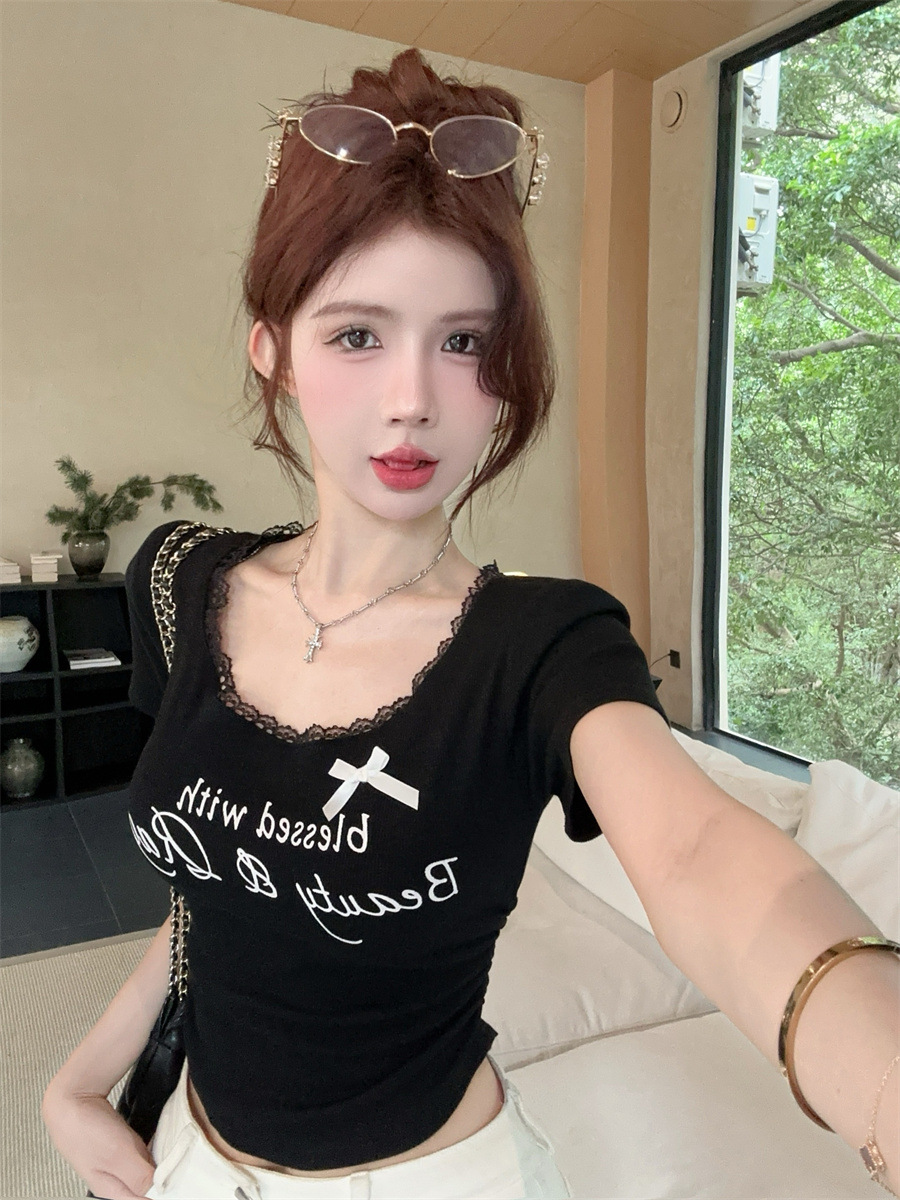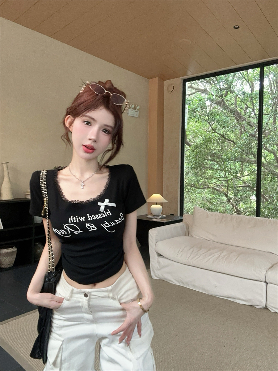 아메리칸 스타일 여름 디자인 새로운 도착 짧은 레이스 인쇄 짧은 소매 티셔츠 레이스 2024 슬림 핏 핫 걸탑
