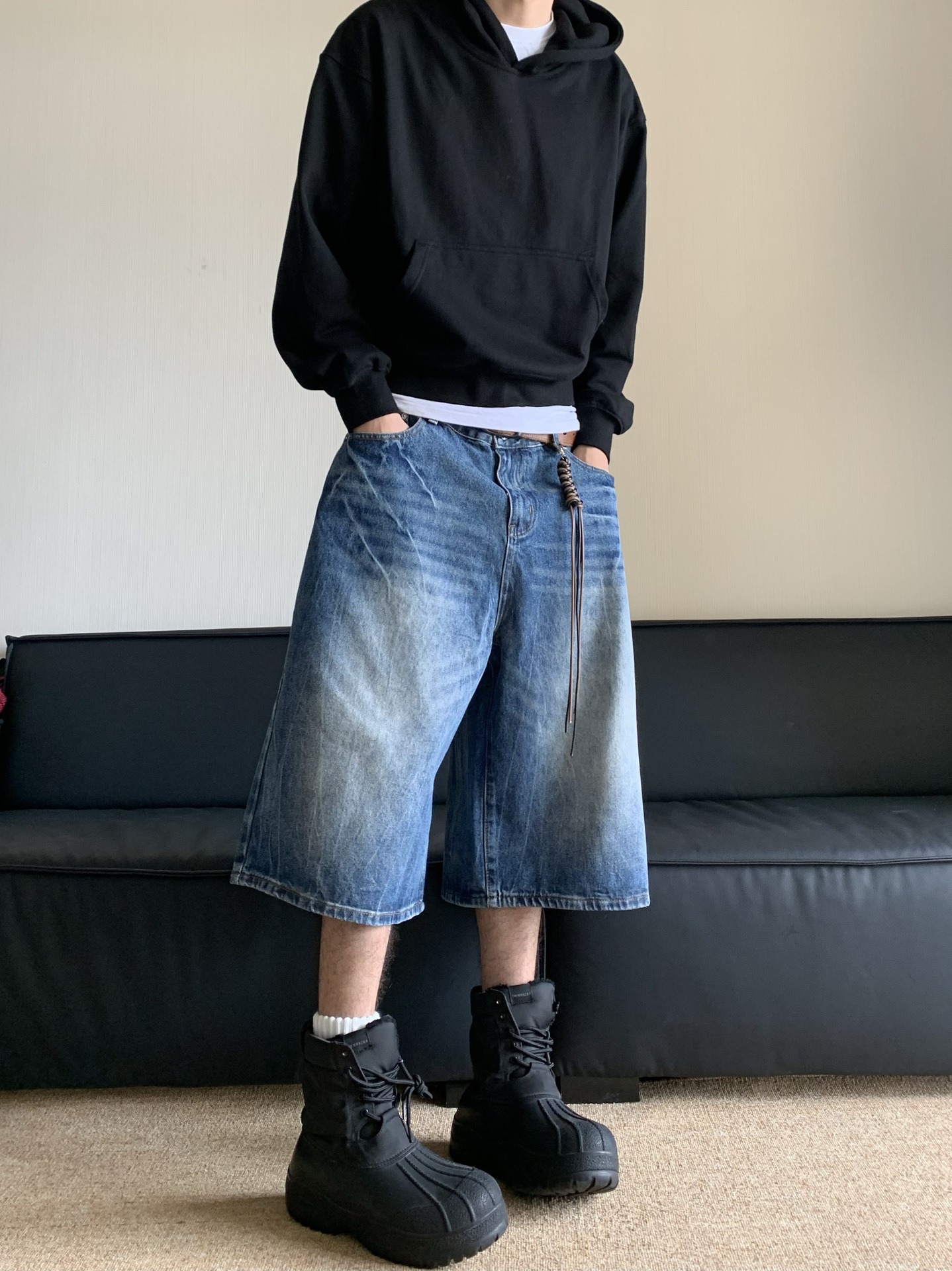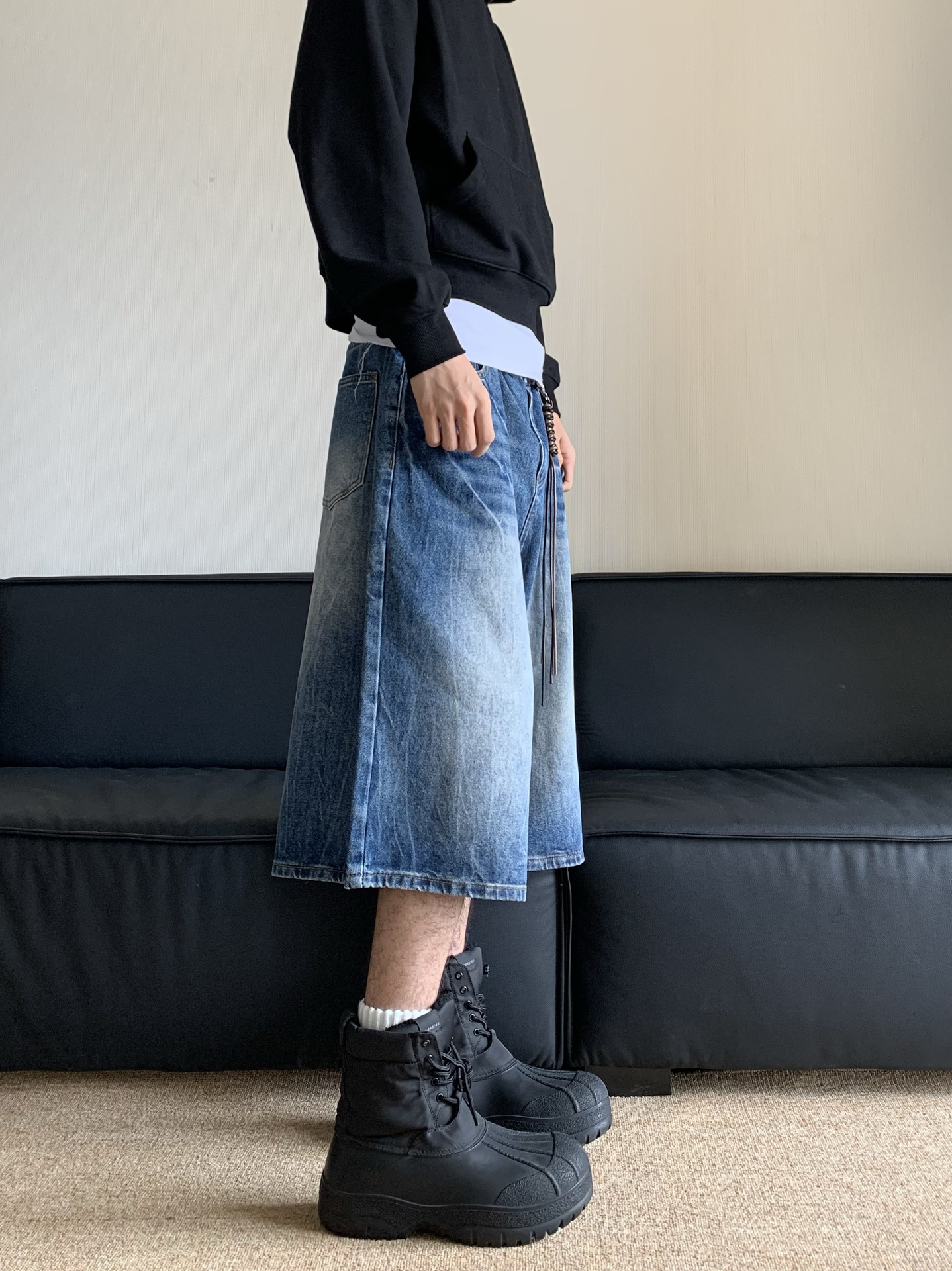 아메리칸 레트로 올드 번개 패턴 스트레이트 데님 반바지 남성 여름 신작 루즈 크롭 팬츠 드레이프 와이드 레그스토어 가기